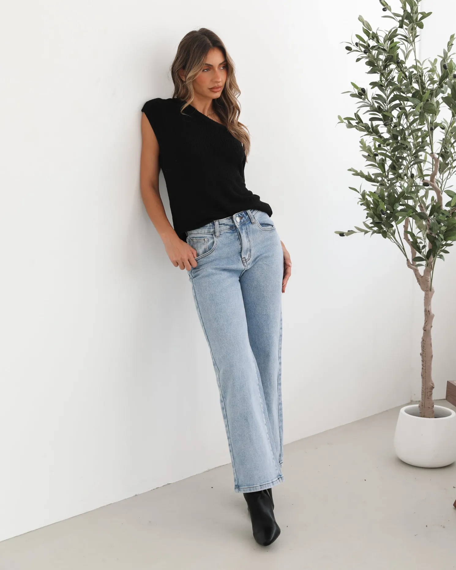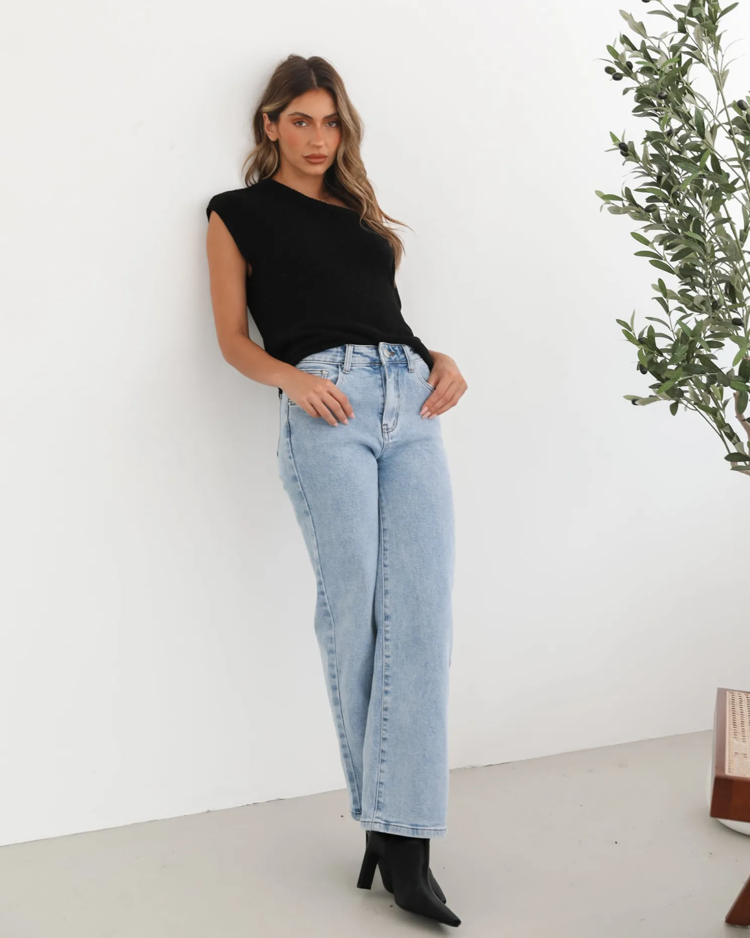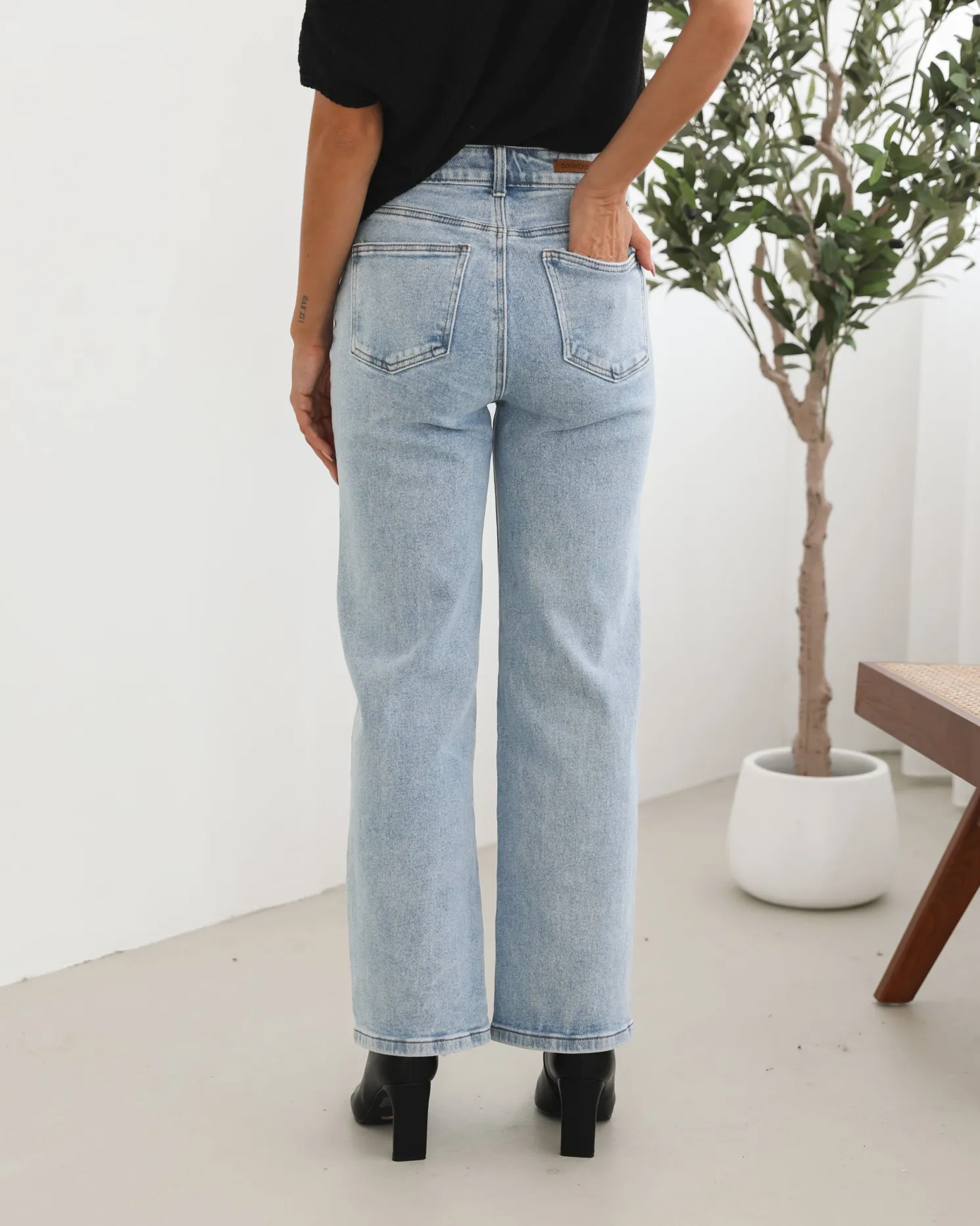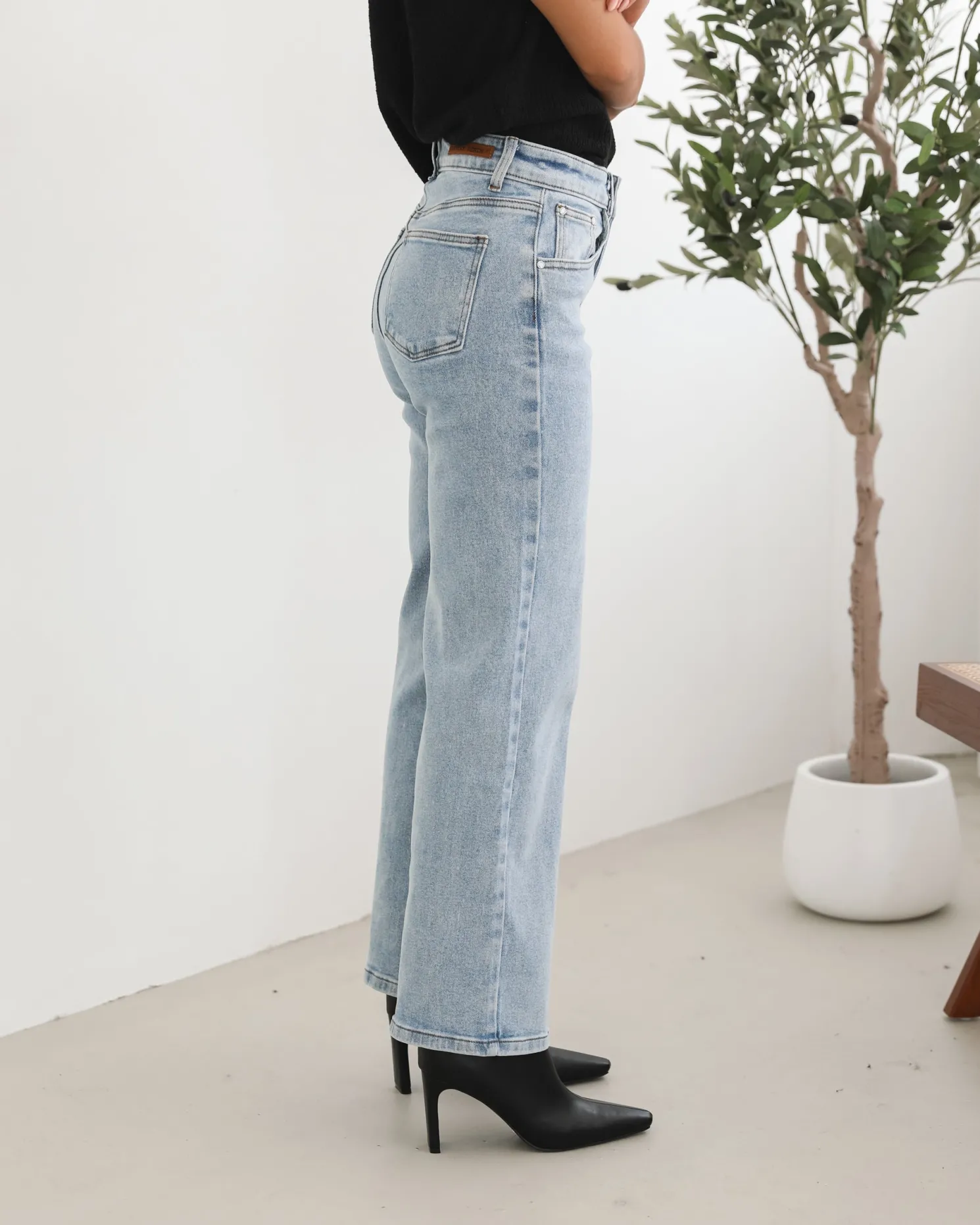 Our Bayley Jeans come in a light blue colour. Step out like you own the sidewalk and elevate your everyday with this pair that features a high-waisted fit, belt loops, pockets, button and quarter zip closure, flared silhouette and ankle length hem. Pair with a crisp white tee and oversized blazer!