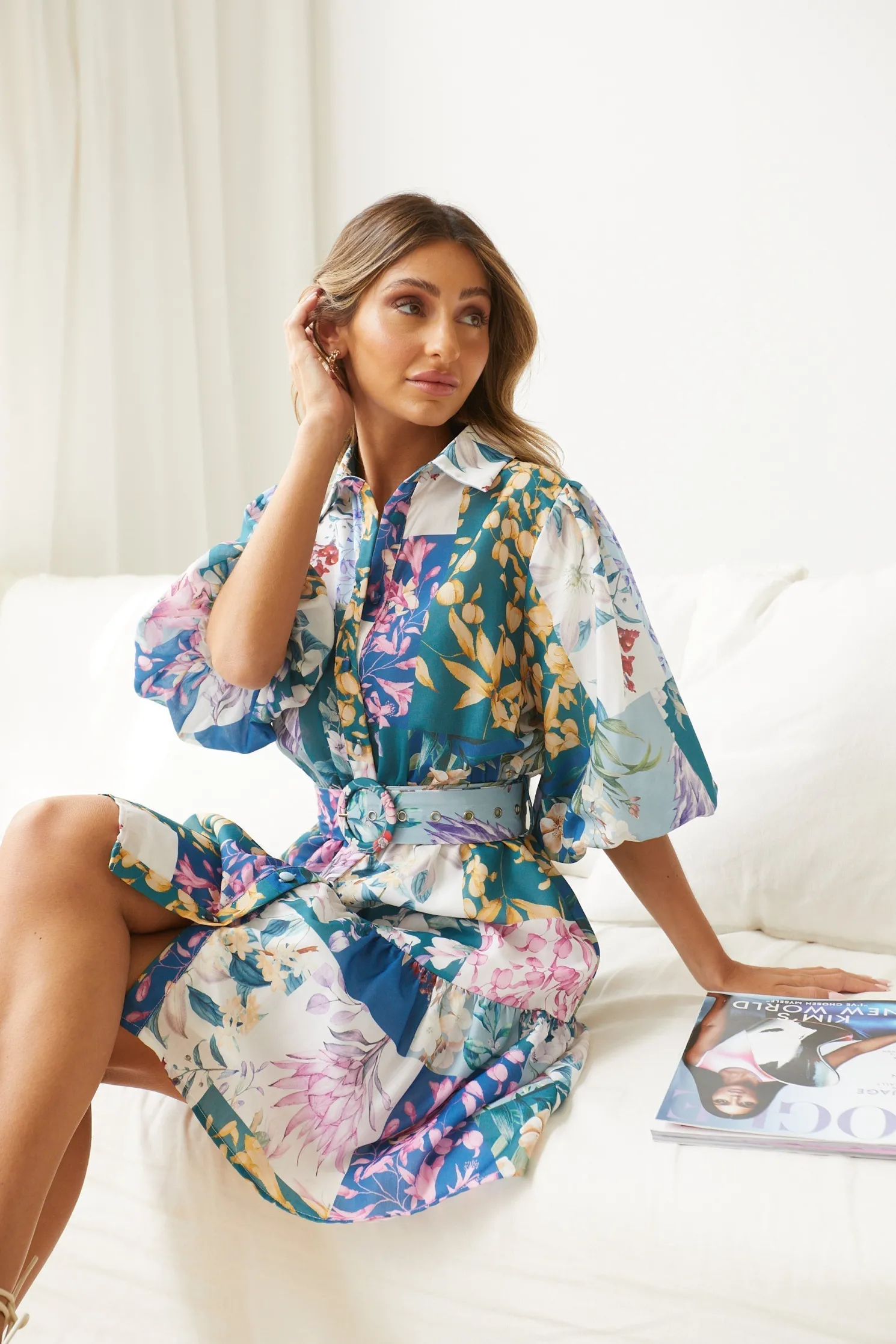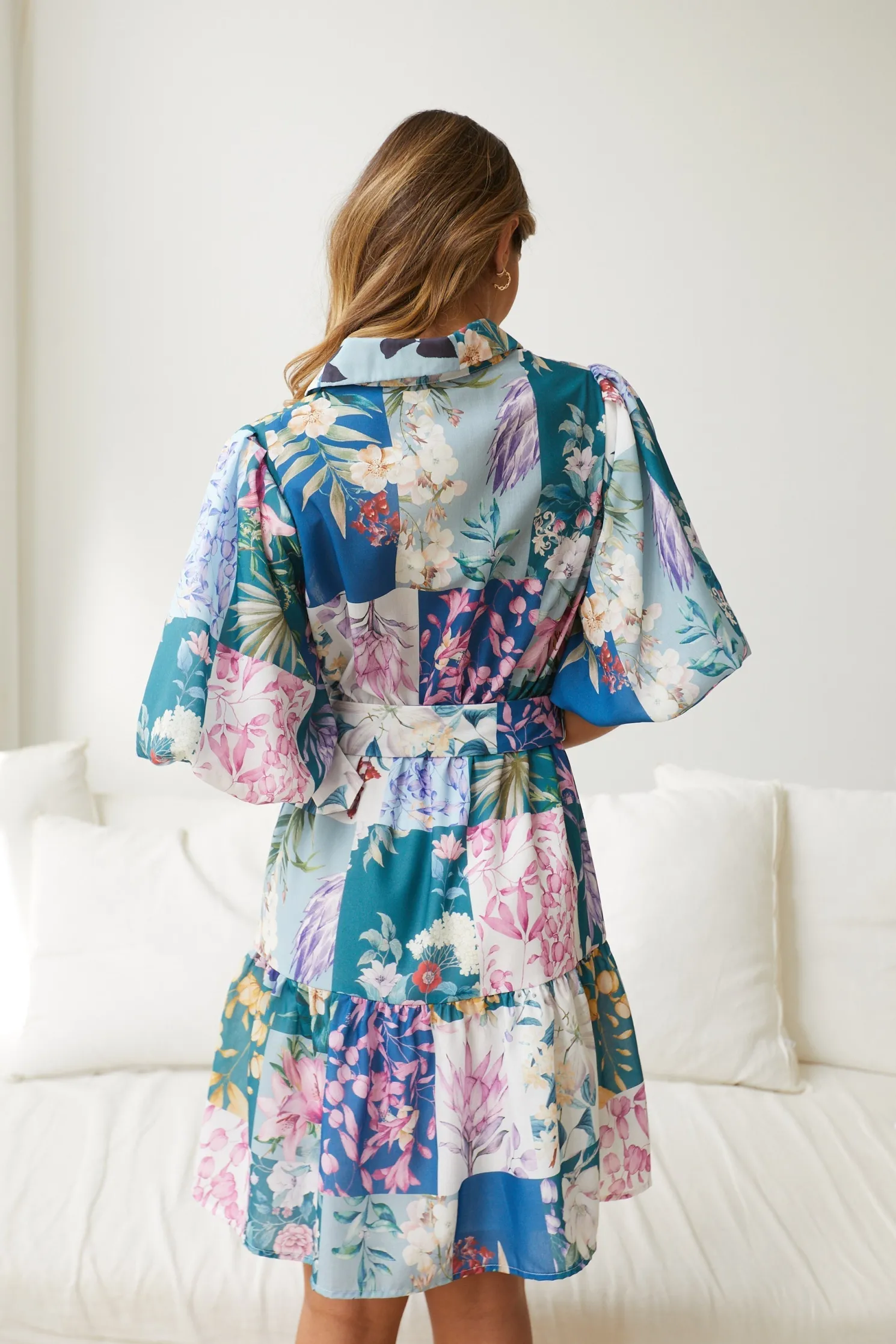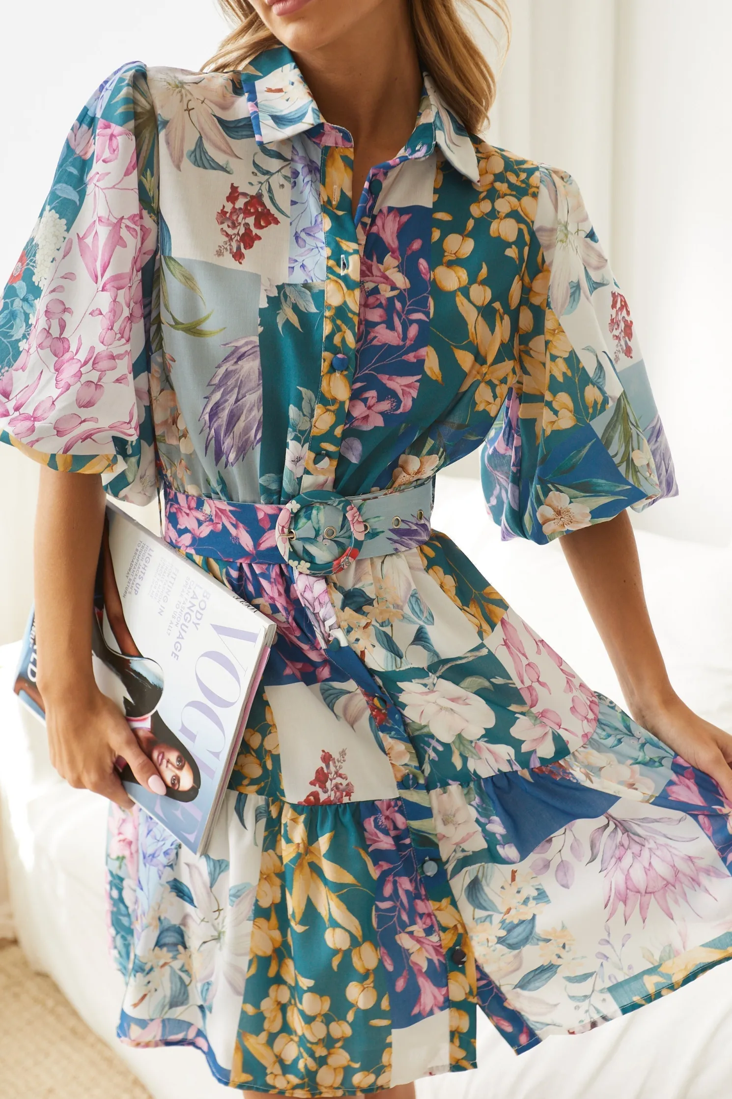 Our Bellarosa Dress comes in a multicoloured floral-patch prints. Delightfully bloom in this lovely mini that will you make you a total sweetheart with its classic collar, centre-front buttons, short balloon sleeves, drop-waist style skirt and belt. Complete your spring look with a fancy sun hat with ribbon and lace up wedges!