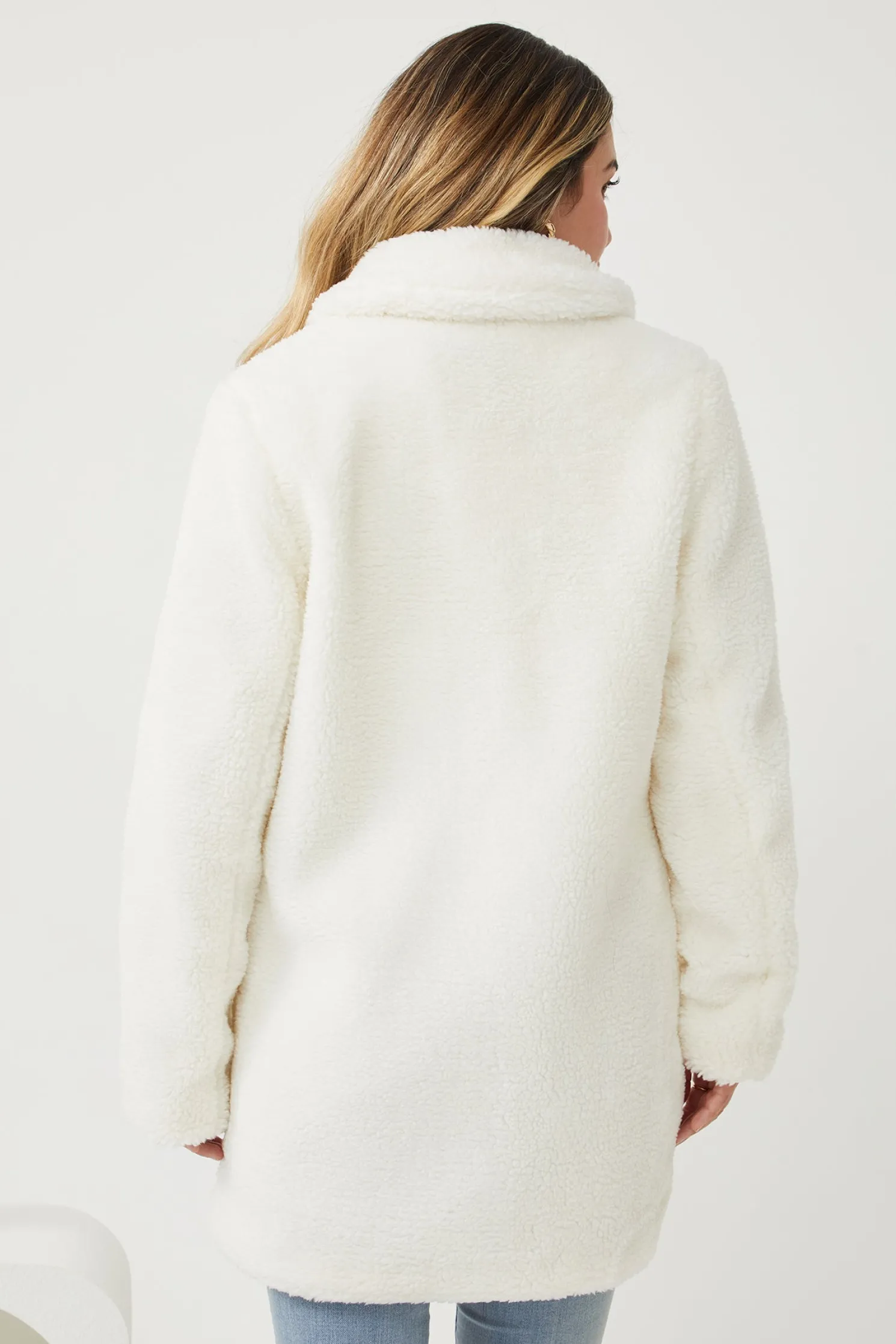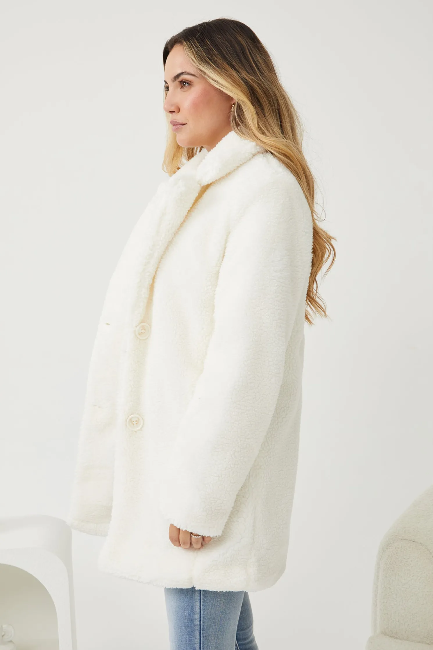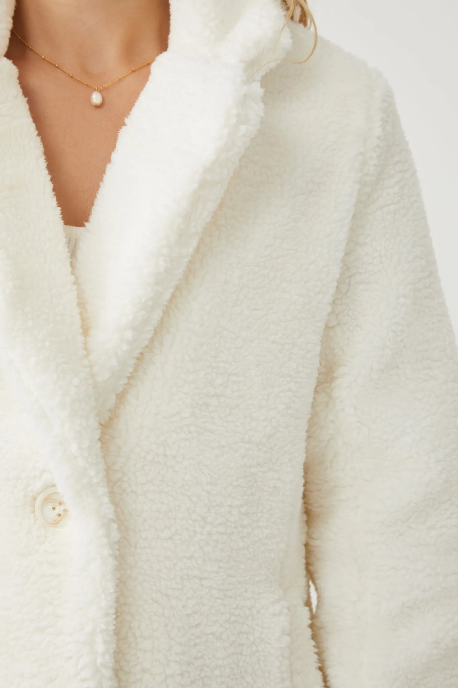 Our Bernie Jacket comes in a soft ivory white tone. It features long, relaxed sleeves and buttons on the front. This warm teddy jacket is the perfect outer layer during the cold winter months!