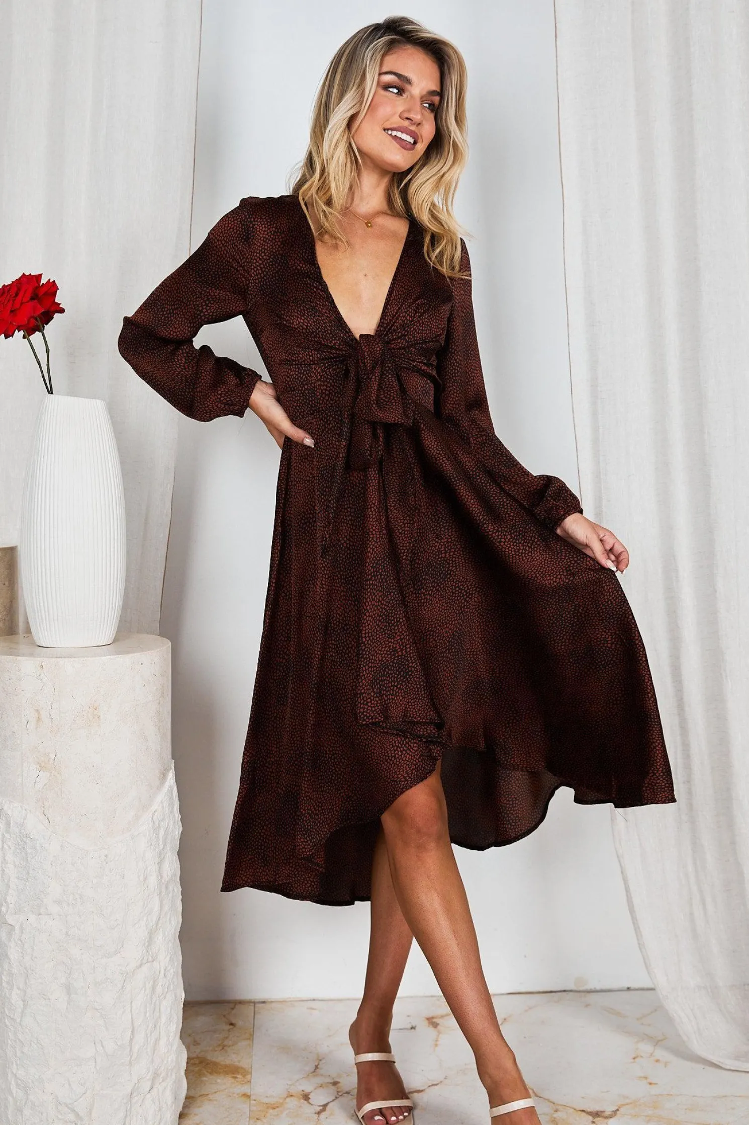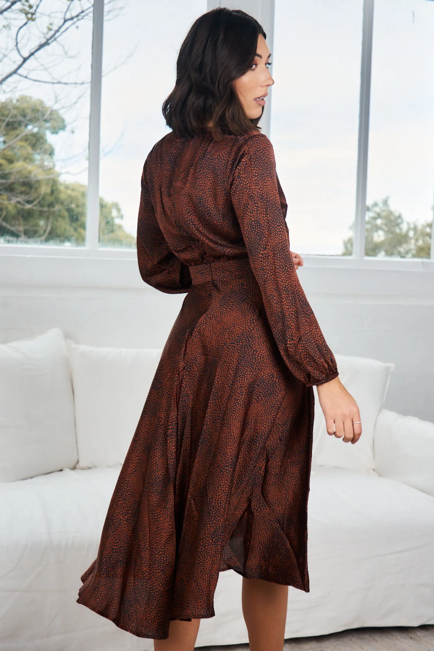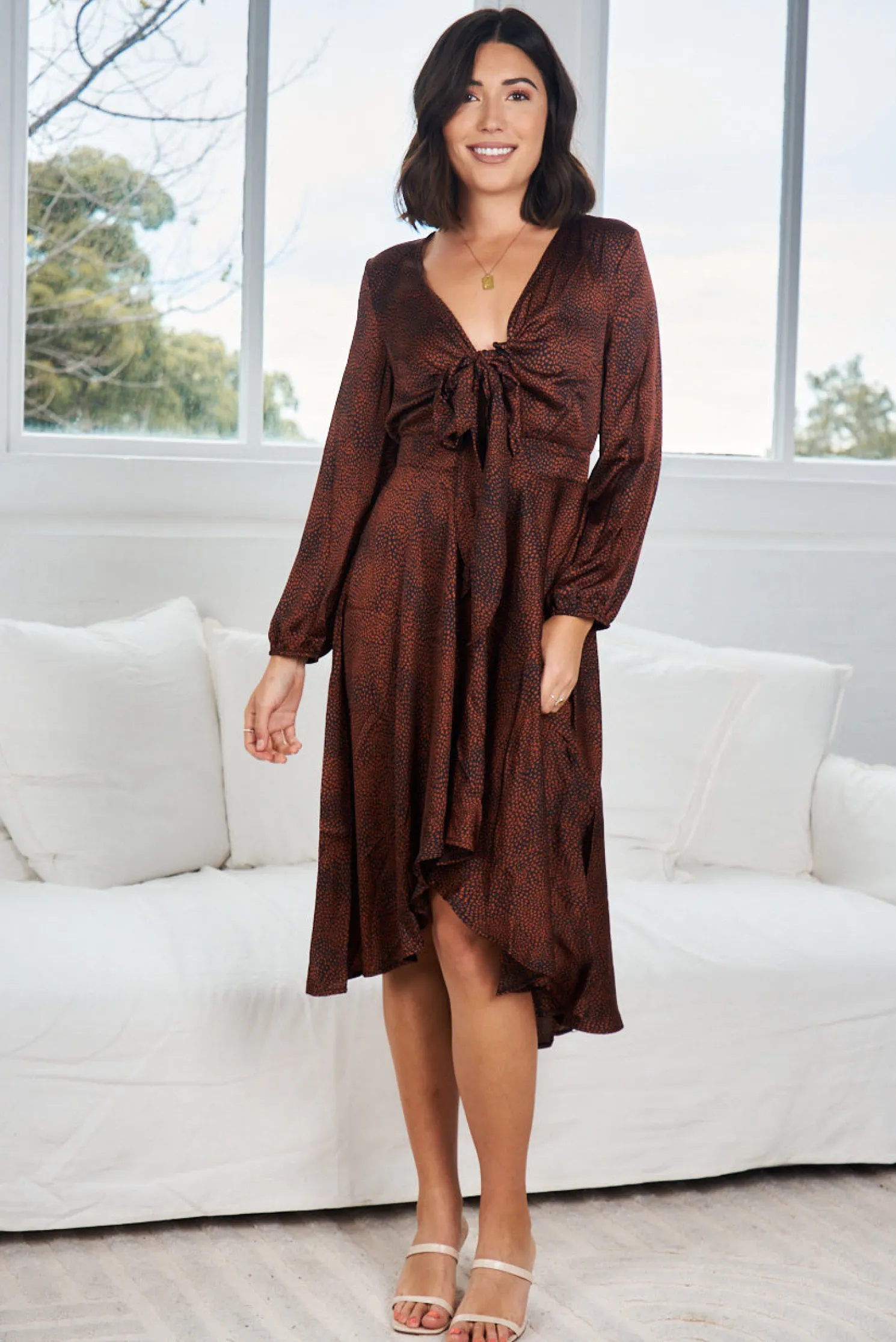 Bryleigh Dress – Bronze Print is exclusive to the Esther the Label Collection Our best selling Bryleigh Dress is back in a demure and sophisticated bronze shade with ink-black print. It’s a gorgeous medium-weight material in a sheen fabric that suggests elegance and poise. The deep v neckline with bust ties is a chic feature with long bishop sleeves that float as your arms move. This standout dress is a relaxed fit with a cinched waist to highlight your gorgeous figure in all the best ways.