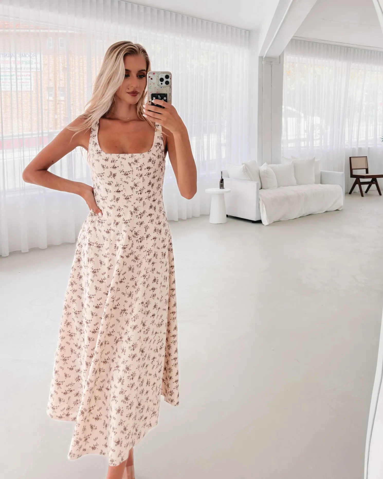 - Key Features: Sleeveless. Soft square neckline. Full skirt. Midi length hem.