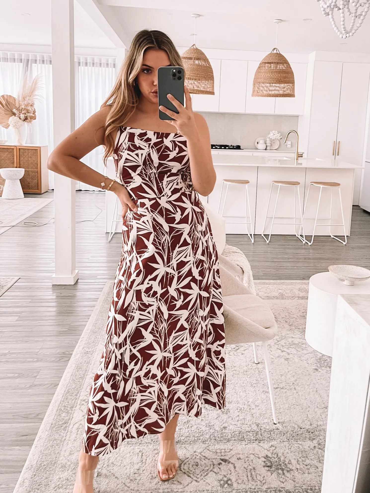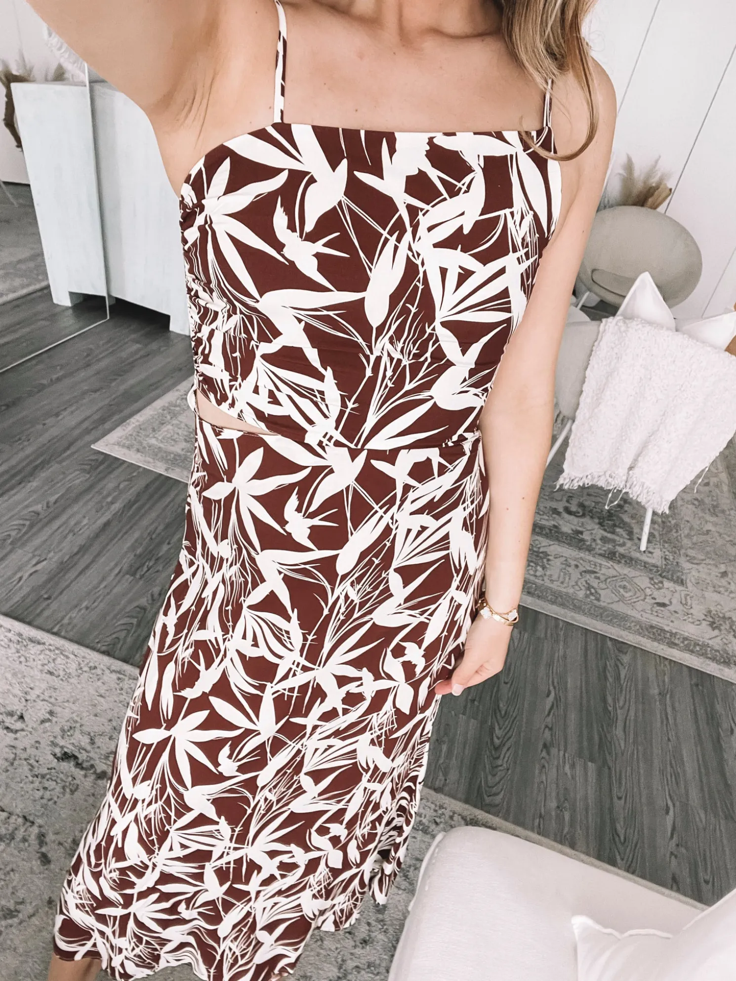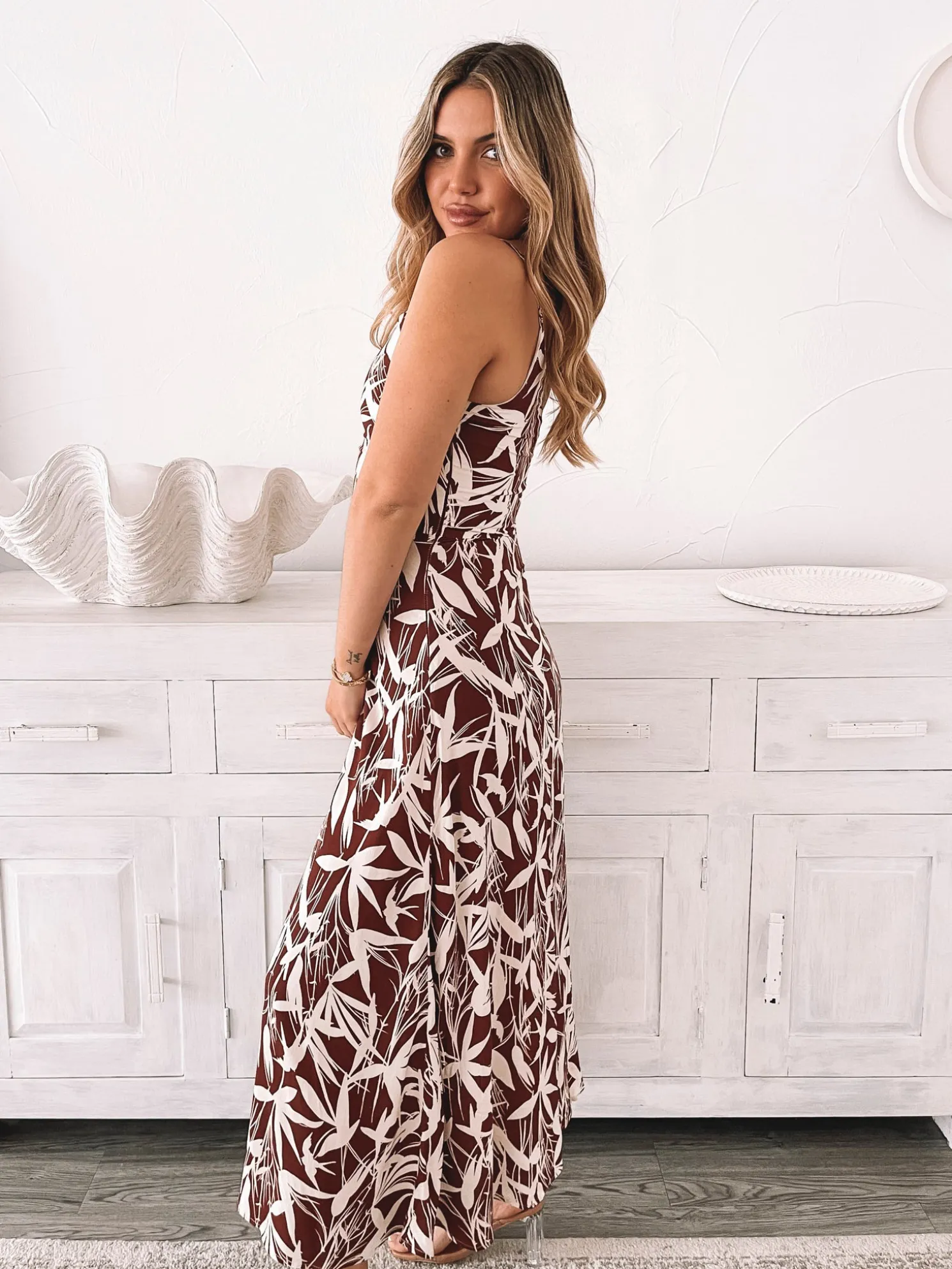 Our Catrice Dress comes in a white base and leaf prints in mocha brown colour. Look like you’re always in fashion week in this midi that features slim straps, asymmetric hemline, side waist cut out and flowy skirt. Match it with gold accessories to glam it up more!
