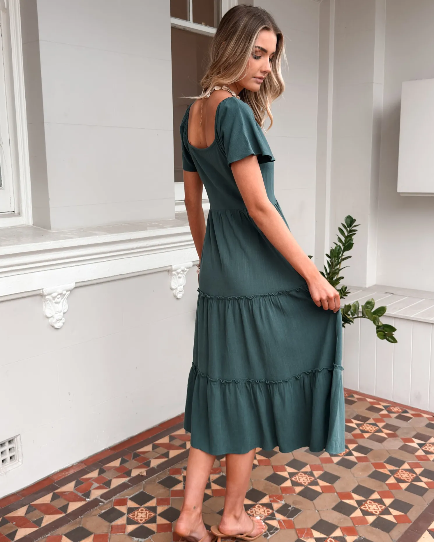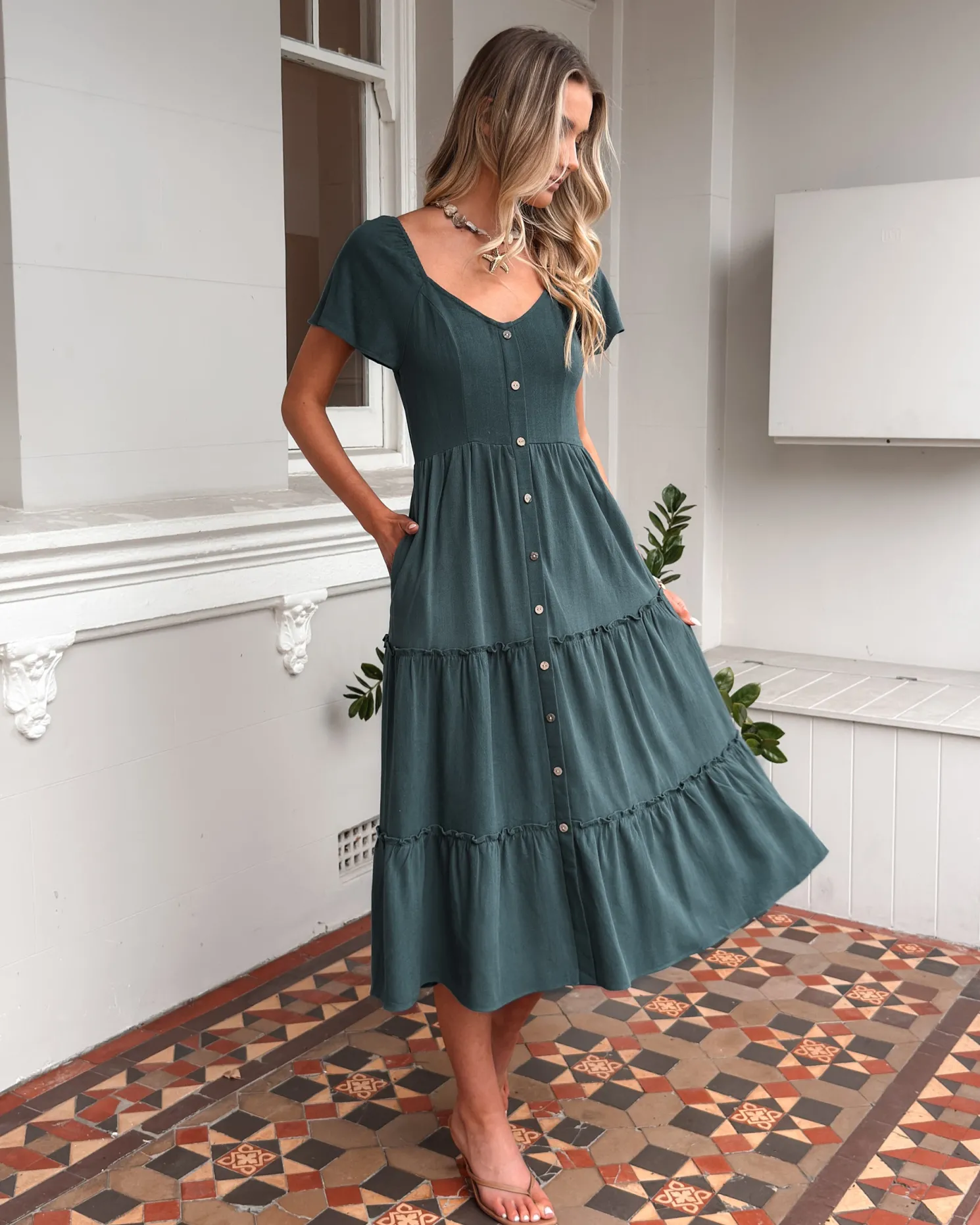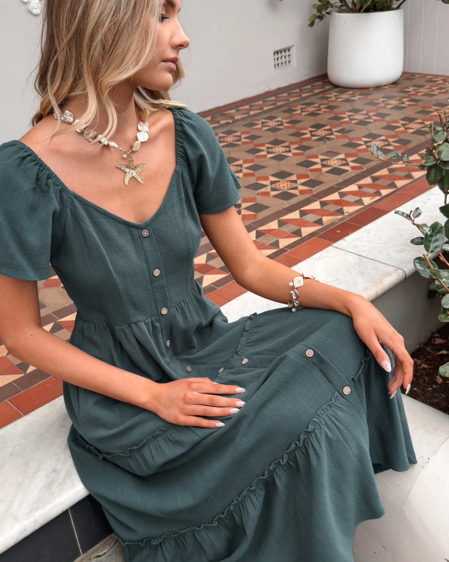 Our Celie Dress comes in a deep green colour. This relaxed midi features a soft V neckline, buttons down the front, elasticated shoulders, and frill detailing on the skirt. This breezy summer staple pairs beautifully with tan sandals and a sunhat.