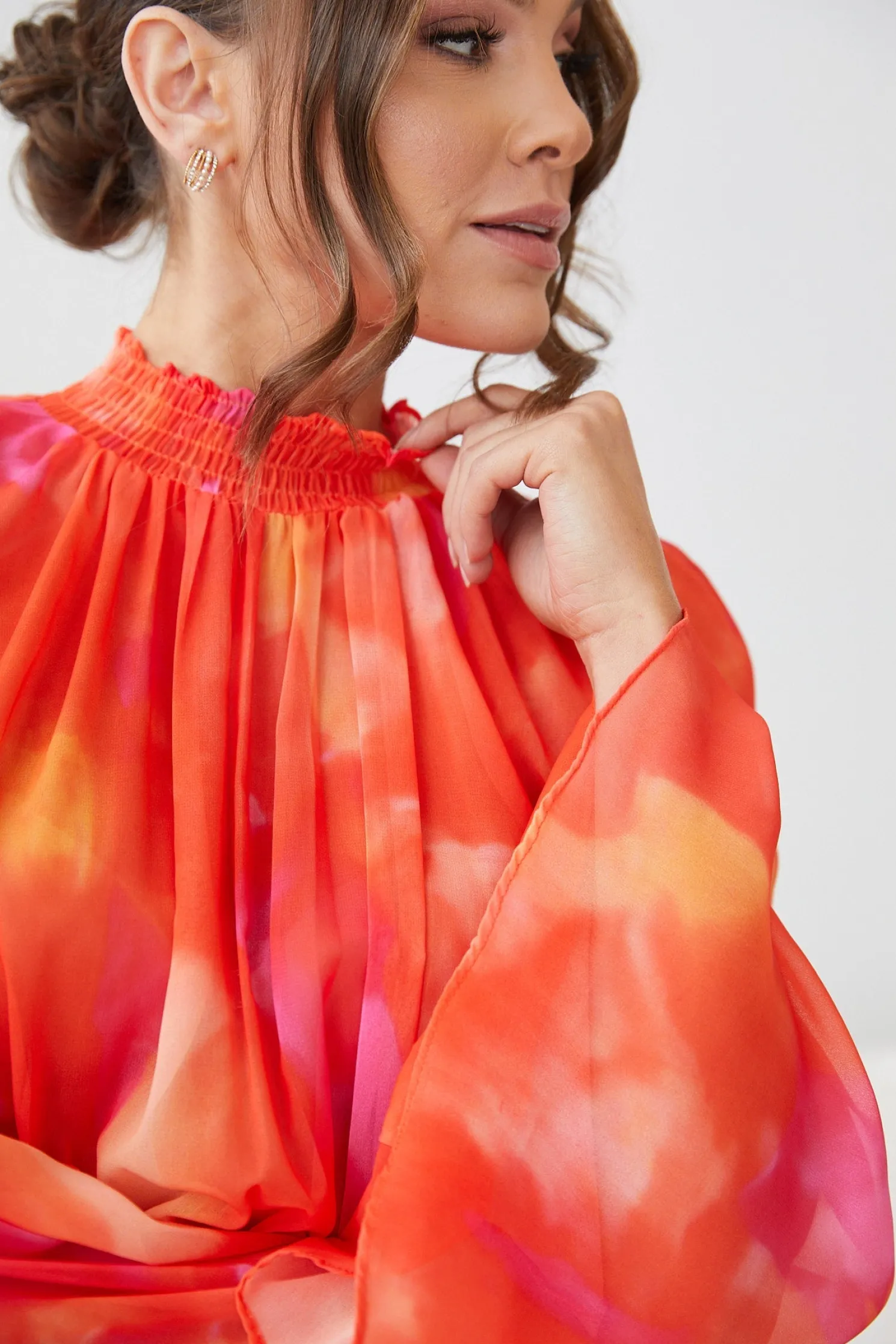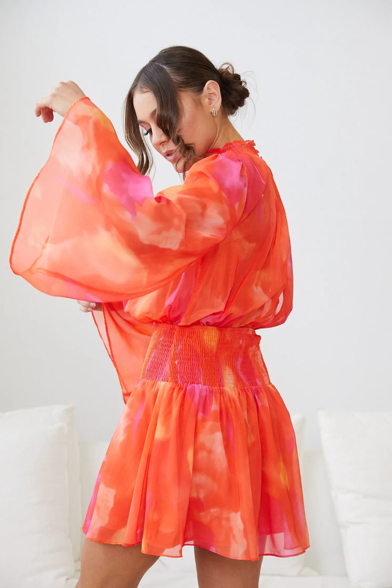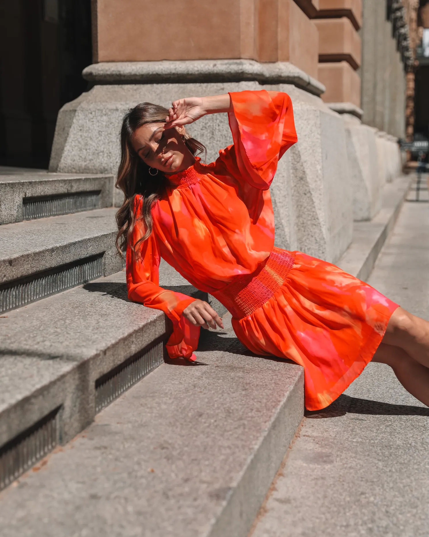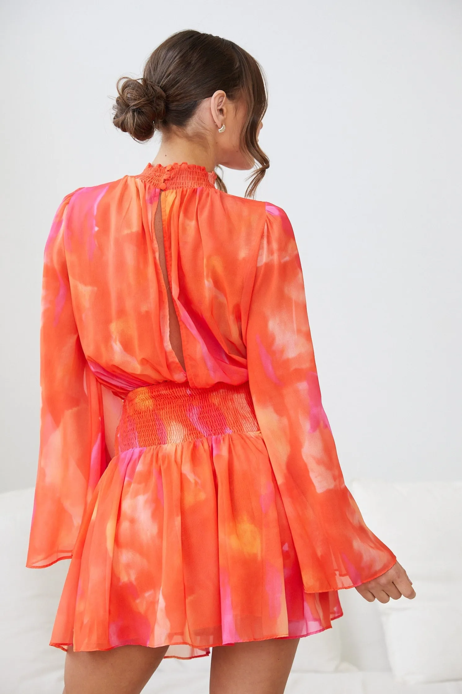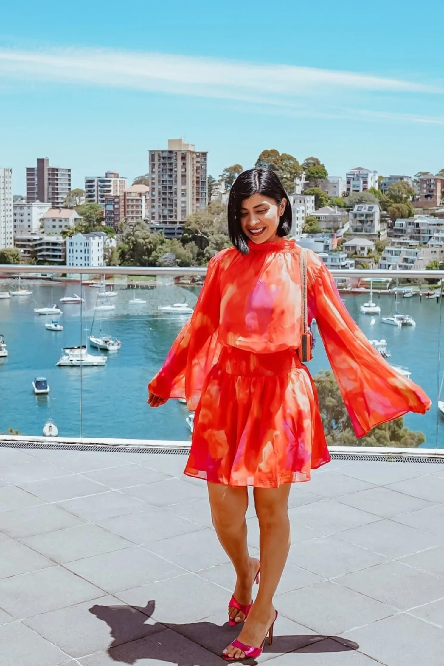 Our Daenerys Dress comes in a bold orange base with red and purple print. Bringing a splash of colour and sexiness to your party wardrobe, this mini features a high neckline, long trumpet sleeves, gathered and smock detailing on the bodice, collar and waist. Channel your fun andexpressive self by pairing this with a neonshade open heels and antique earrings!