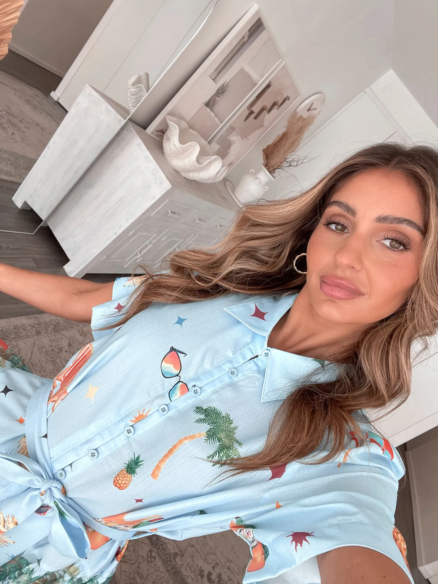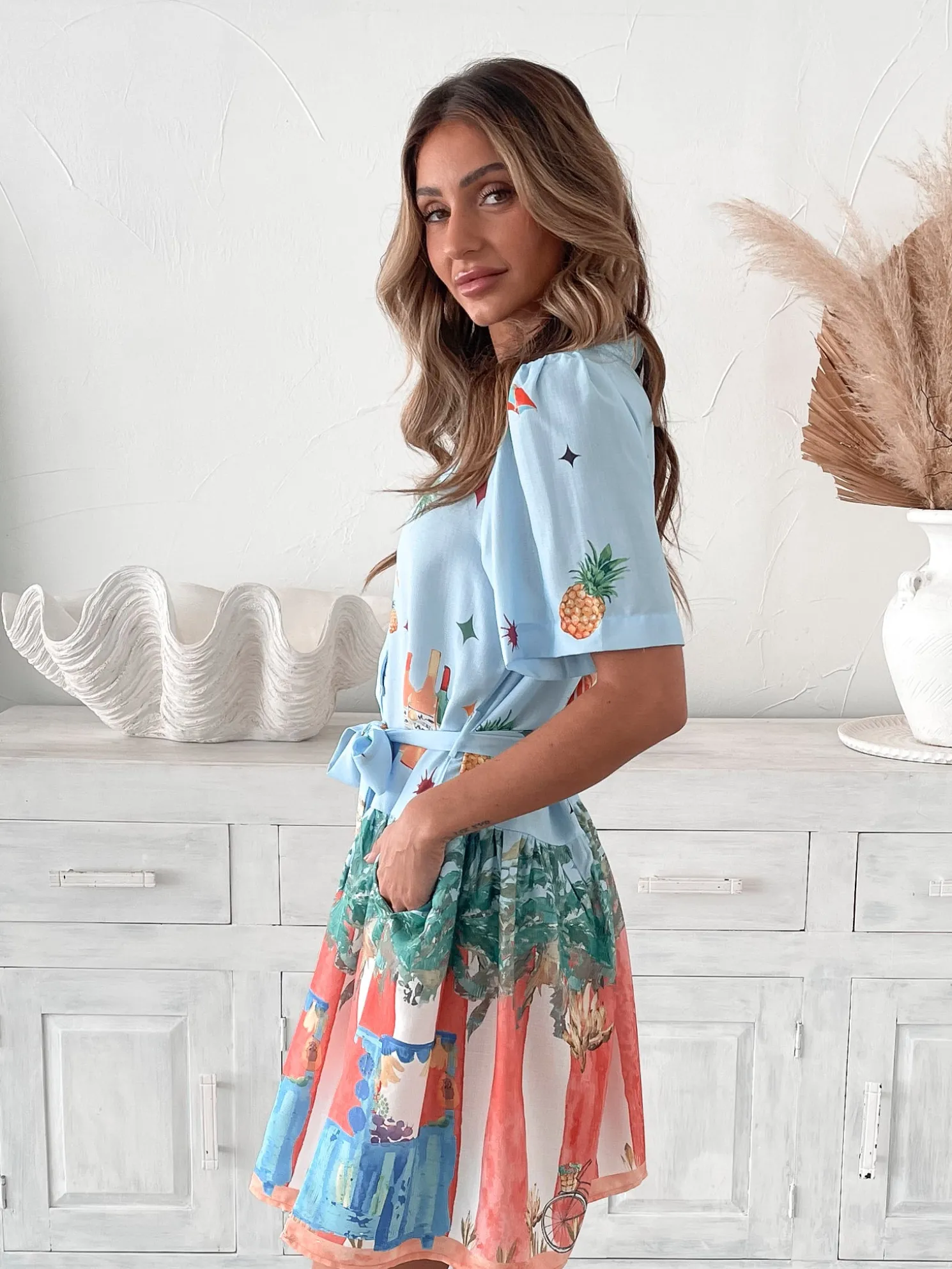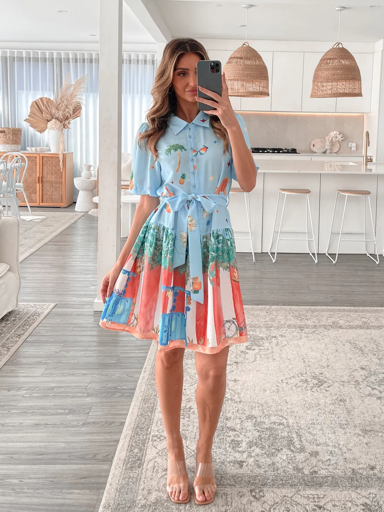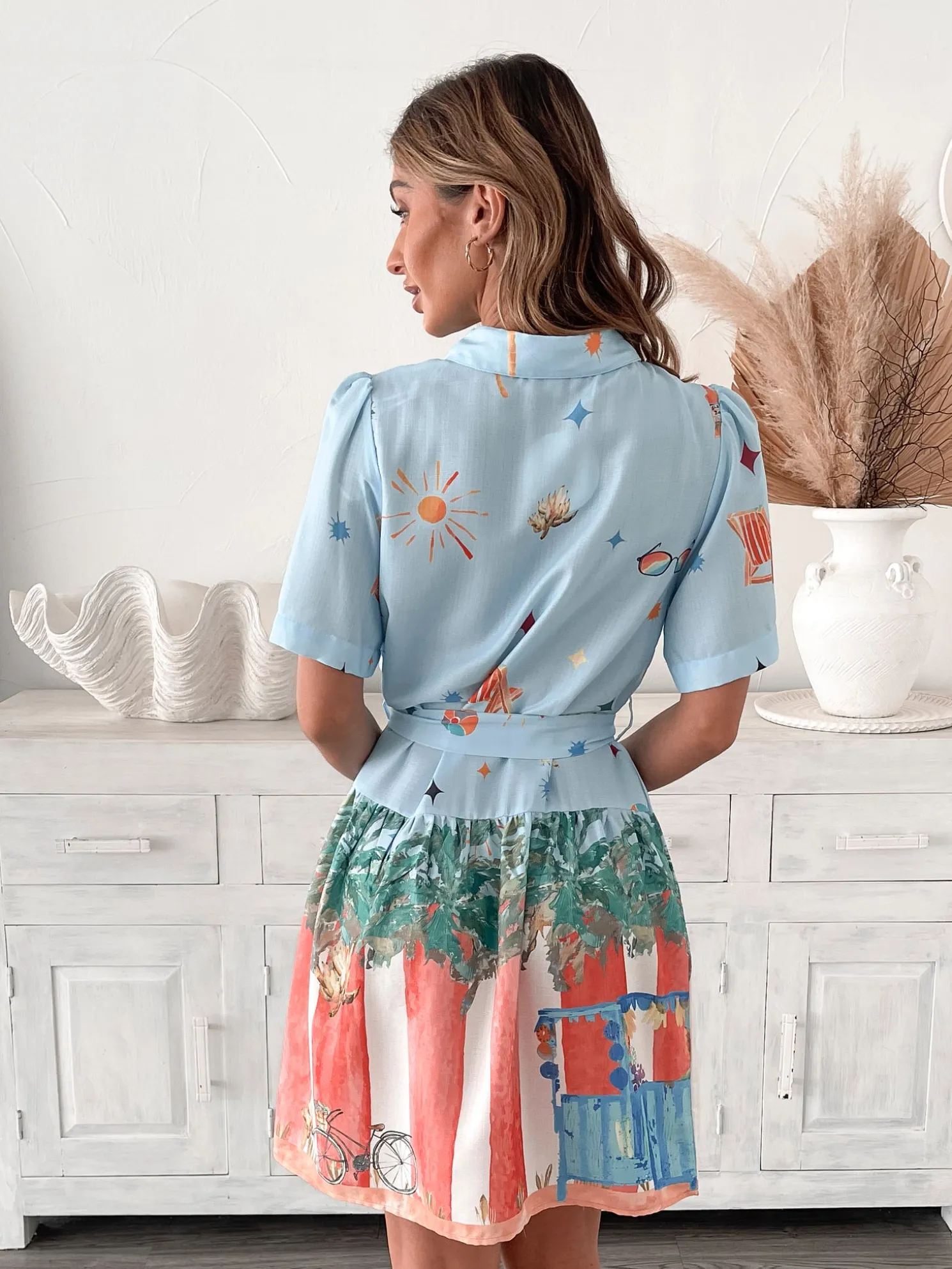 Our Dakoda Dress comes in a beautiful blue base with multicoloured prints. Bursting with fun patterns and boundless charm, this staple features a shirt collar, centre-front buttons, short sleeves, waist tie, a-line skirt and mini length hem. Pair it with a unique bag for when you’re feeling a little adventurous!