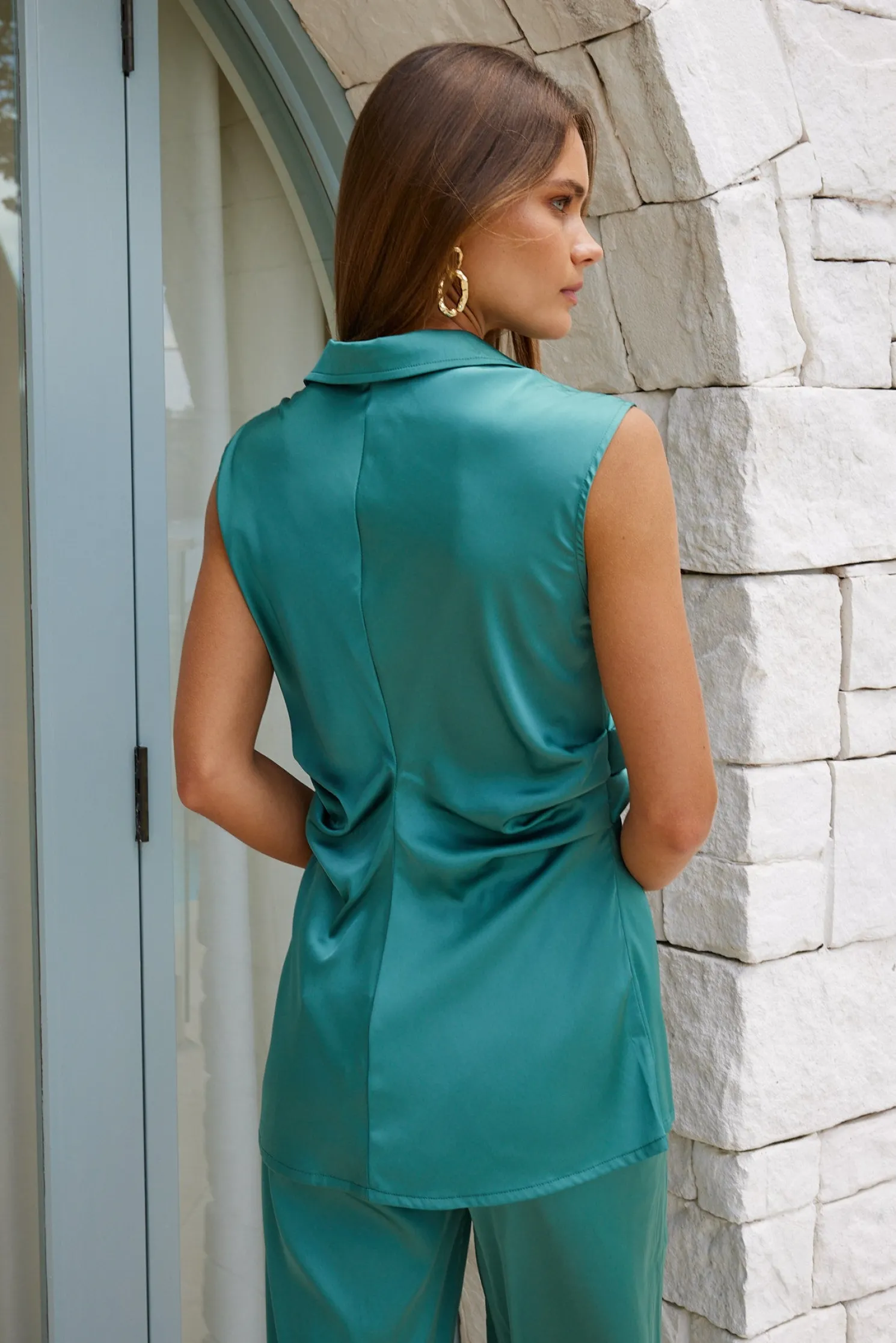 Our Darnella Top comes in agreen colour. Simple but impressive, this staple is sleeveless and is designed with a shirt collar, centre-front buttons and gathering on the sides. Pair with straight fit pants and block heels!