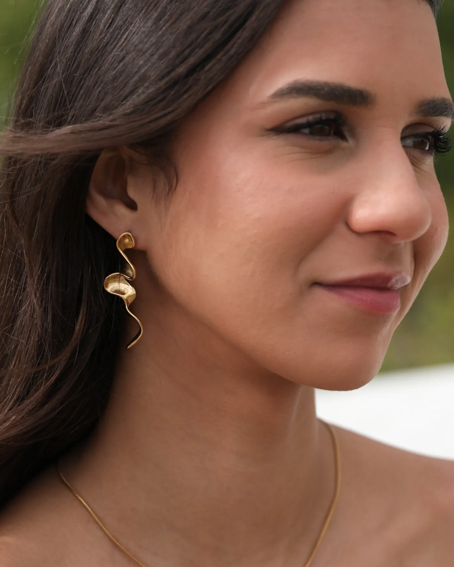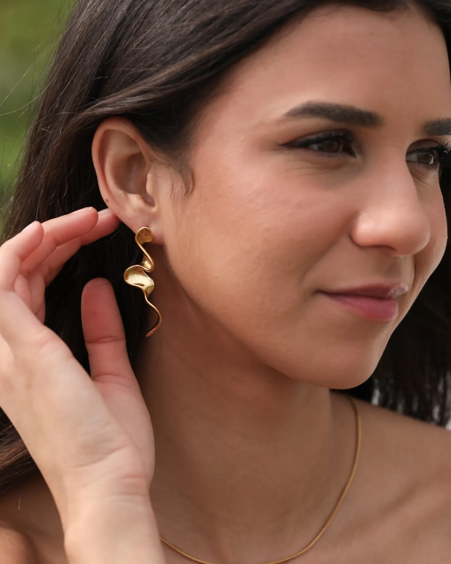 Our Deia Earrings come in a gold colour. Inspired by the natural flow of motion, this jewellery brings a sense of refined luxury and modern artistry to your look. Match it with a flowy dress and soft curls!