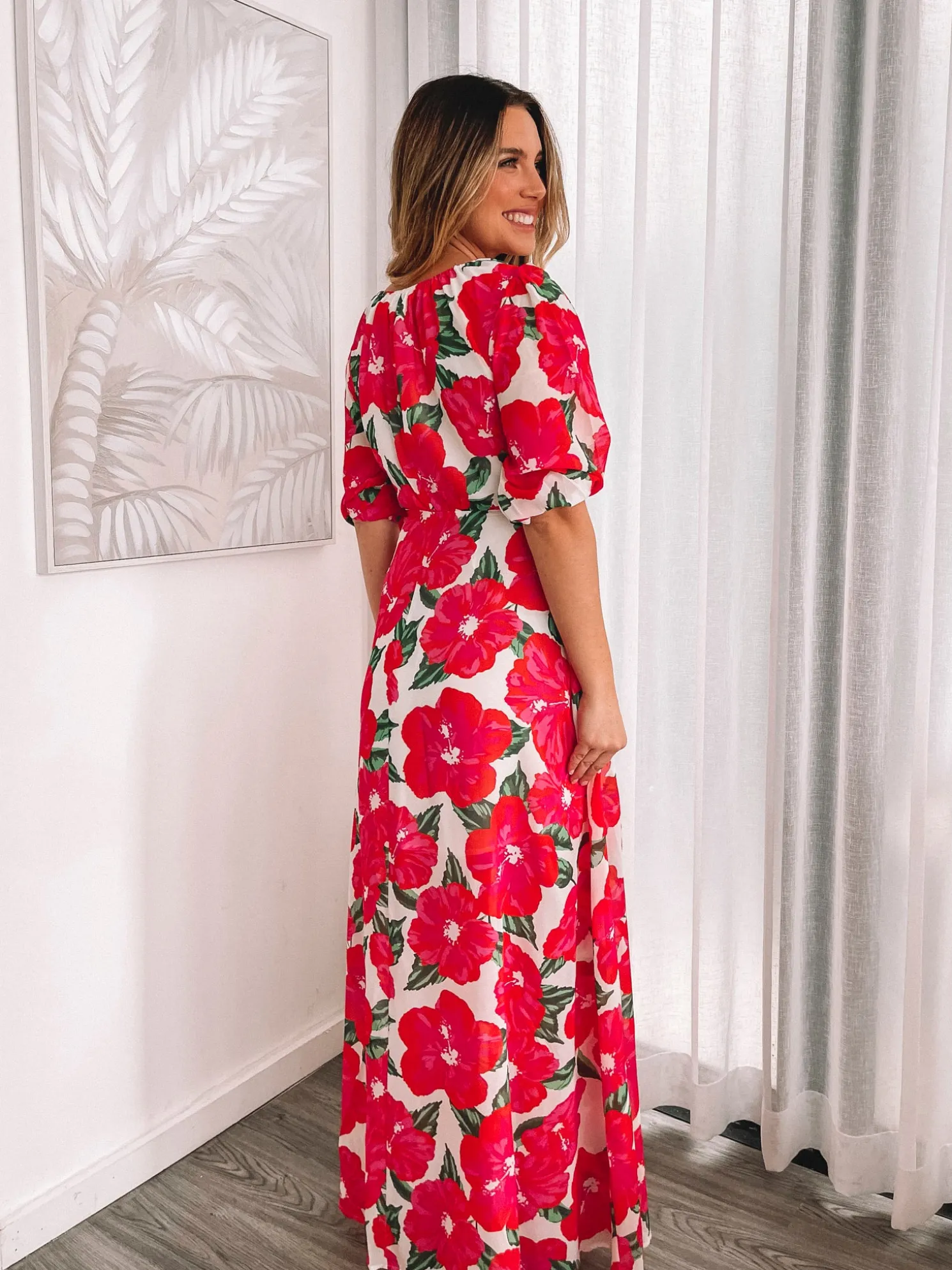 Our Delarina Dress comes in a white base with floral prints in pink colour. A feminine charm for your summer festivities, this maxi is designed with a v-neckline, cut out on the waist, puff sleeves and a-line skirt with a slit. Style with gladiator heels!