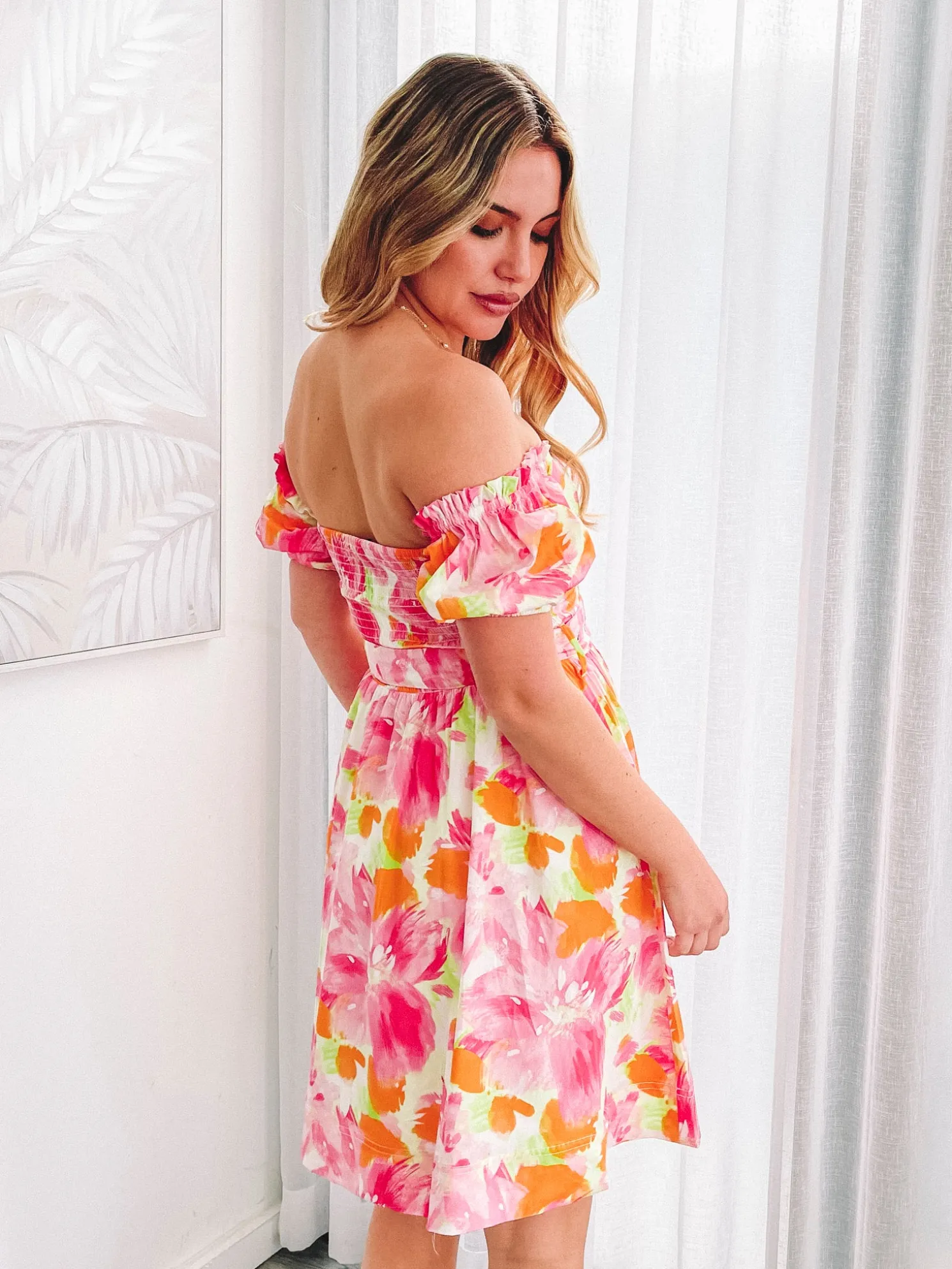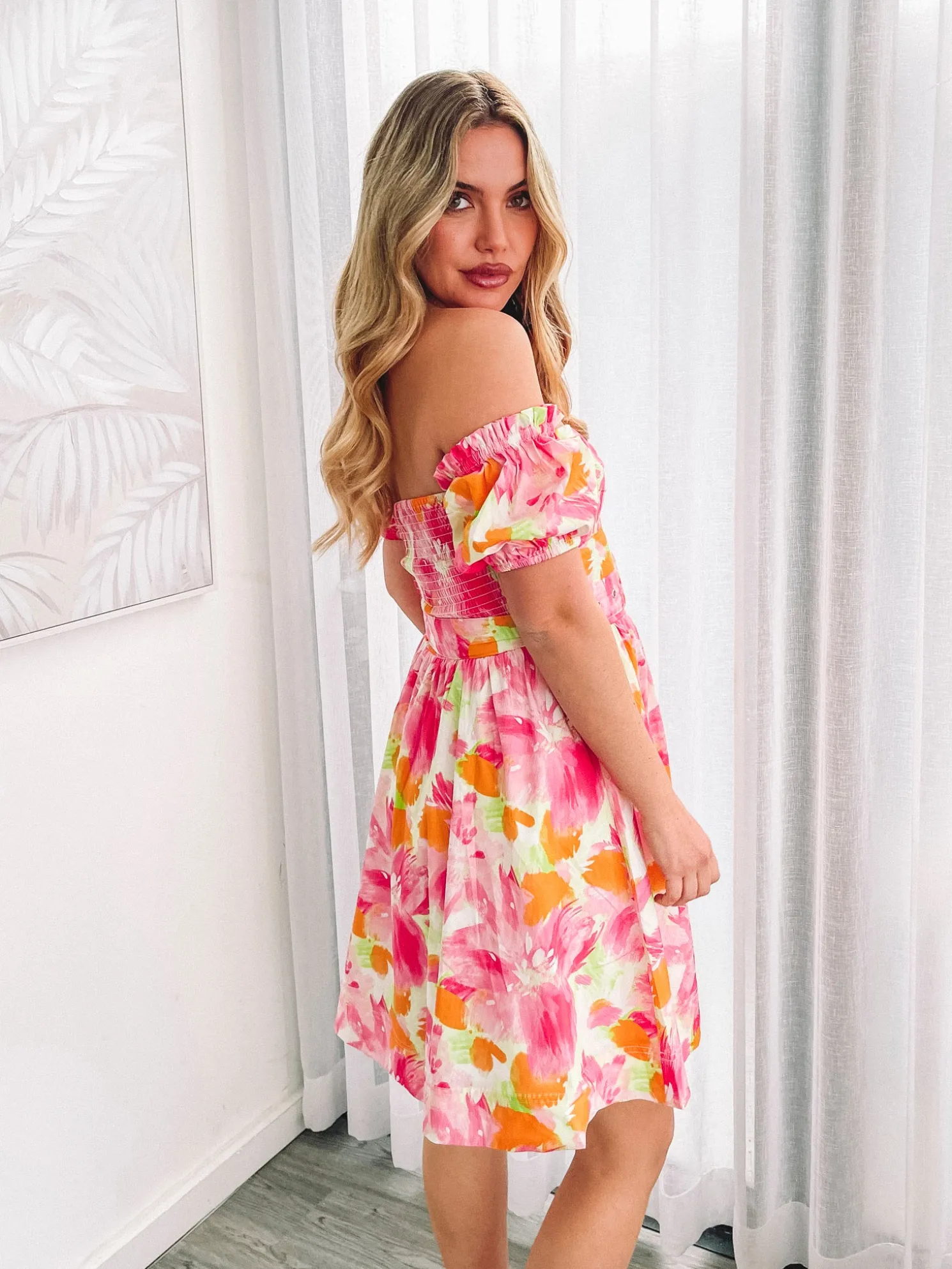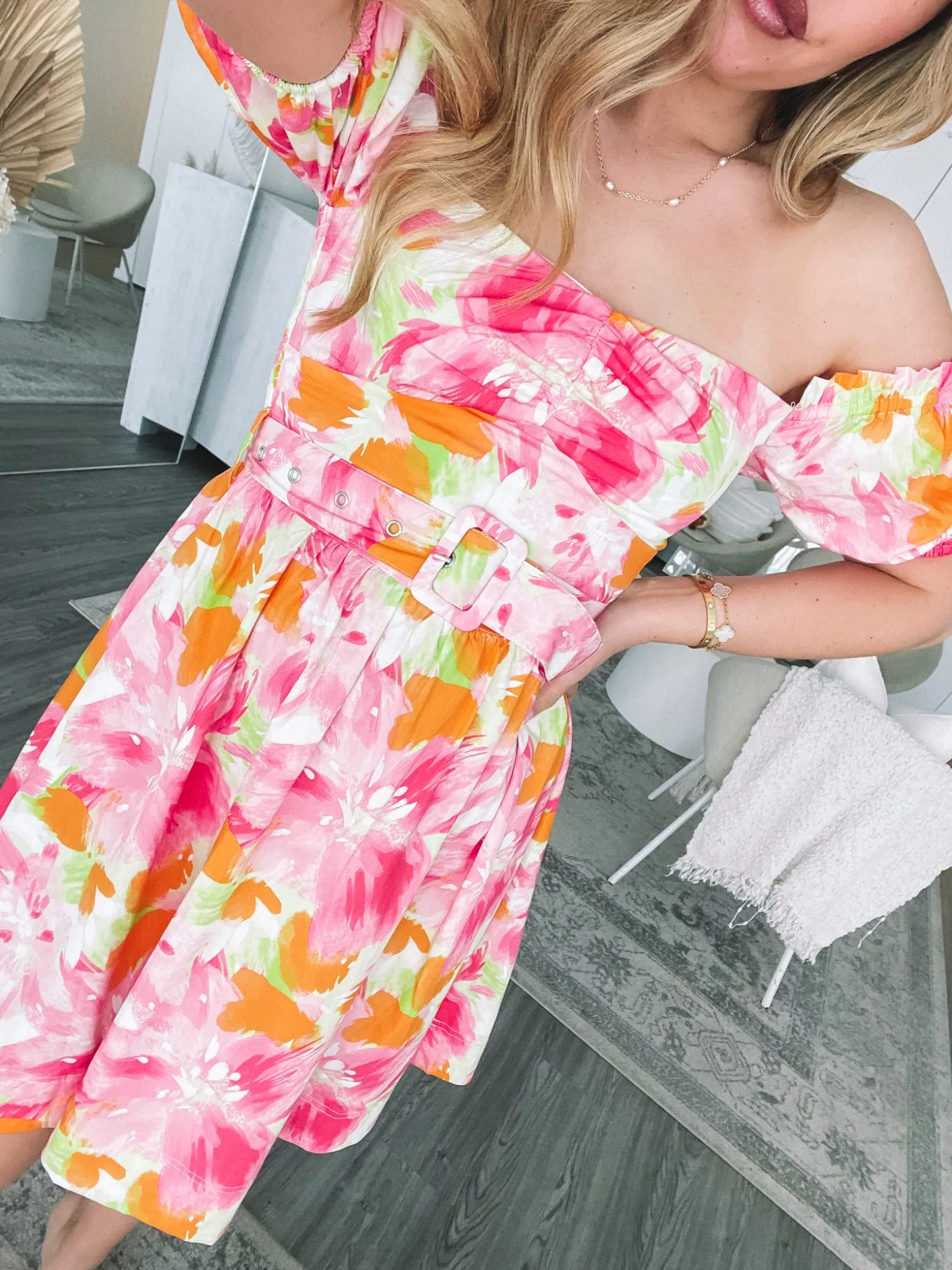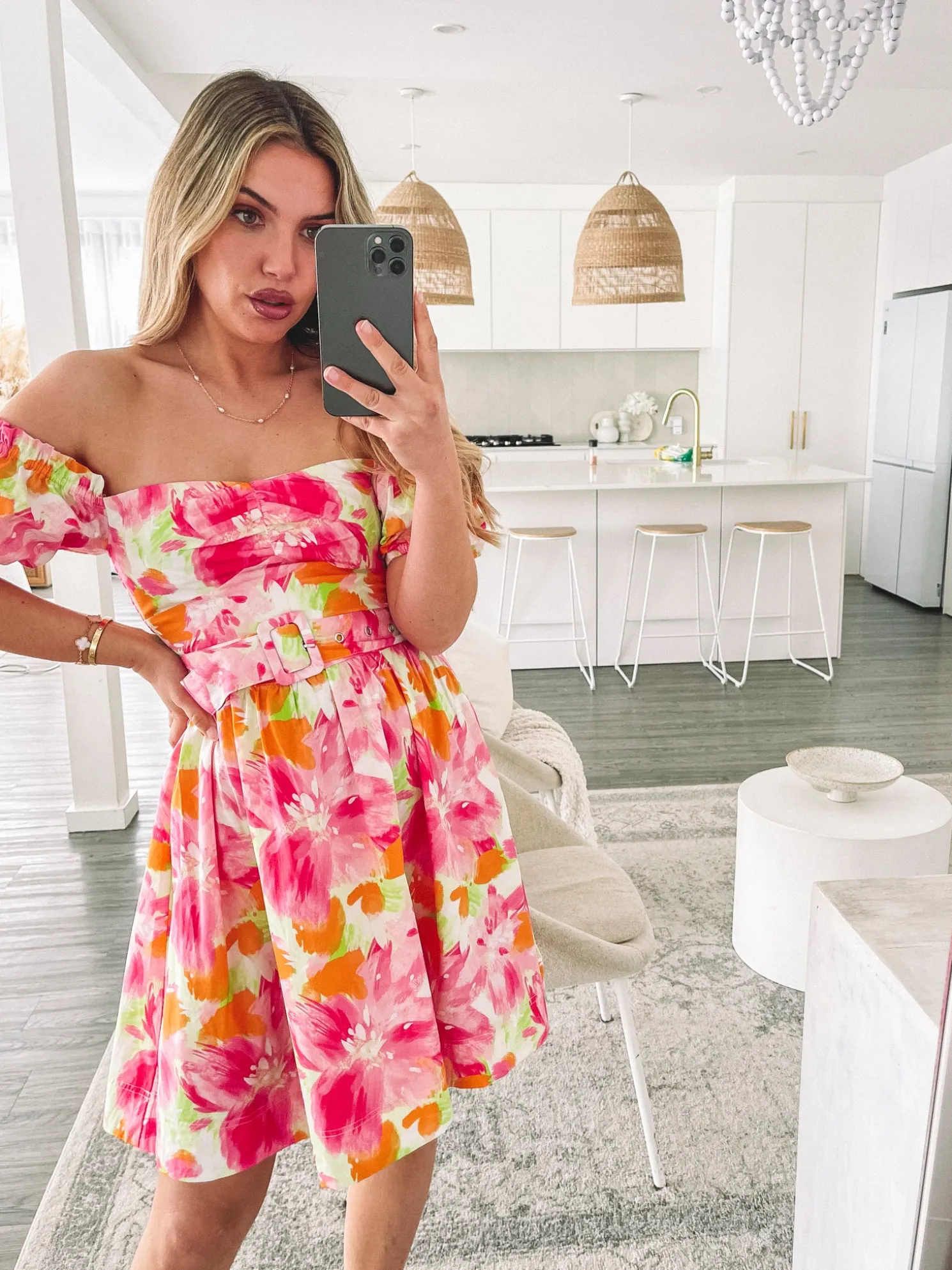 Our Devira Dress comes in a white base with multicoloured prints. A great spring style, this number is designed with an off shoulder neckline, short sleeves, waist belt and flowy skirt. Match with a classy clutch bag!