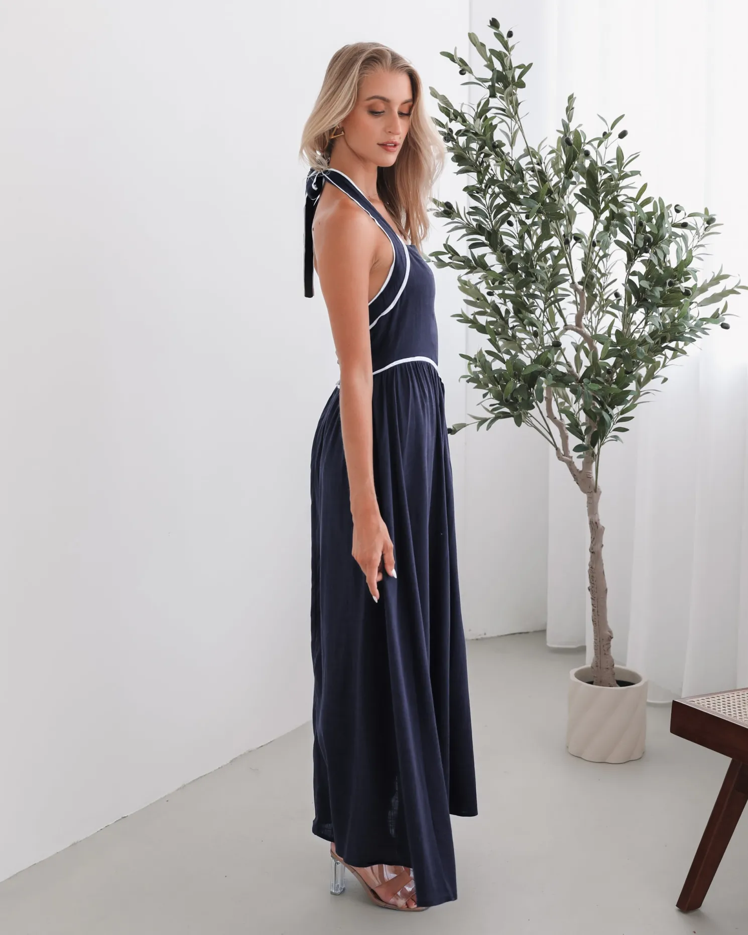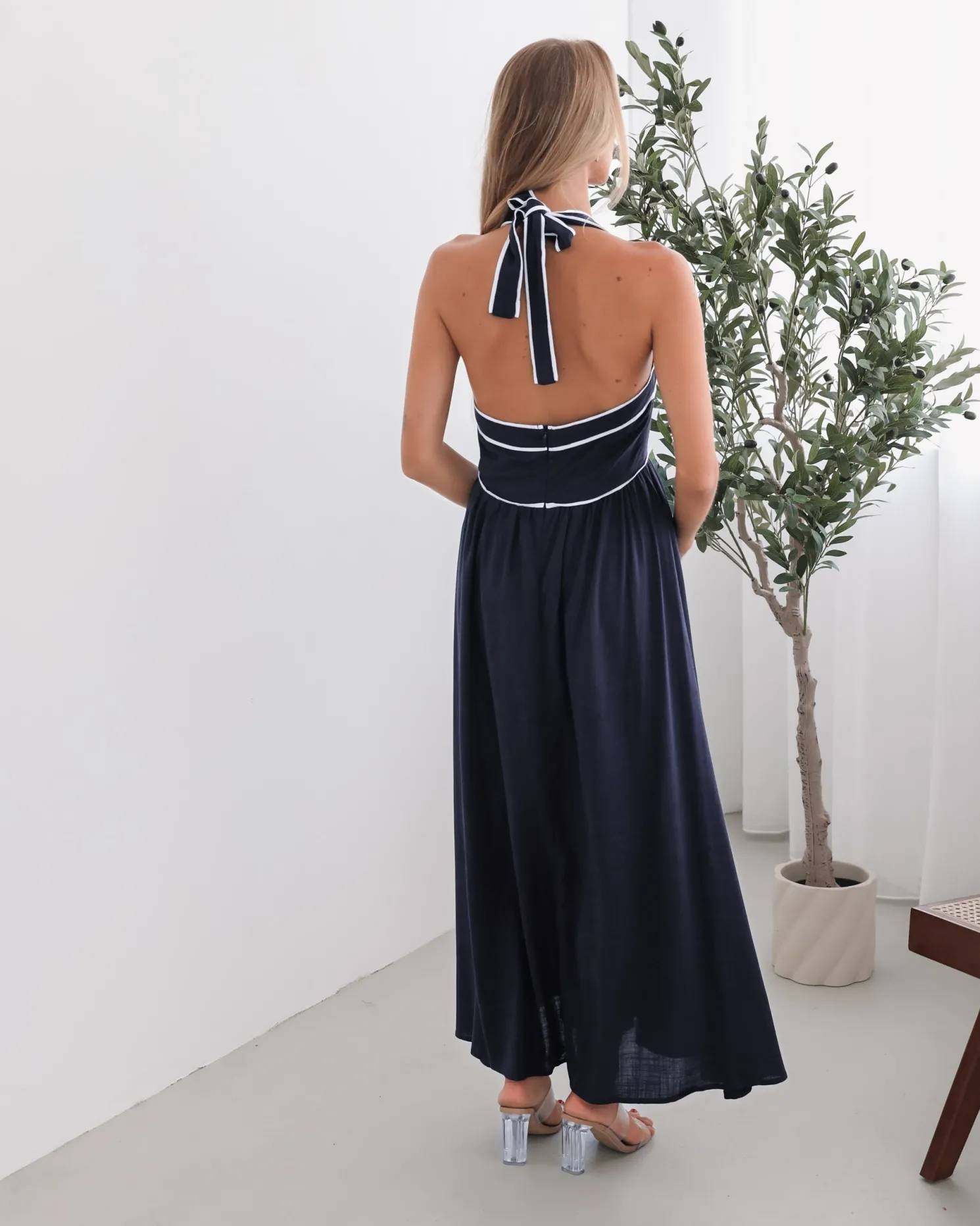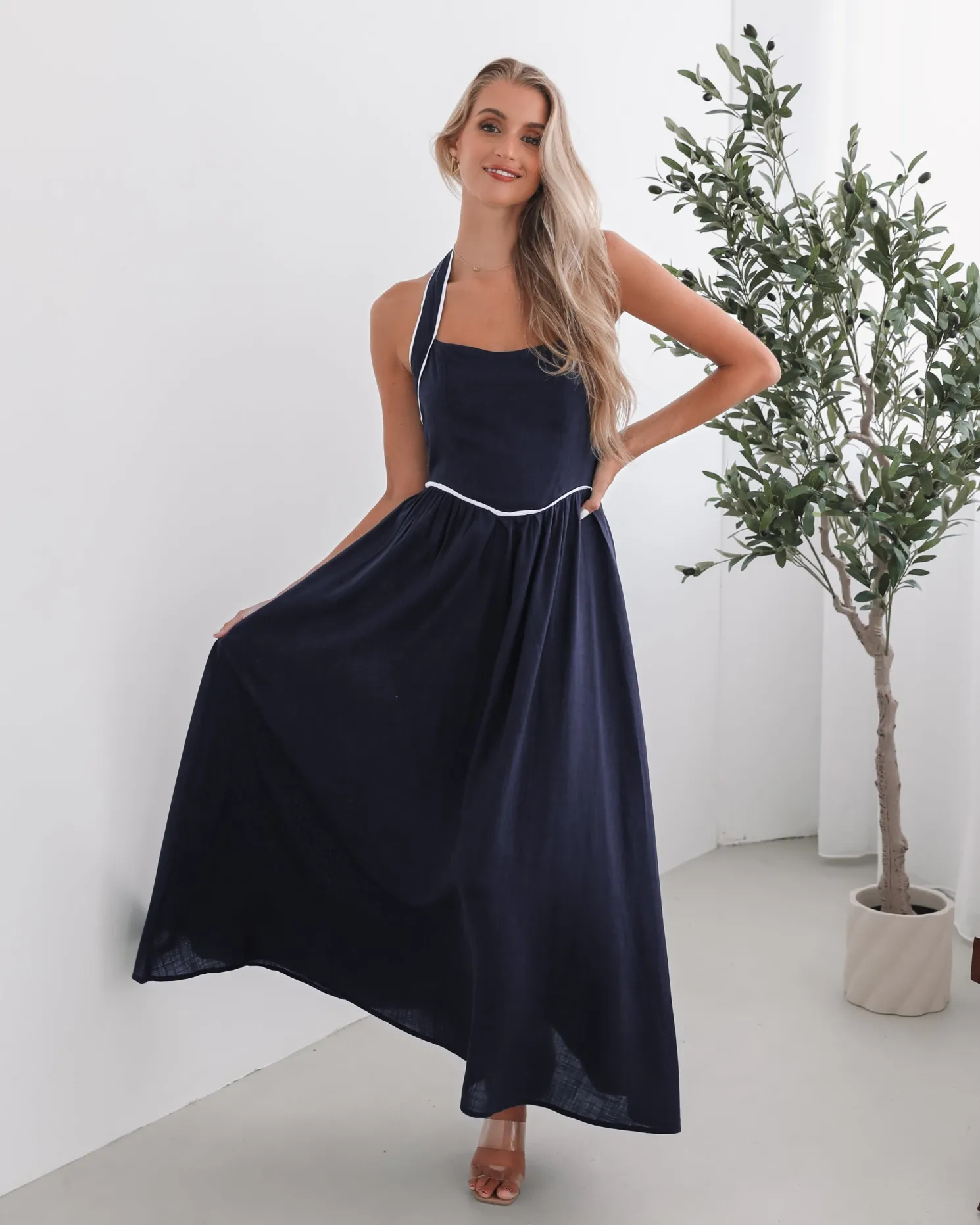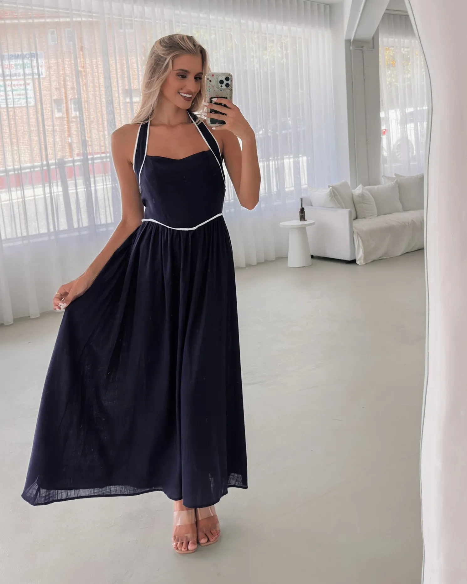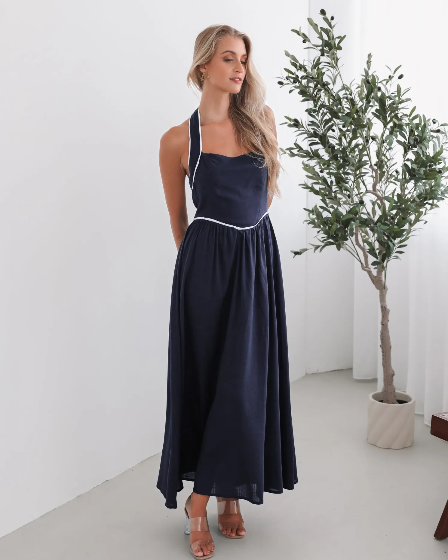 Our Dolci Dress comes in blue and white colours. A piece that speaks in stolen glances and the art of casual elegance, this number is designed with halter straps, sweetheart neckline, flowy skirt and maxi length hem. Style it with strappy heels for a polished evening look!