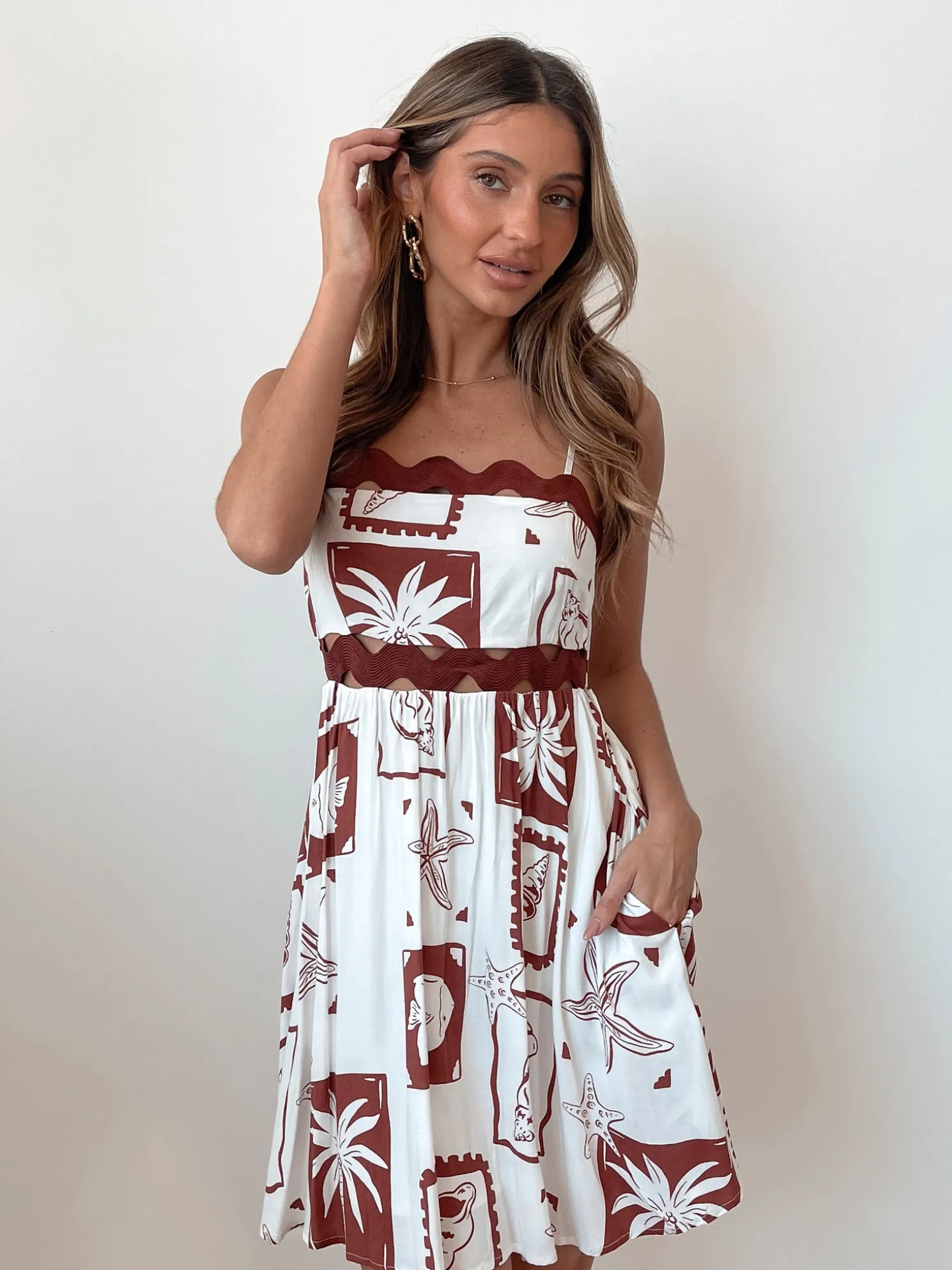 Our Dorienne Dress comes in white and brown tones. Evoking a sense of beachside bliss, this number features spaghetti straps, square neckline with curvy lace accents, cutout on waist, side pockets, a-line and mini length hem. Style with a sun hat for a look that stands out!