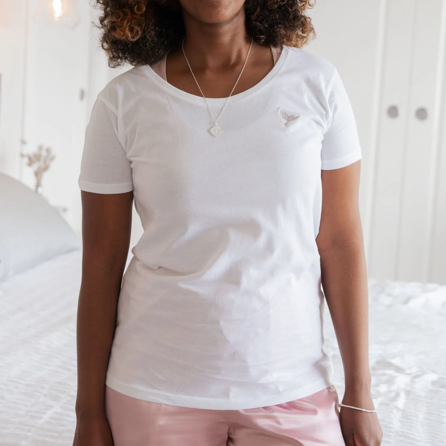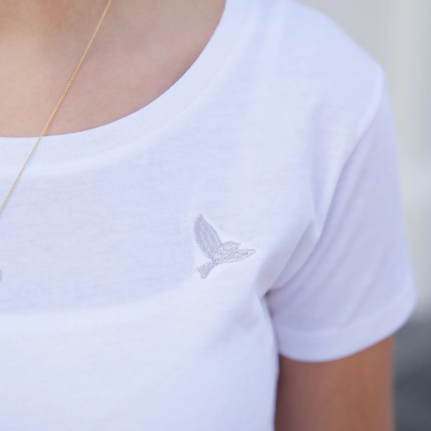 A beautiful white shade, featuring a wide scoop neck, self-fabric binding on neck, side seamed, shoulder to shoulder tape, double needle hems, preshrunk to minimise shrinkage. The champagne coloured bird is embroidered silk thread.