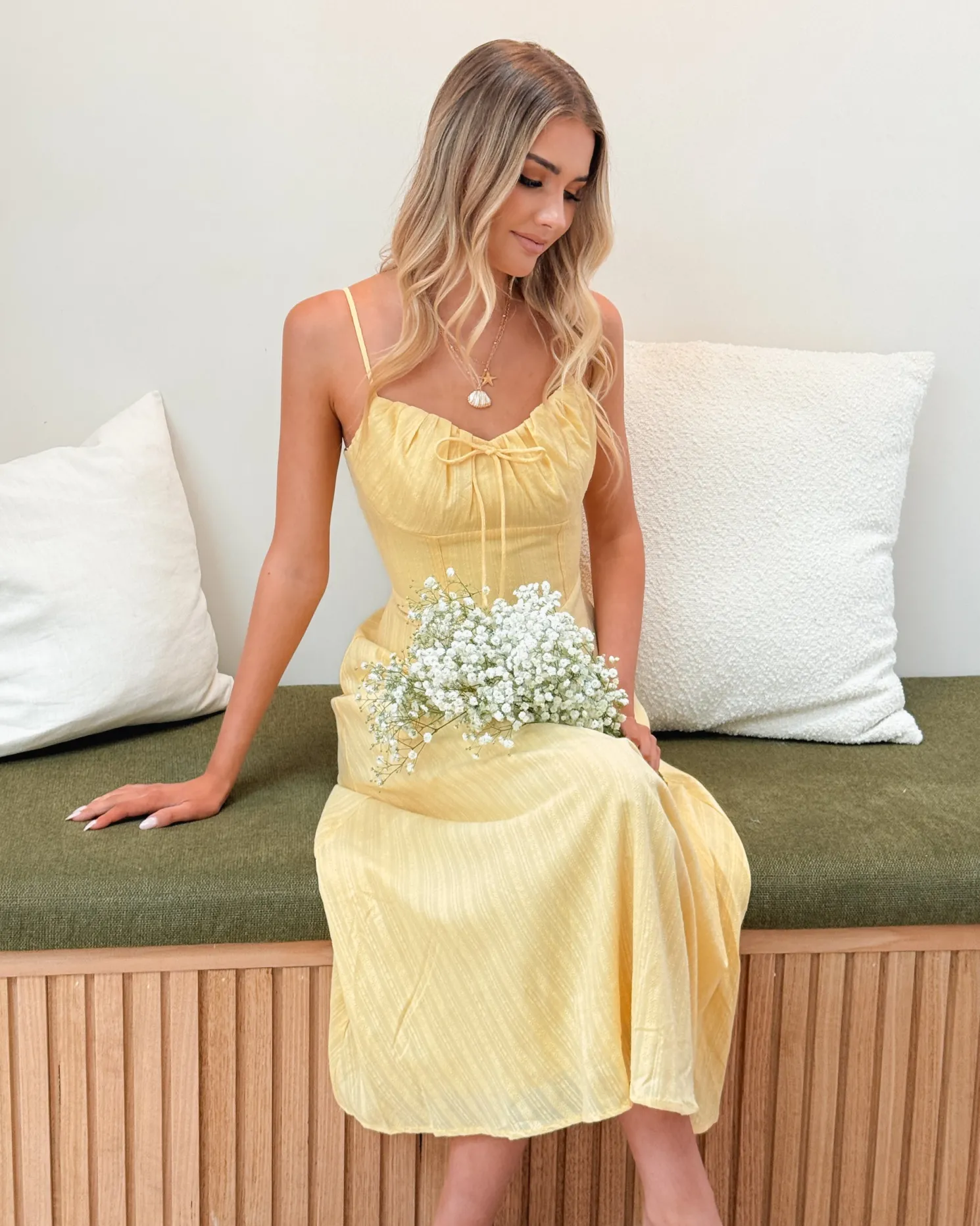 Our Edanna Dress comes in a yellow colour. Bright, playful, and undeniably chic, this number features slim straps, sweetheart neckline with string, a-line skirt and midaxi length hem. Pair with a raffia tote for a laid-back vacation look!