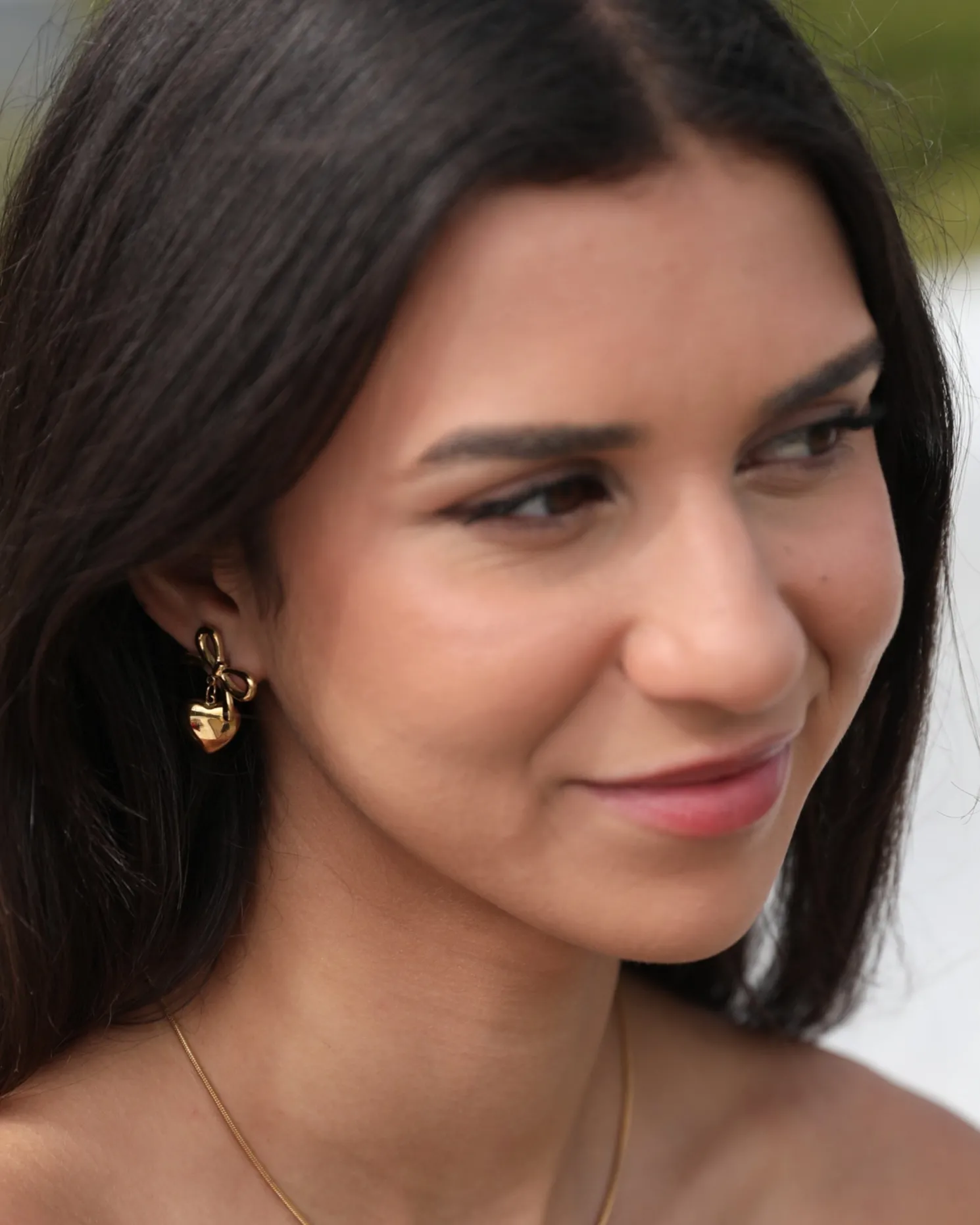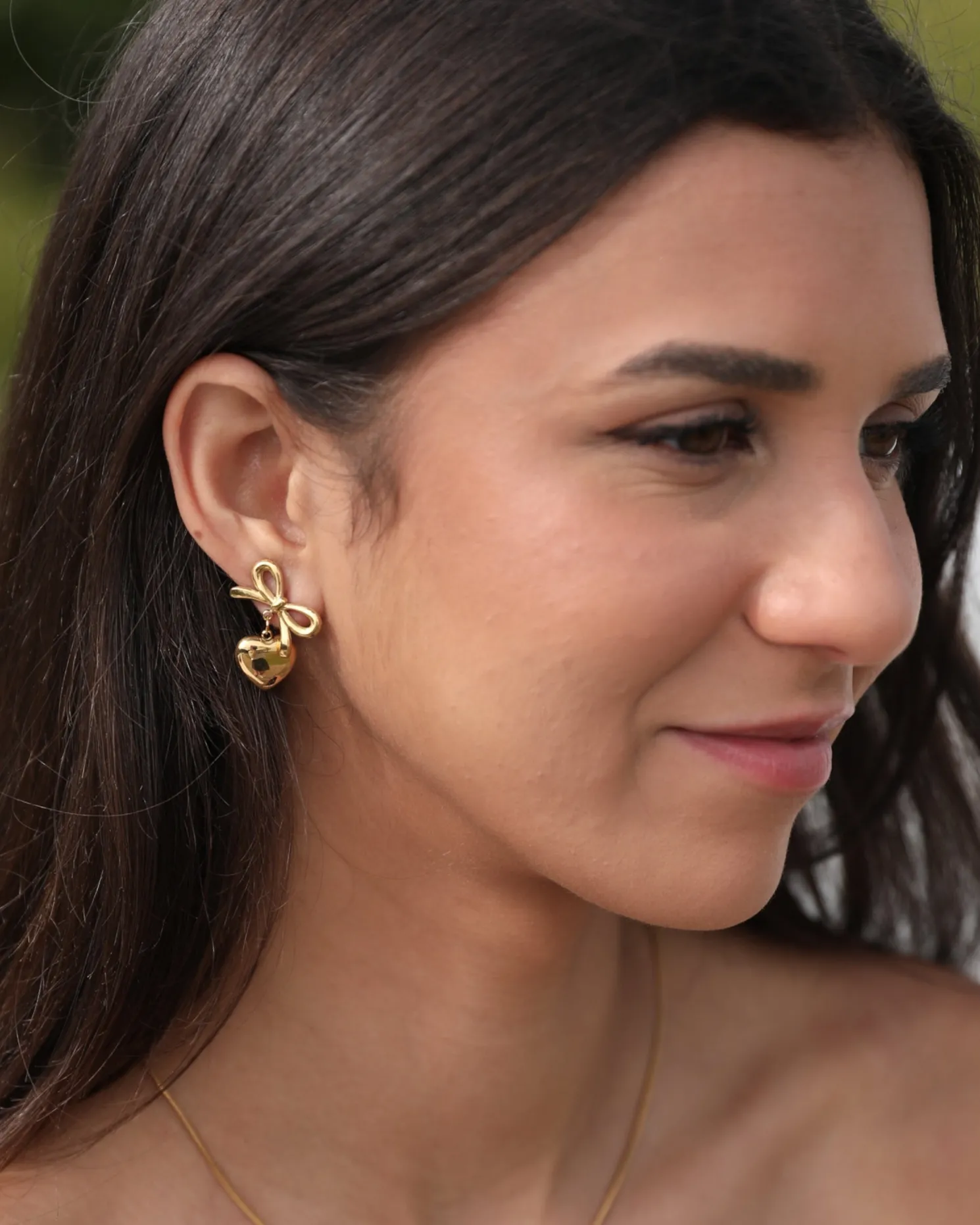 Our Eilonwy Earrings come in a gold colour. Combining romantic symbolism with refined artistry, this pair is designed with a ribbon and heart. Style with a floaty dress and soft curls!