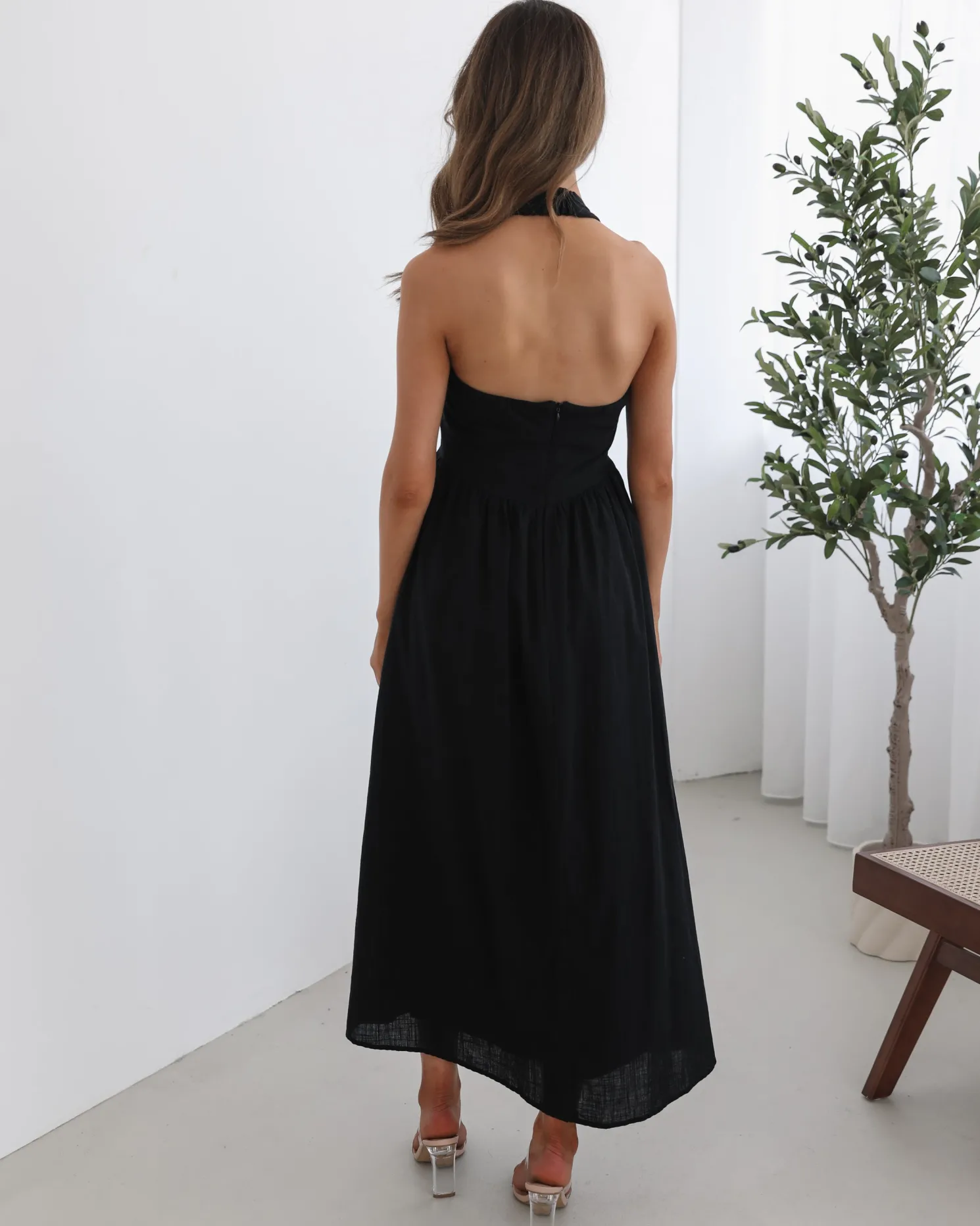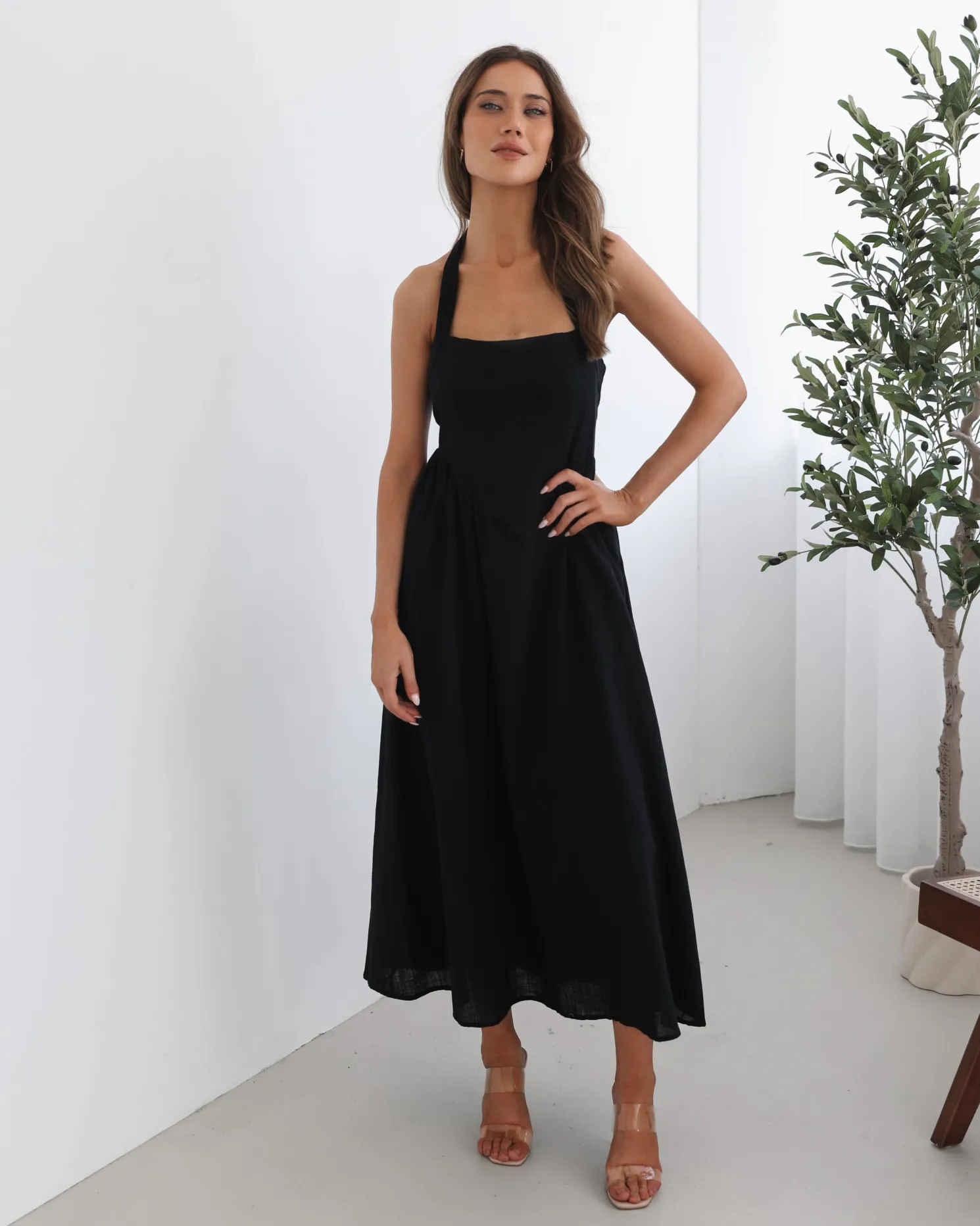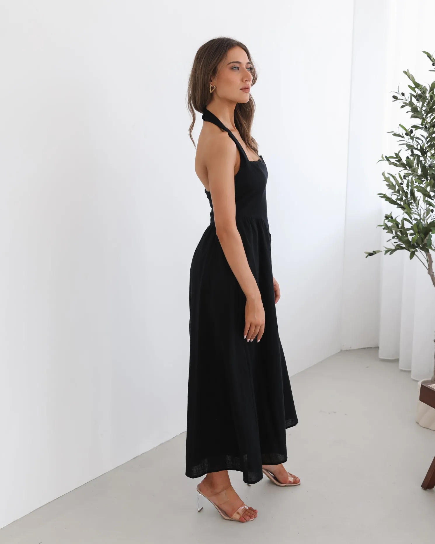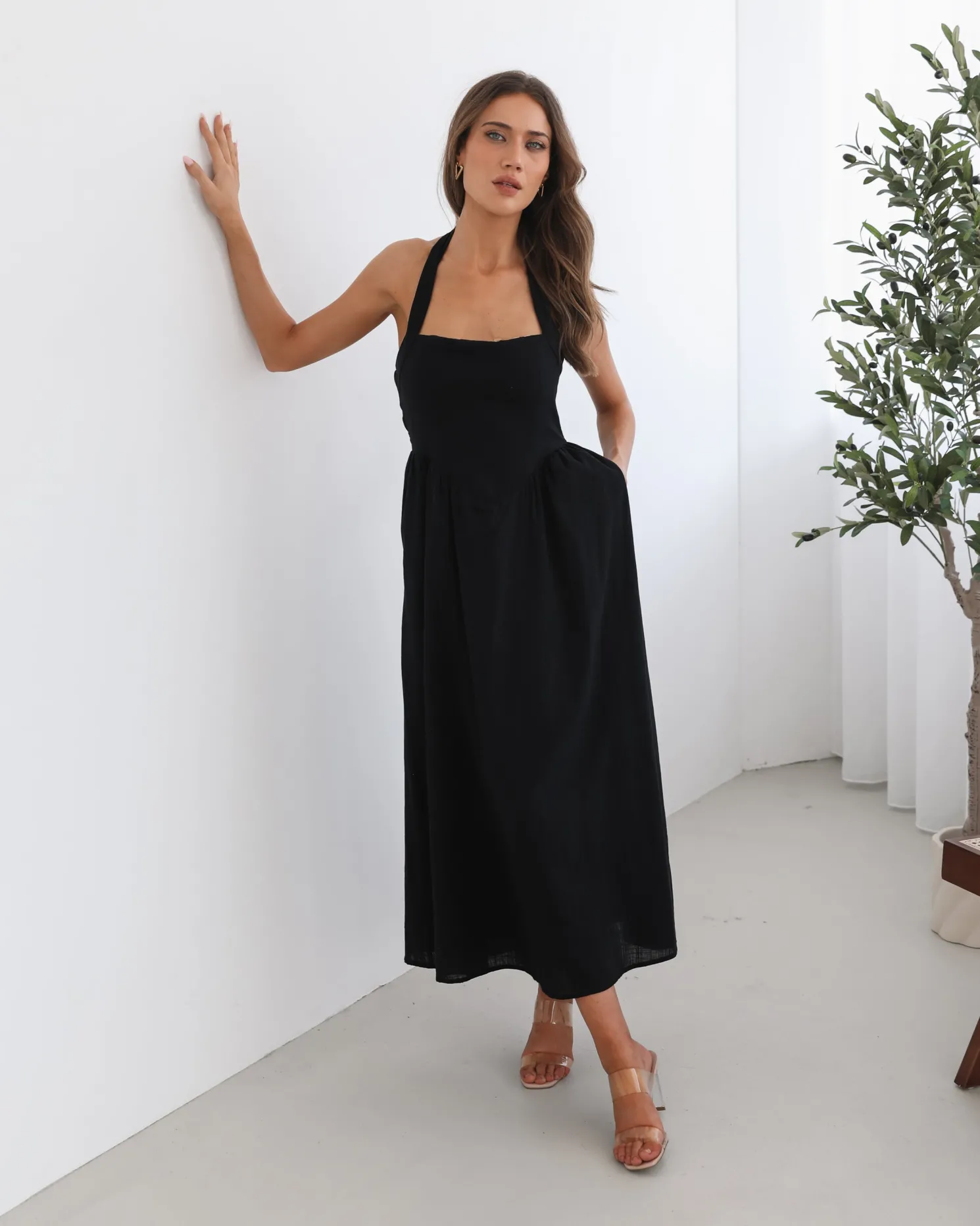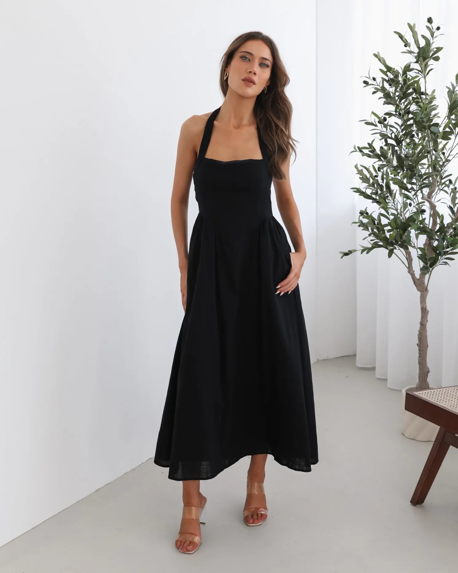 Our Ensina Dress comes in a black colour. Your ultimate power piece, this number features a halter strap, flowy skirt and maxi length hem. Pair it with strappy heels and a statement bag for a night out!