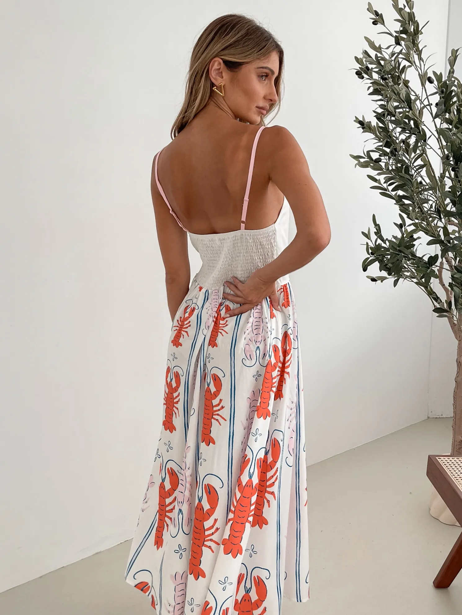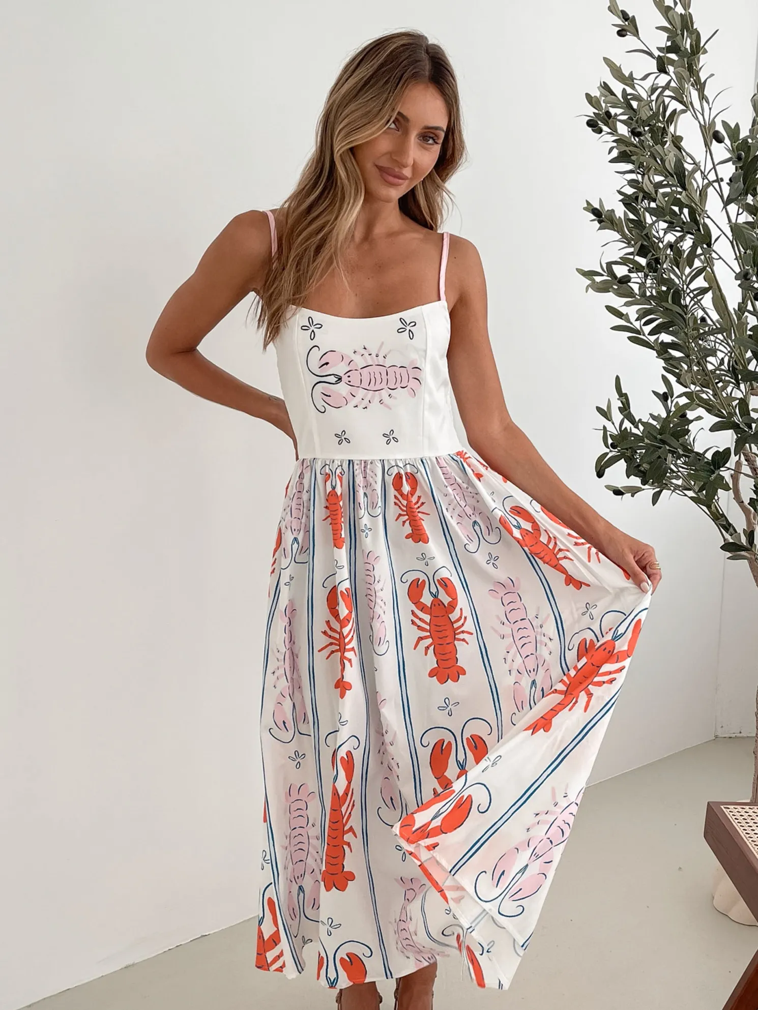 Our Evania Dress comes in a white base with multicoloured prints. A delightful blend of coastal charm and feminine allure, this piece is designed with spaghetti straps, scoop neckline, full skirt and midi length hem. Perfect for those who love to mix quirk with class!