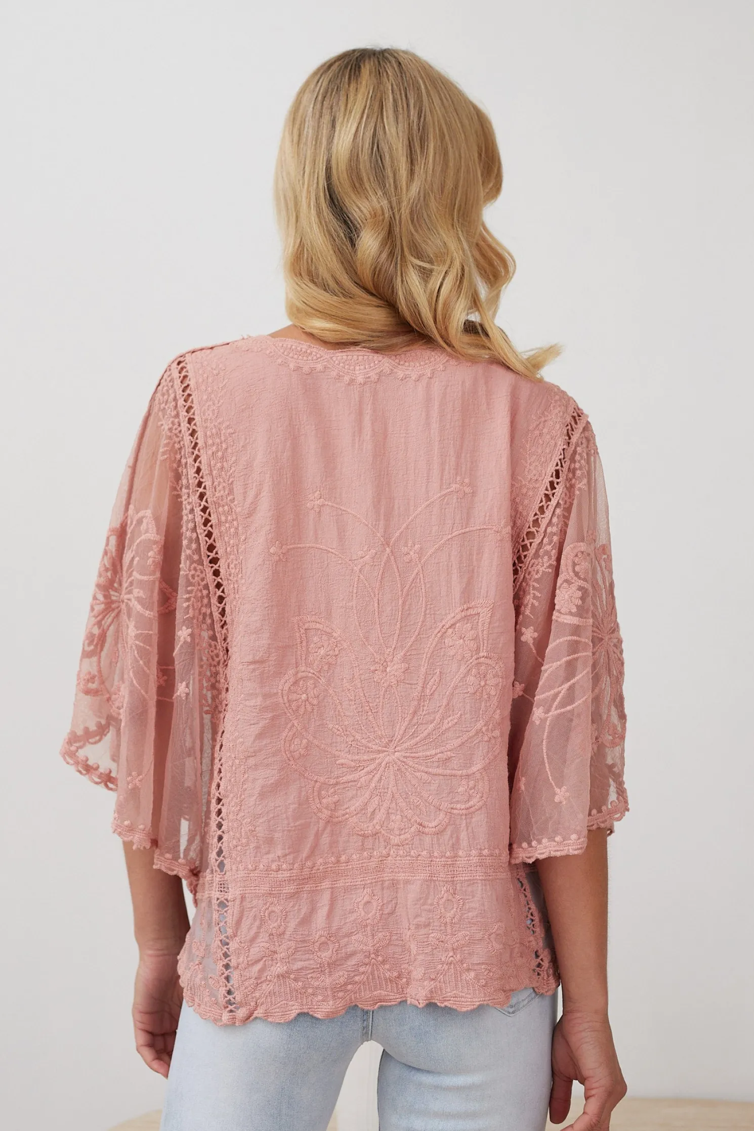 Our Gabrielle Top comes in a stunning clay pink tone. This lightweight sheer top features lace embroidery for a gorgeous bohemian look. The relaxed fit is ideal for the warm weather to come and pairs beautifully with a nude lacey bra. This is a one size fits all that fits sizes 6-14 depending on the desired fit.