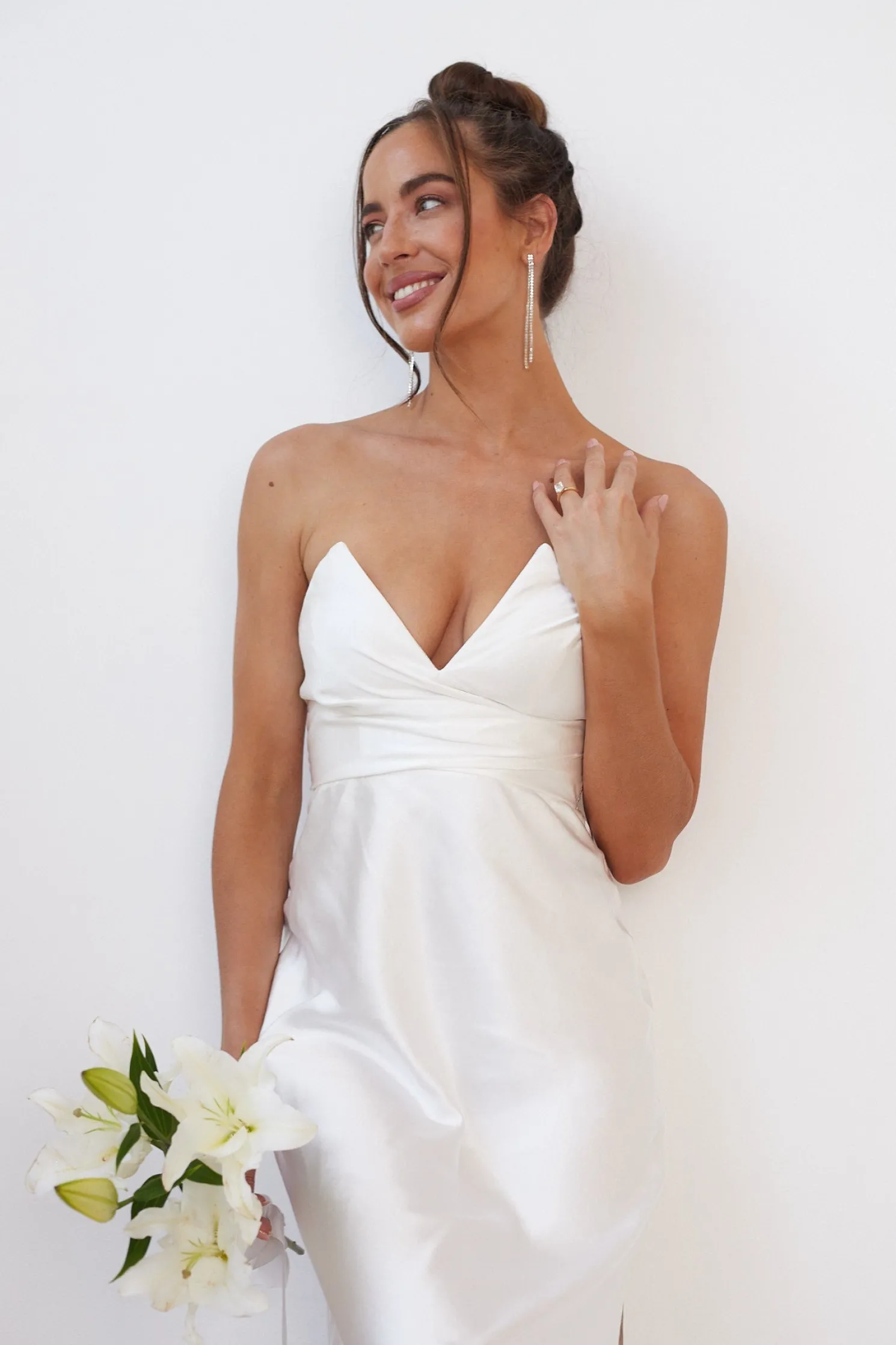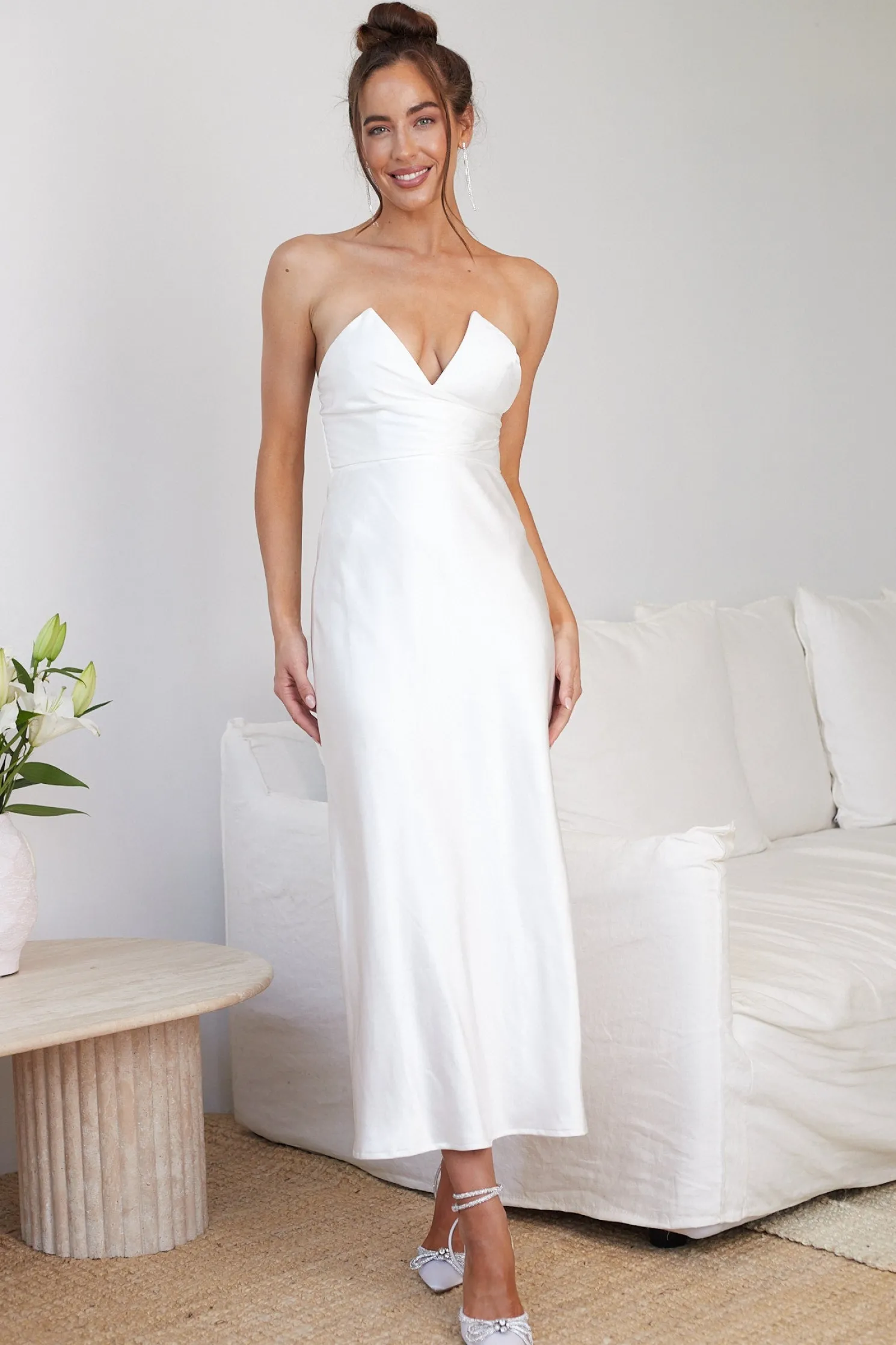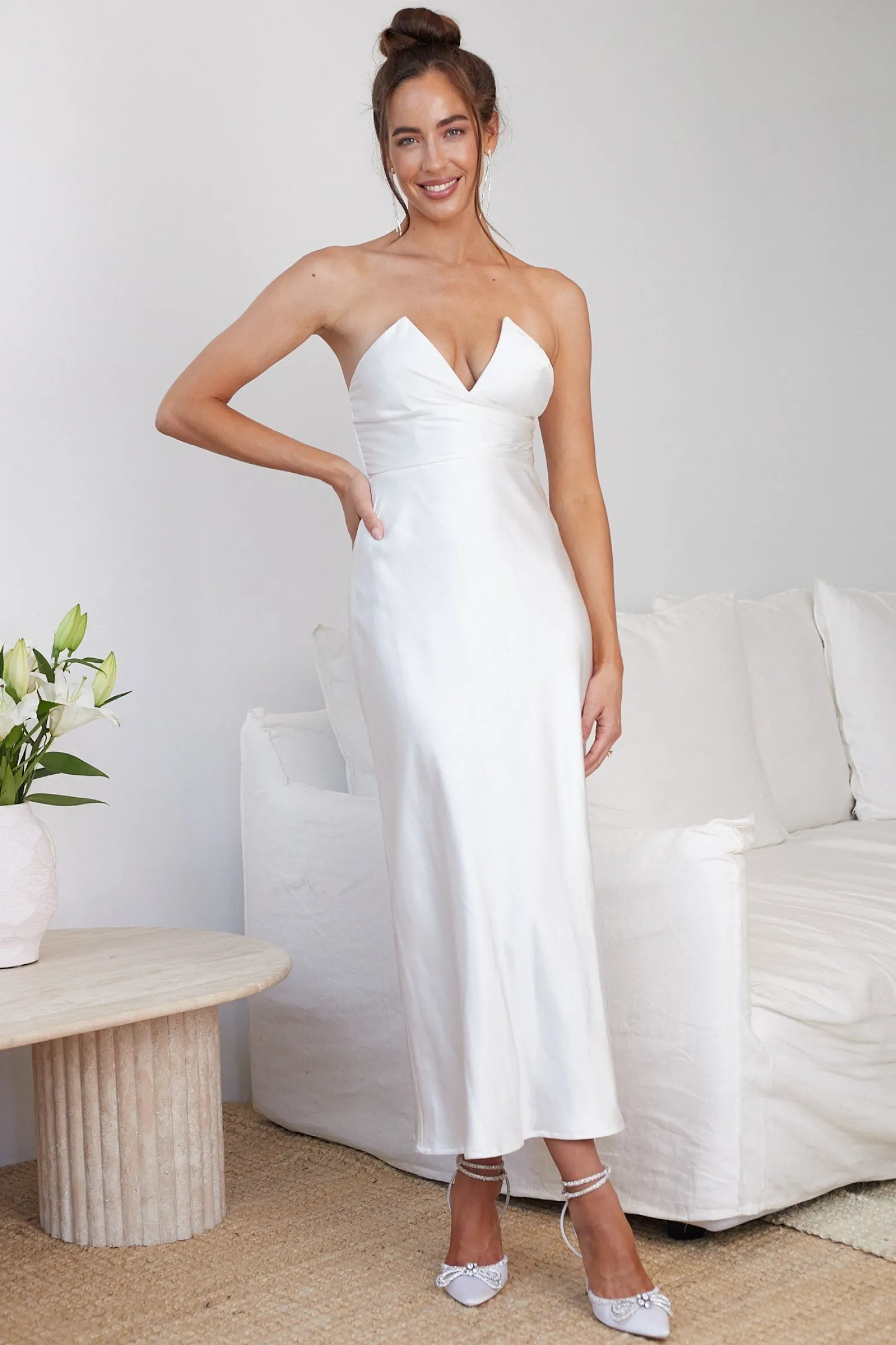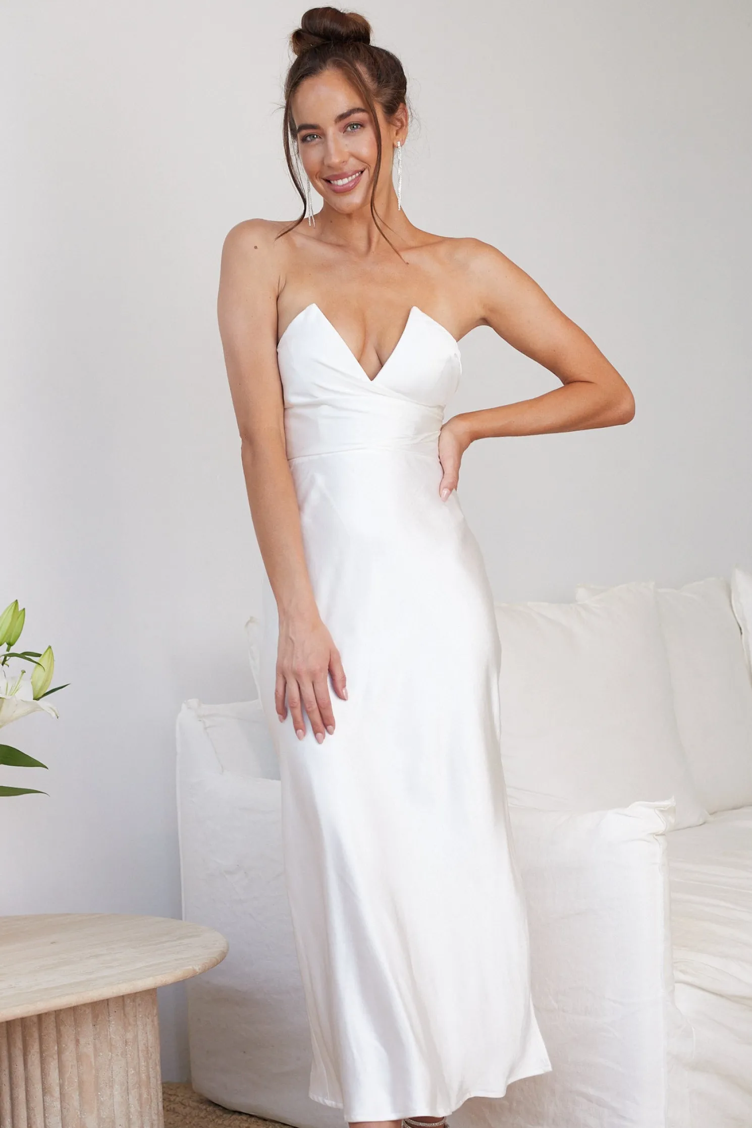 Our Giavanna Dress comes in an ivory white colour. Make everyone remember you in this strapless midi that boasts a plunge neckline accentuating the bosom and pleats on the waist for a more flattering shape. Ideal for formal events, this stunner pairs beautifully with embellished strap heels and a hexagonal clutch bag!