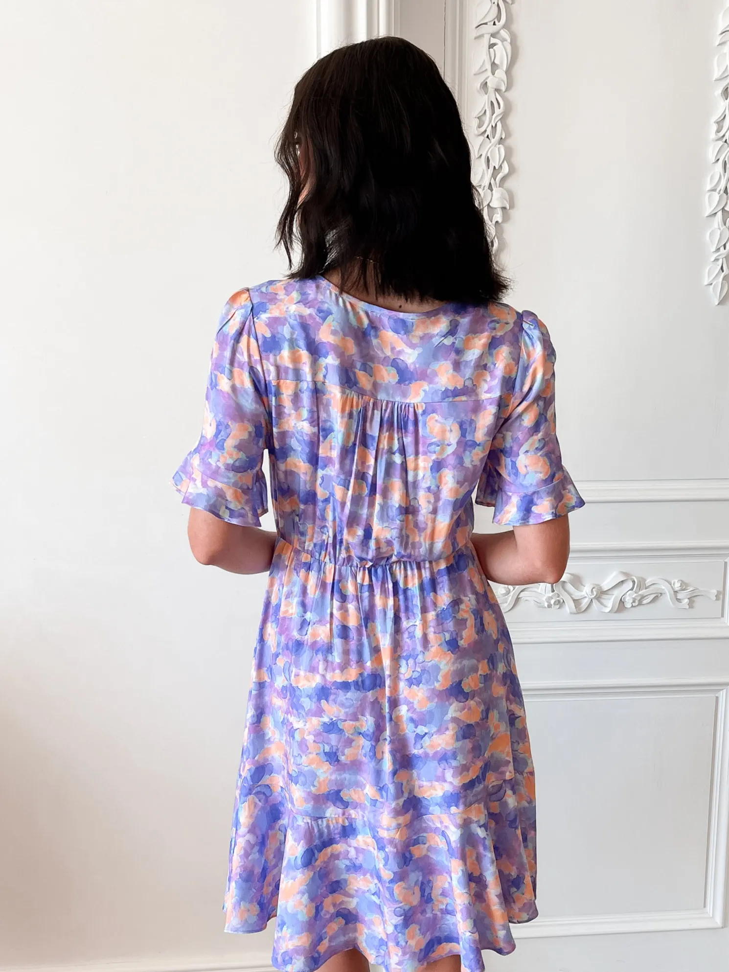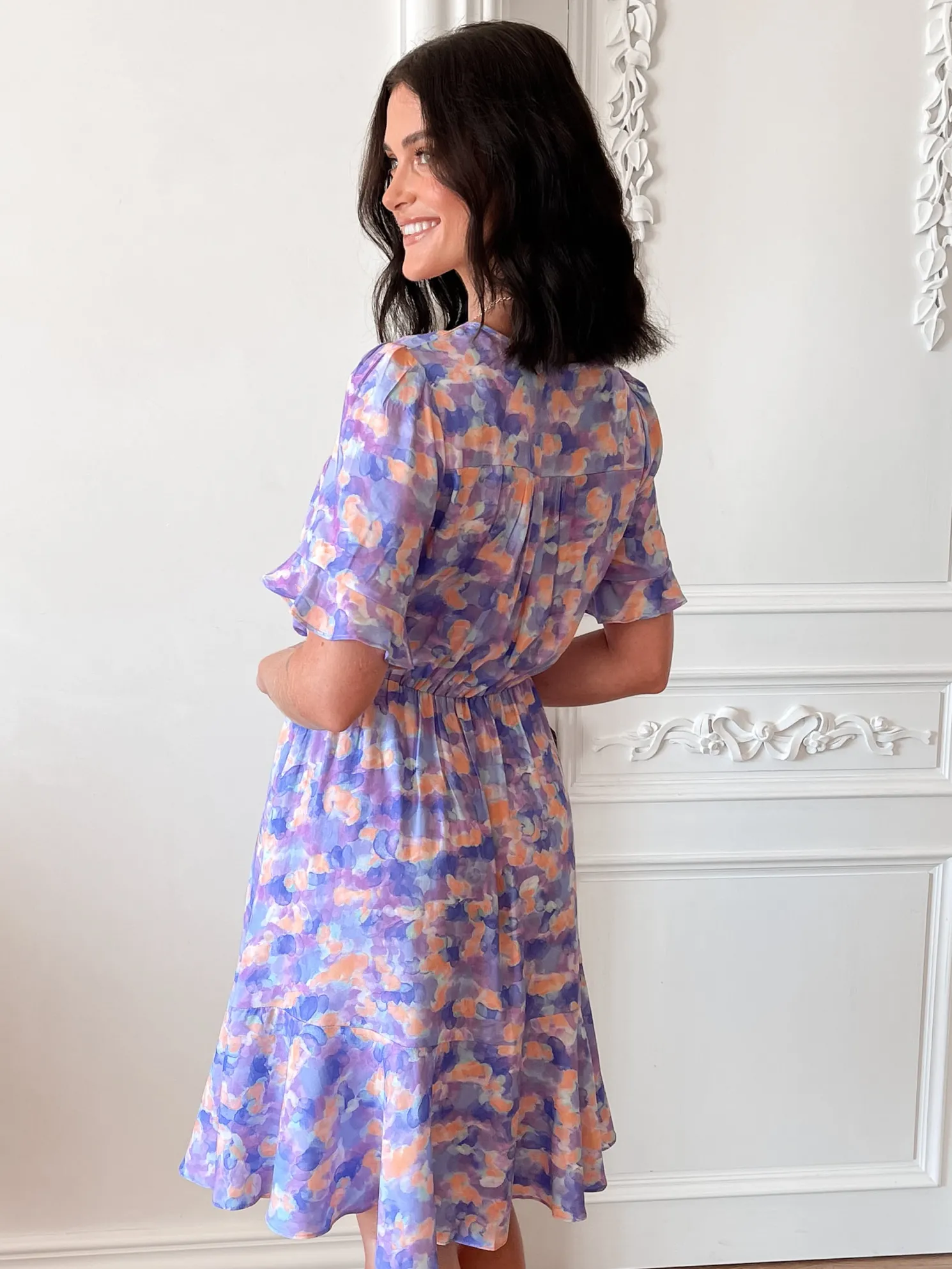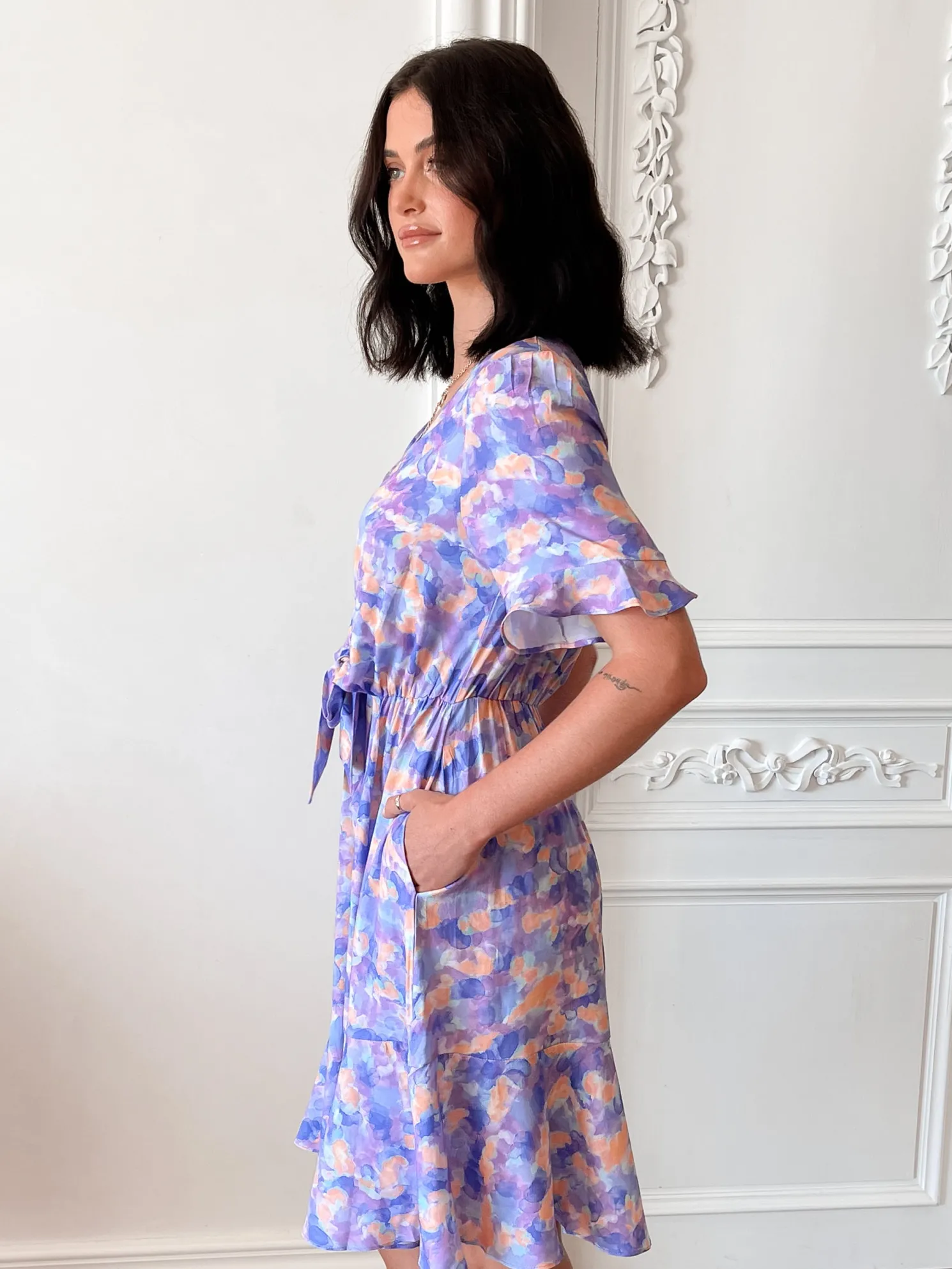 Our Gimlee Dress comes in a purple base with muticoloured prints. A perfect mix of vibrancy and sophistication, this piece is designed with a v-neckline, short sleeves with flounce, centre-front buttons, waist tie, flowy a-line skirt and knee length. Add a delicate gold jewellery—think layered necklaces, small hoops, and a thin bracelet!