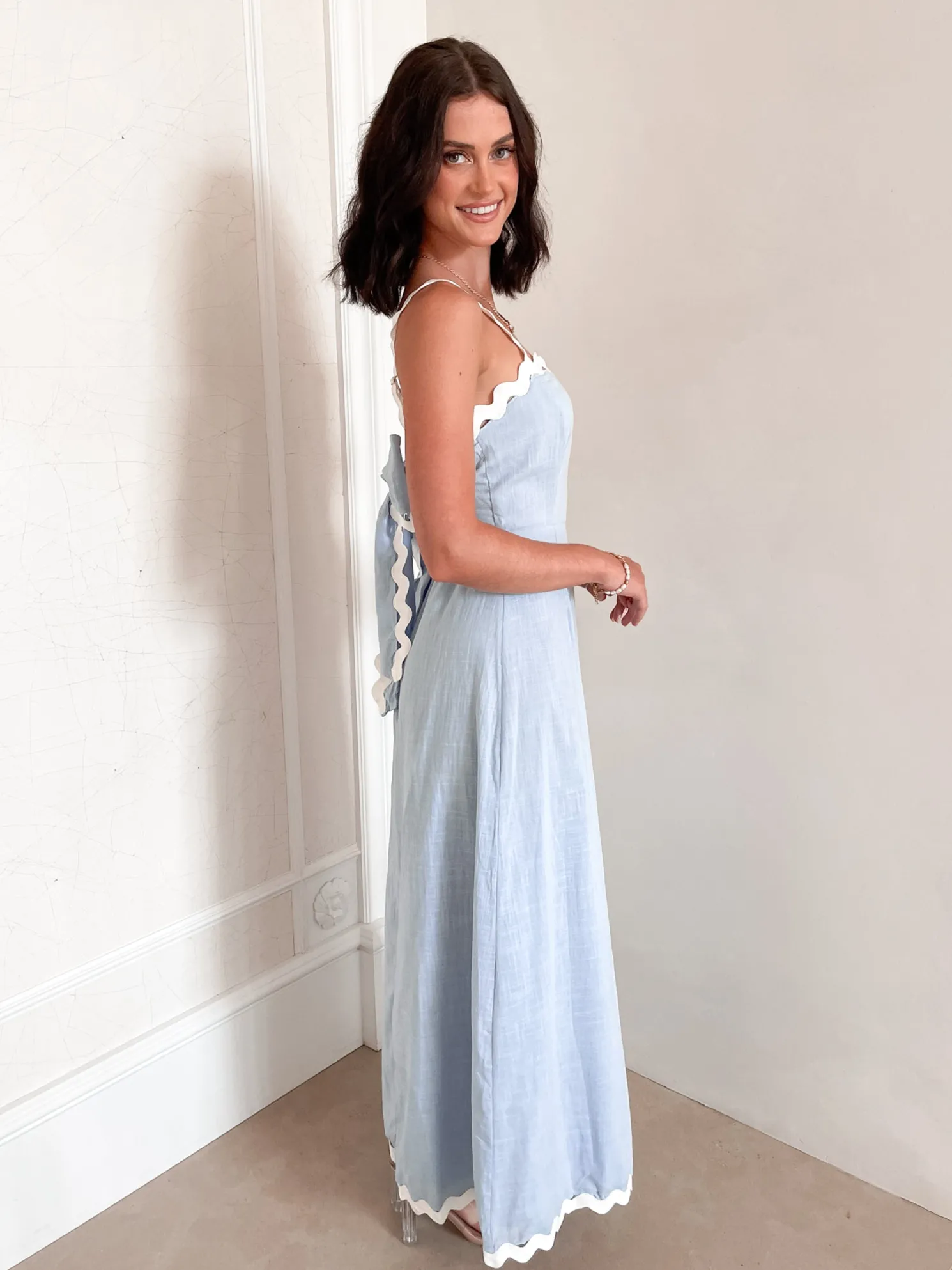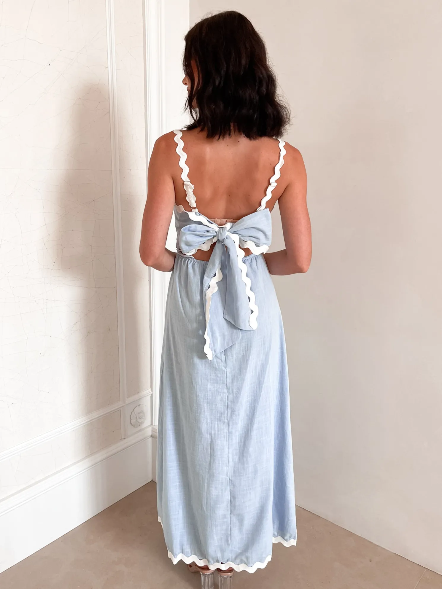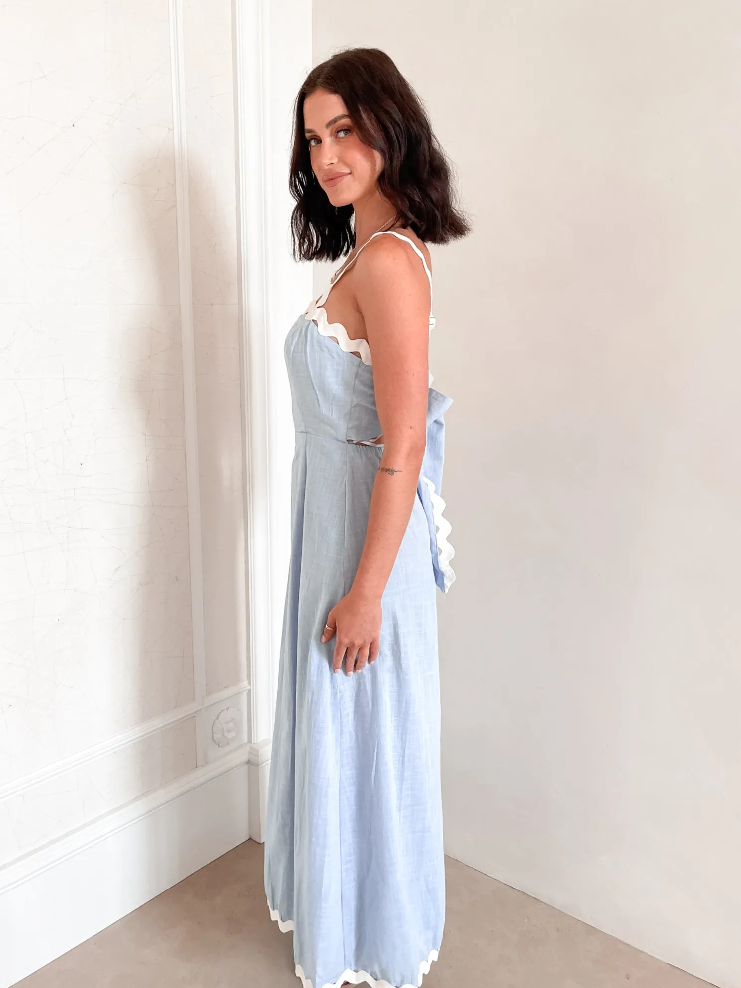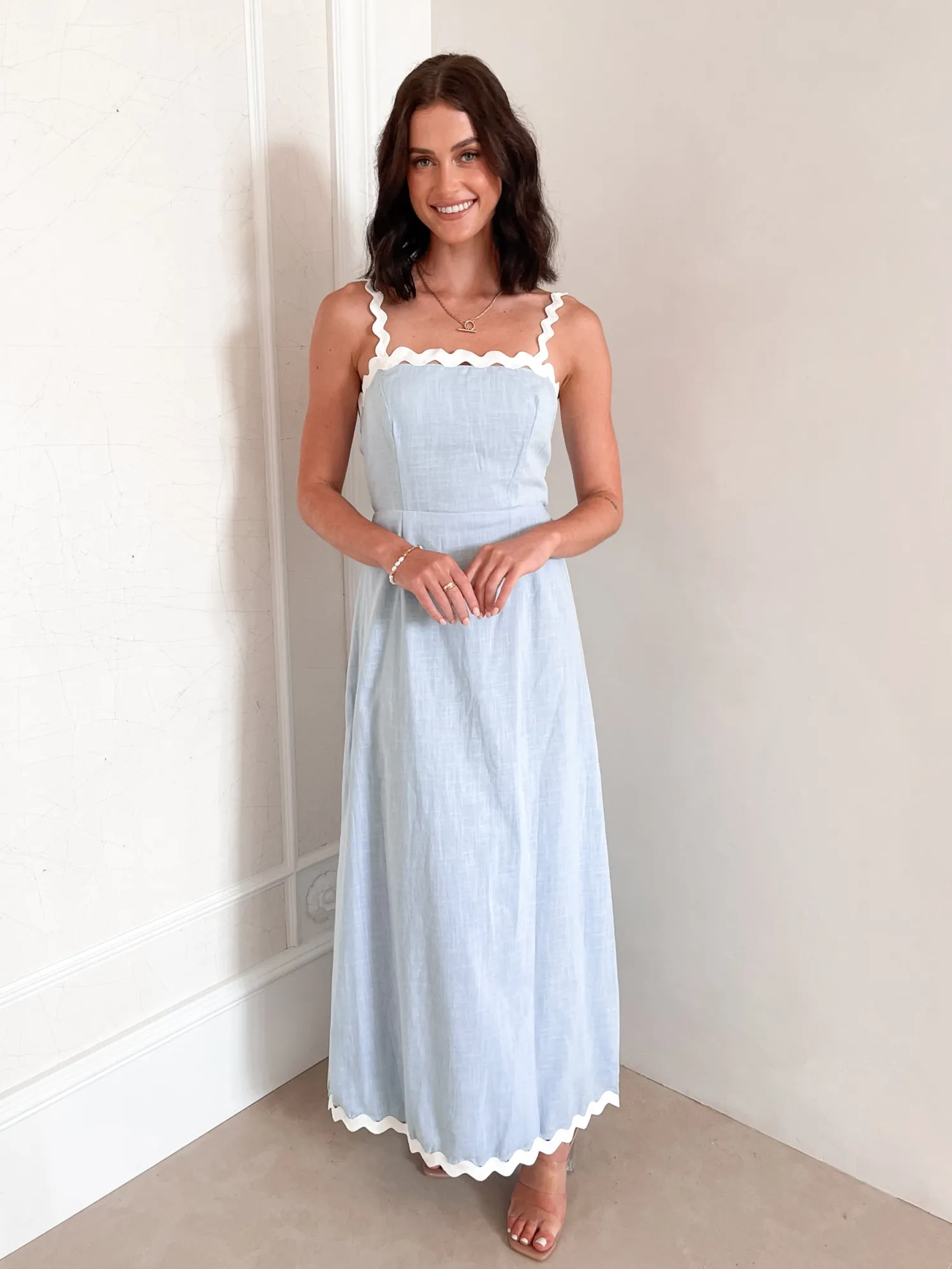 Our Gylfie Dress comes in a light blue colour. Your new secret weapon for laid-back luxury, this piece is designed with a square neckline, semi-relaxed skirt and maxi length hem. Look extra sophisticated with classic heels!