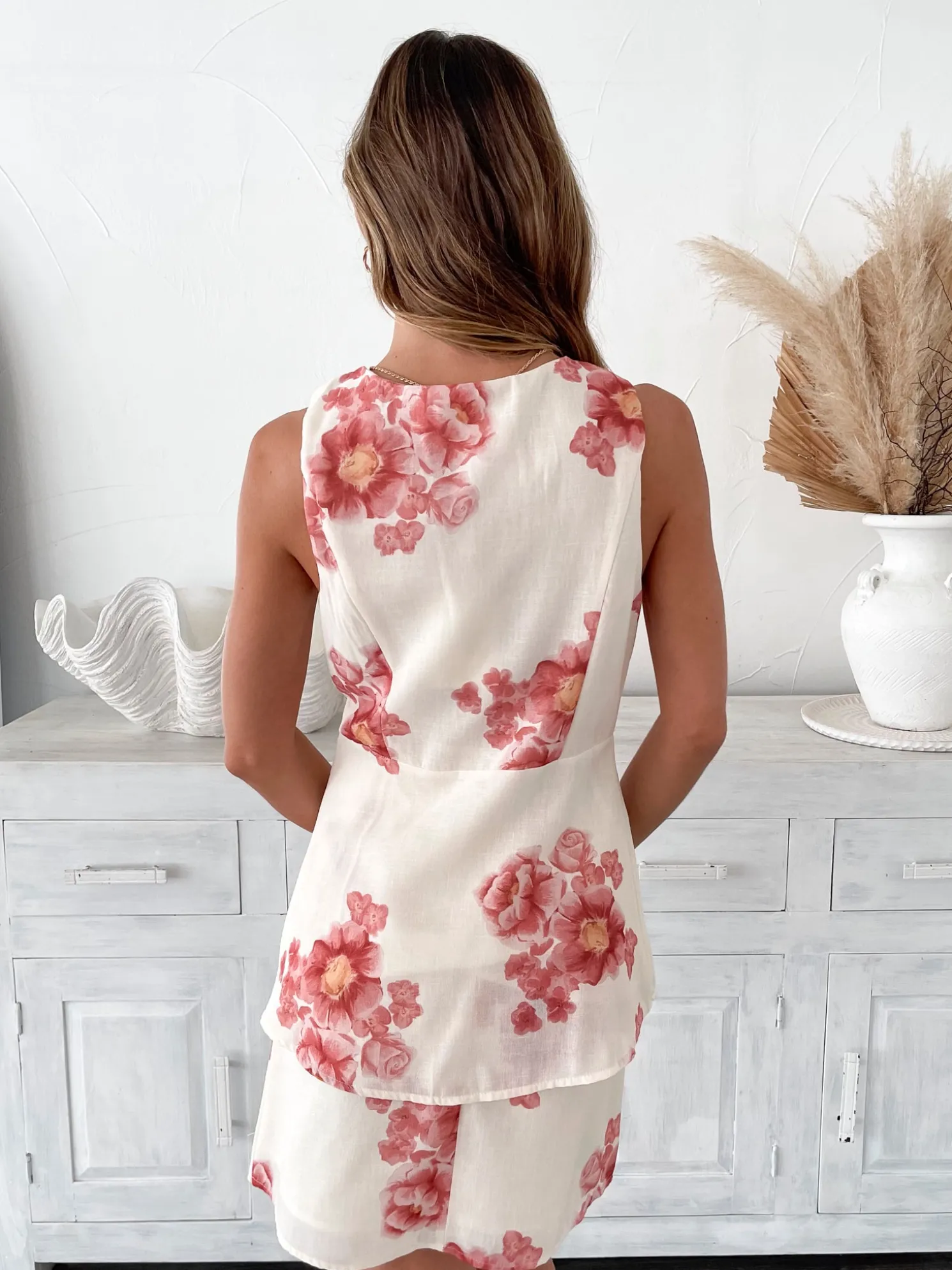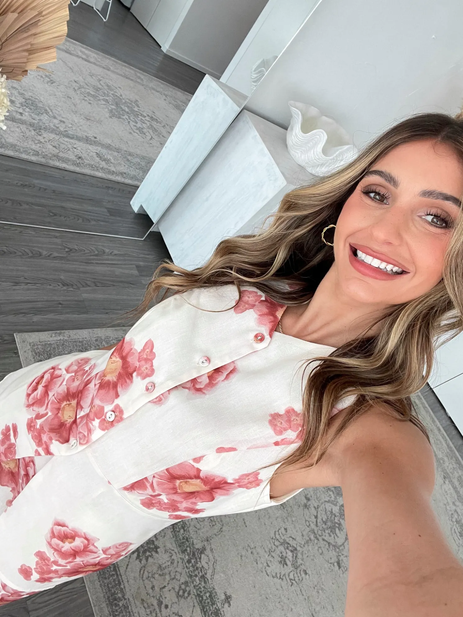 Our Harleigh Top comes in a cream base with red floral prints. Be a head-turning beauty in this feminine staple that features a v-neckline, centre-front buttons and peplum style silhouette. Complete the look with the Harleigh Shorts!