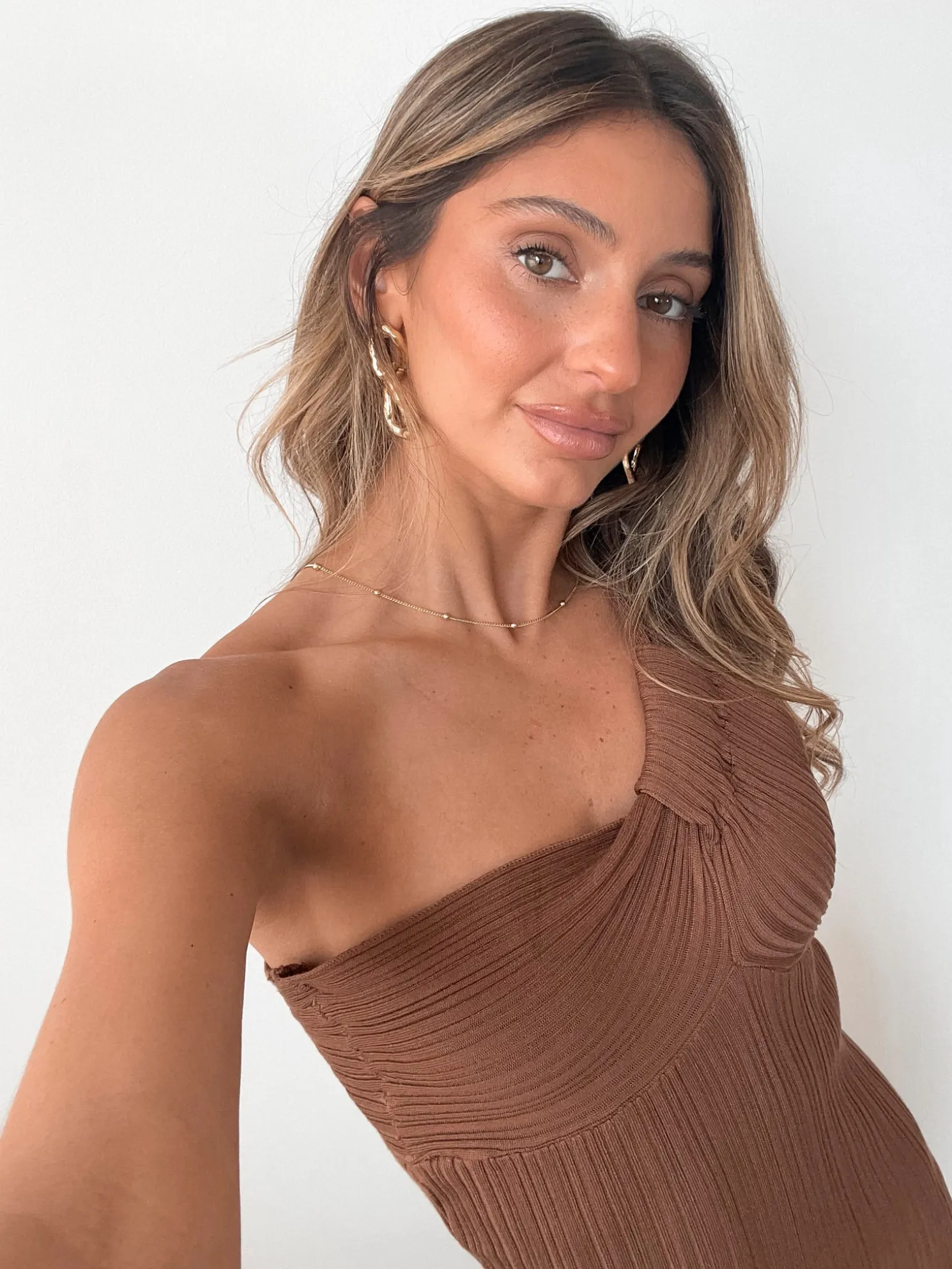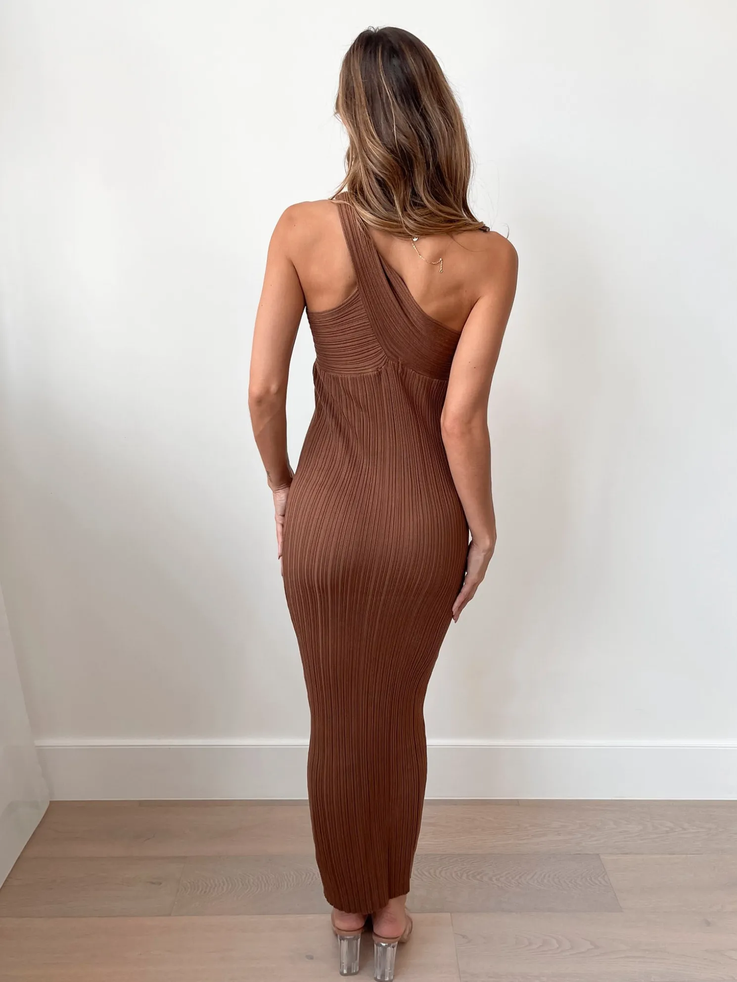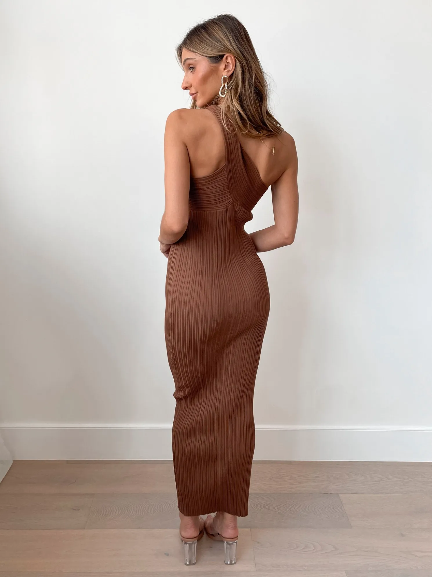 Our Hellen Knit Dress comes in a light chocolate colour. Embrace your inner glamour with this piece that gracefully hugs your curves with its bodycon silhouette, asymmetrical neckline and midaxi length. Wear it with your favourite strappy heels for a night out, or pair it with chic ankle boots for a stylish day look.