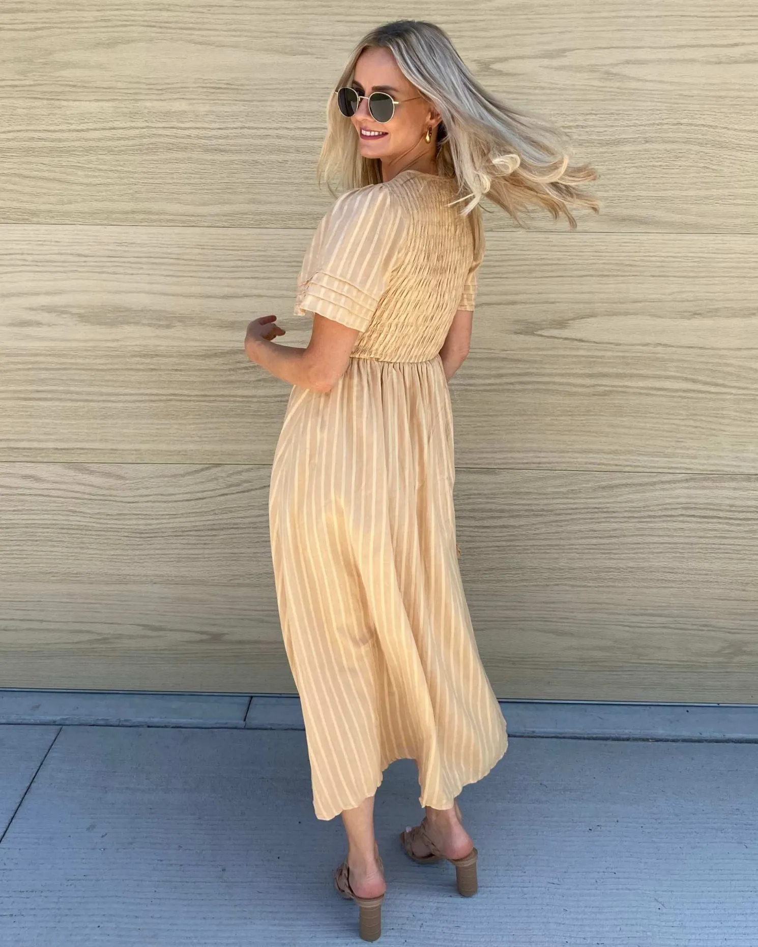 Our Iolana Dress comes in a beige colour. It features a round neckline, short sleeves and a textured pattern across the chest. This stunning midi pairs wonderfully with boots or heels for a stunning formal look!