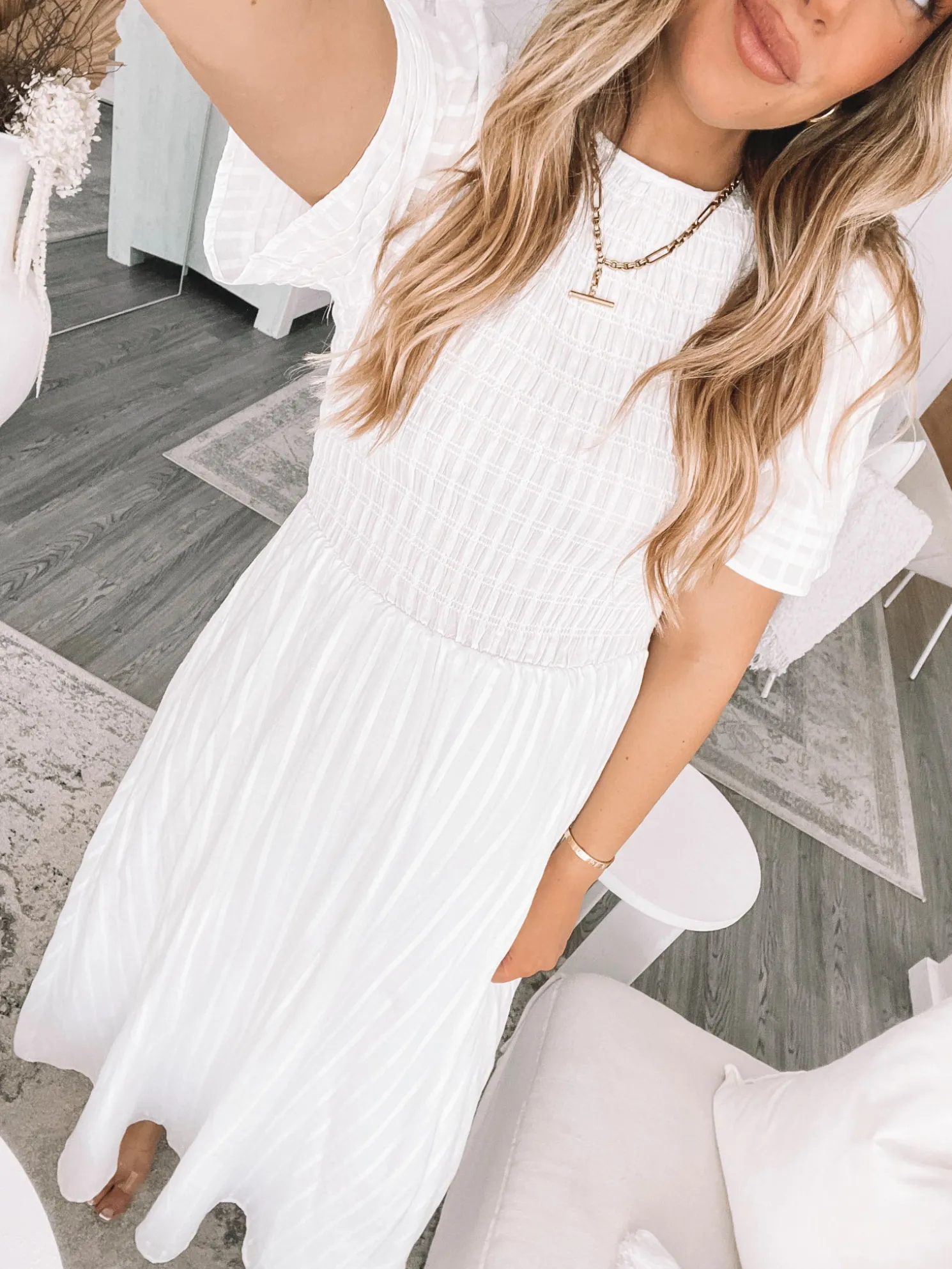Our Iolana Dress comes in a crisp white tone. It features a round neckline, short sleeves and a textured pattern across the chest. This stunning midi pairs wonderfully with boots or heels for a stunning formal look!