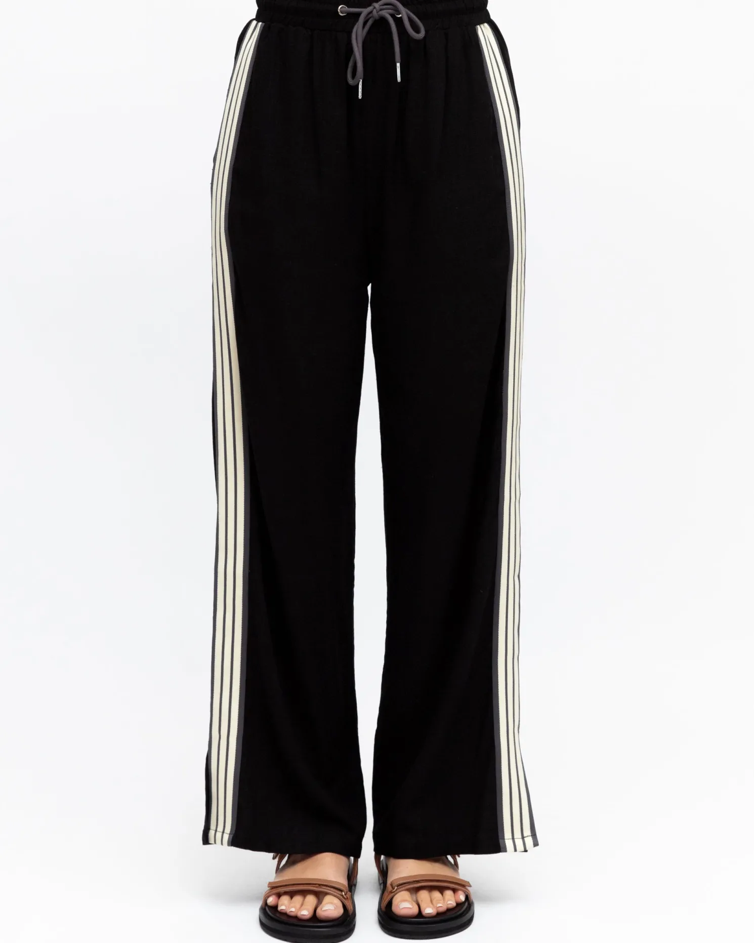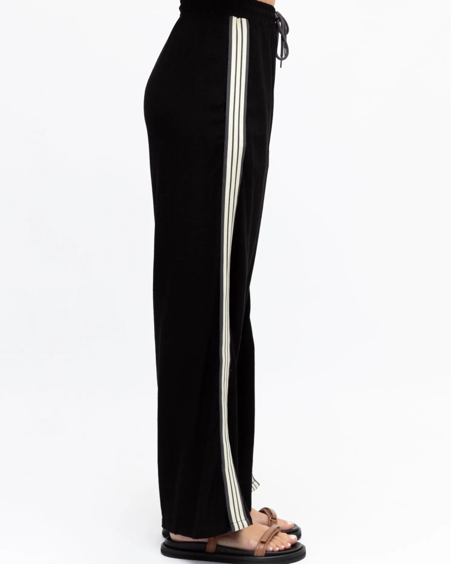 Our Iverie Pants come in a black colour with white stripes. Equal parts street-cool and comfy chic, this number is high waisted and features a string, side slit, wide leg silhouette and ankle length hem. Style it with your favorite kicks and a statement jacket!