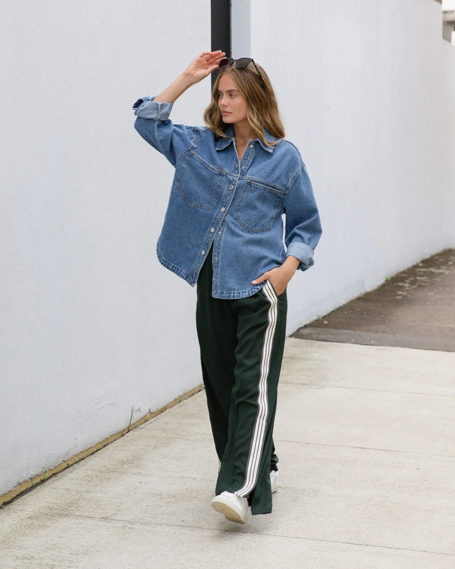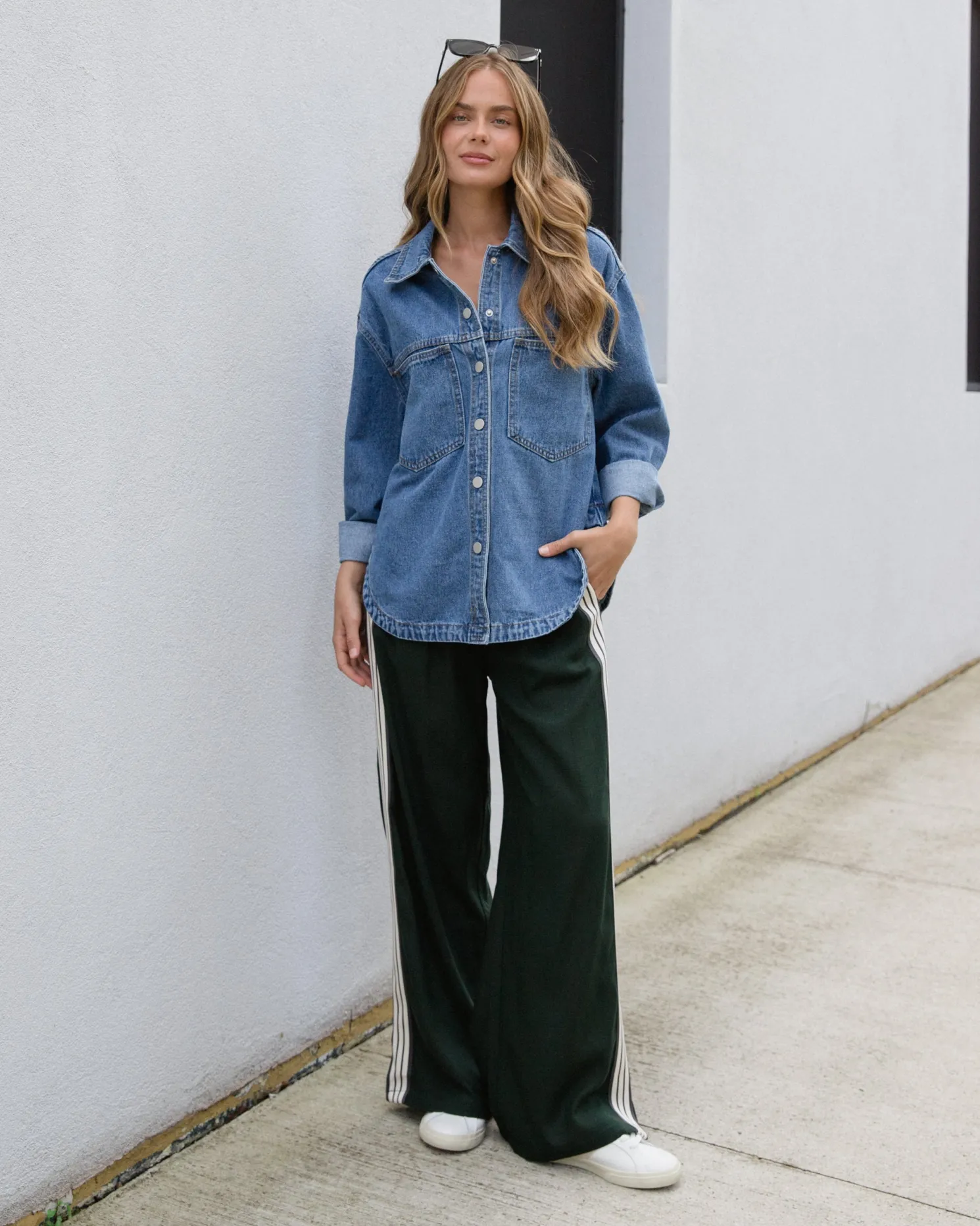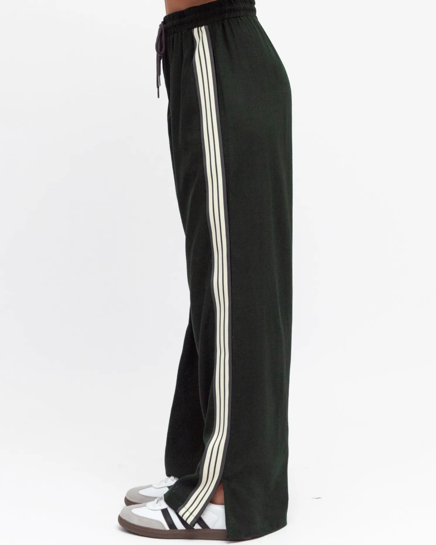 Our Iverie Pants come in a green colour with white stripes. Equal parts street-cool and comfy chic, this number is high waisted and features a string, side slit, wide leg silhouette and ankle length hem. Style it with your favorite kicks and a statement jacket!