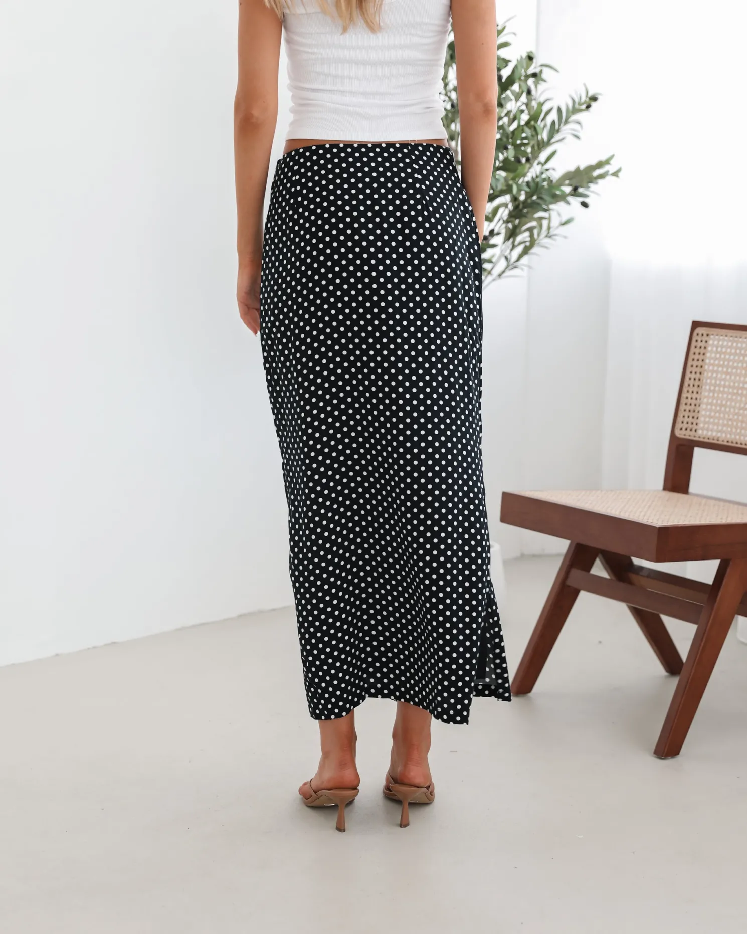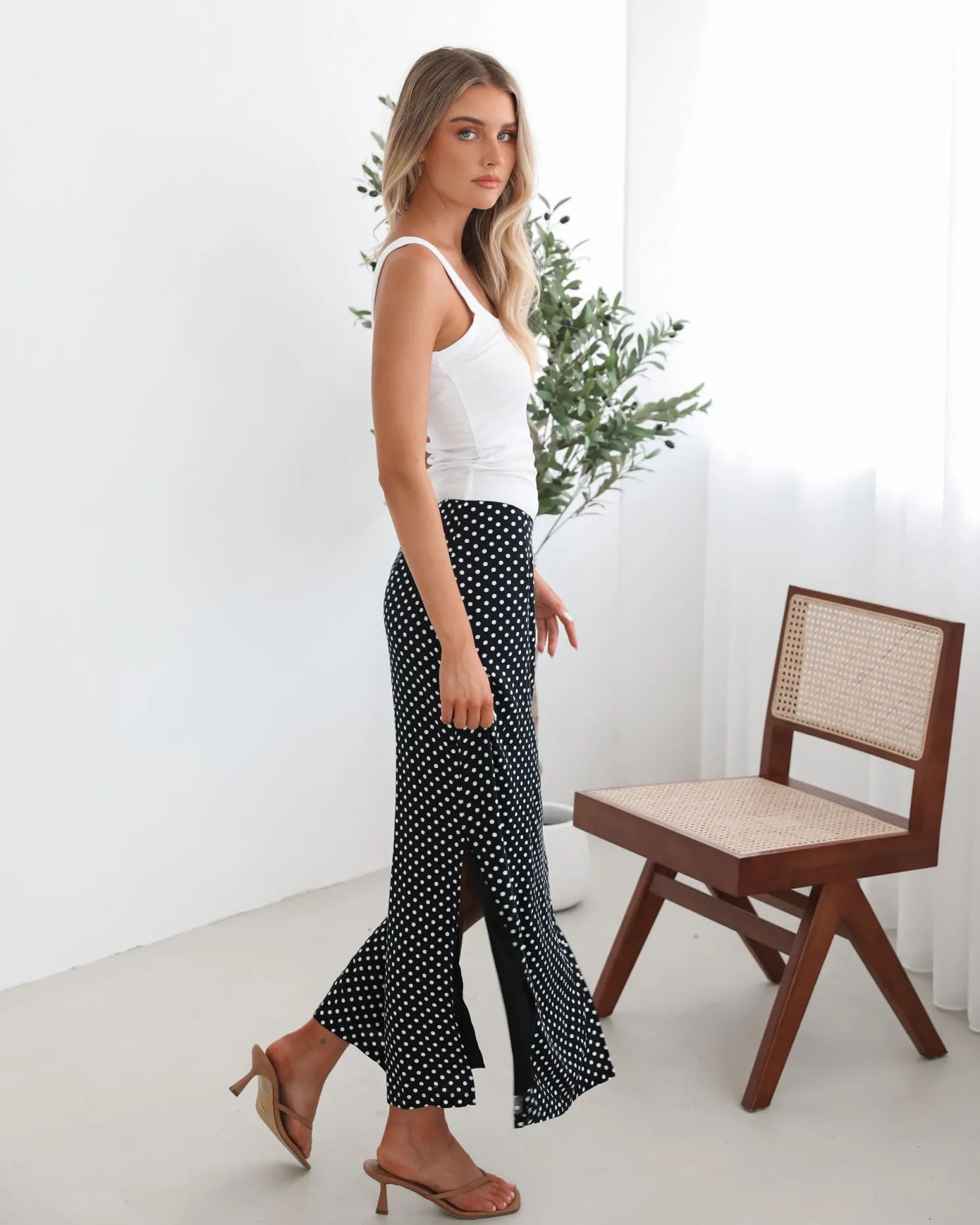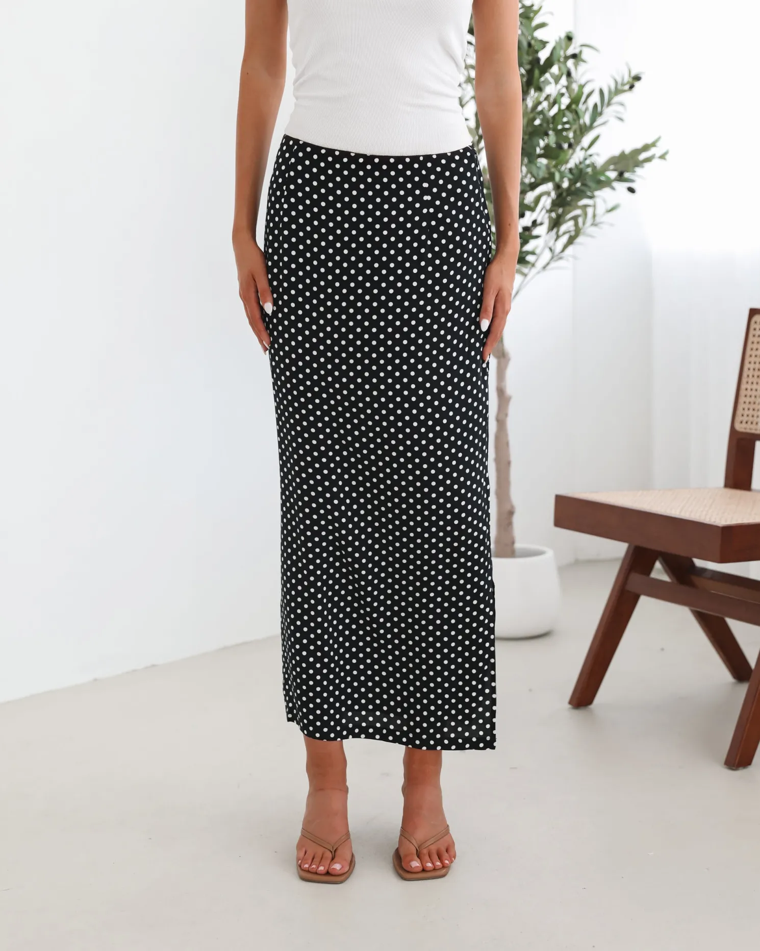 Our Jeanette Skirt comes in black and white tones. The right amount of sass and swing to your outfit, this piece is high-waisted and features a flared silhouette, side slit and midaxi length hem. Unlock street-style goals with a cropped tee & sneakers combo!