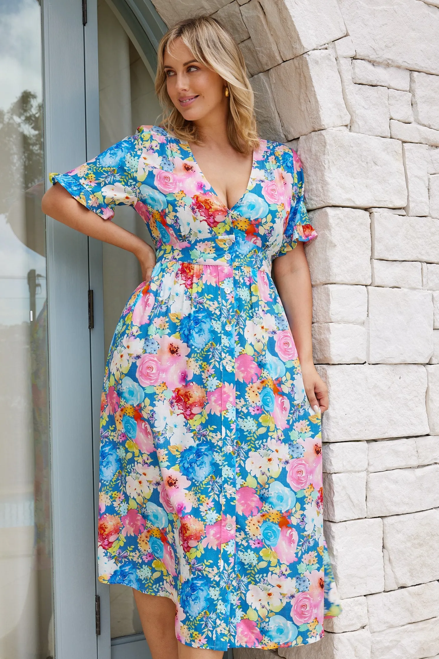 Our Karabelle Dress comes in amulticoloured floral print. Take in the beauty of the city while looking all pretty in this midi that features a v-neckline, short flounce sleeves, centre-front buttons and flowy skirt. Style with gladiator flats and a rattan bag!
