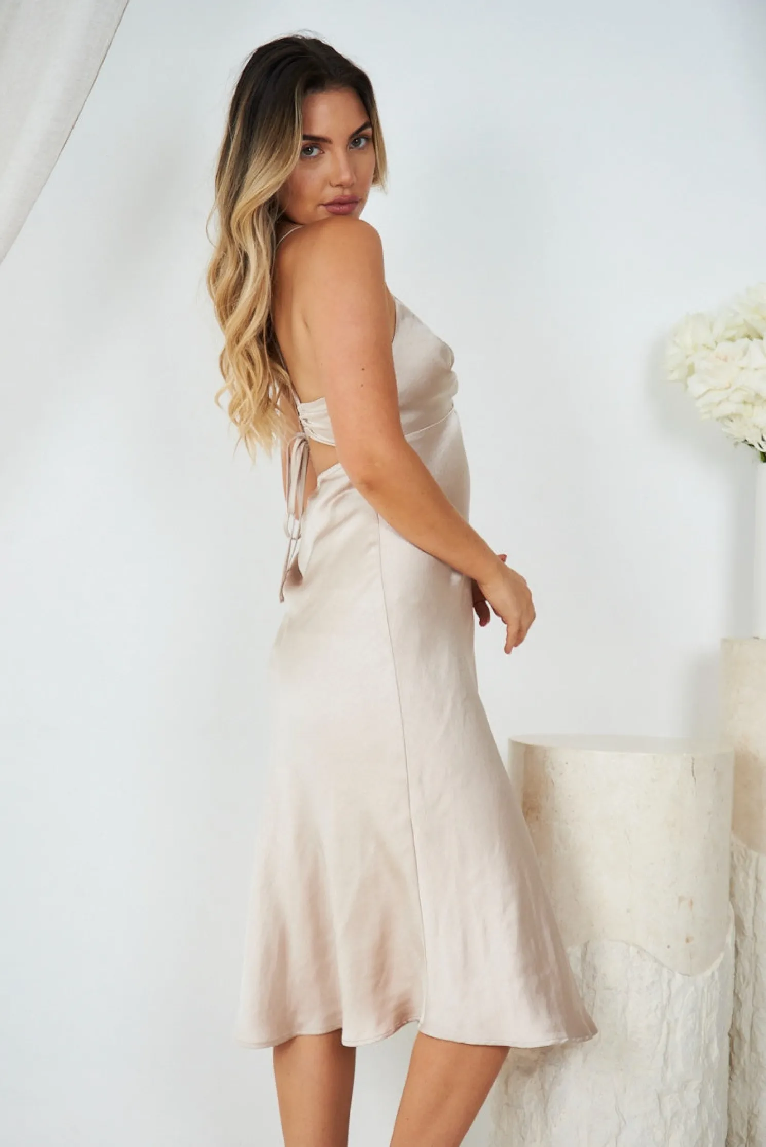 Our Keke Dress comes in a beautiful champagne tone. This slinky midi features a V neckline, twist and cut out detailing on the bust, adjustable spaghetti straps that cross over at the back, and open back with tie detailing. This romantic midi pairs beautifully with black strappy heels.