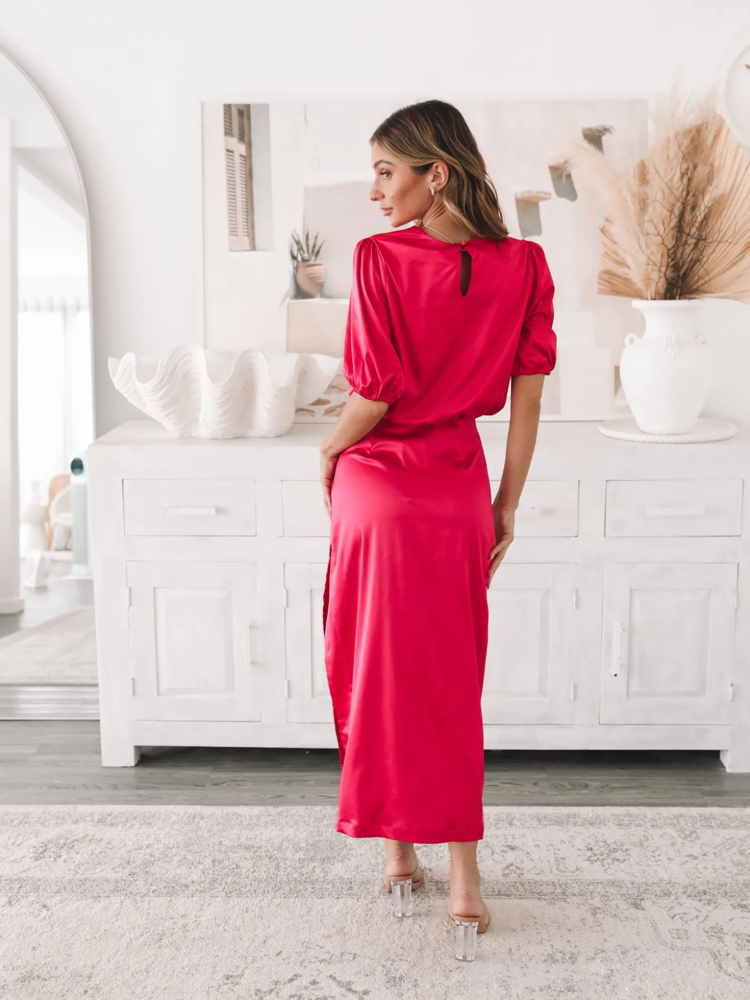 Our Kerize Top comes in a hot pink colour. Feel like a million bucks in this top that features a round neckline, short puff sleeves and crop length hem. Complete the look with our Krissa Skirt!