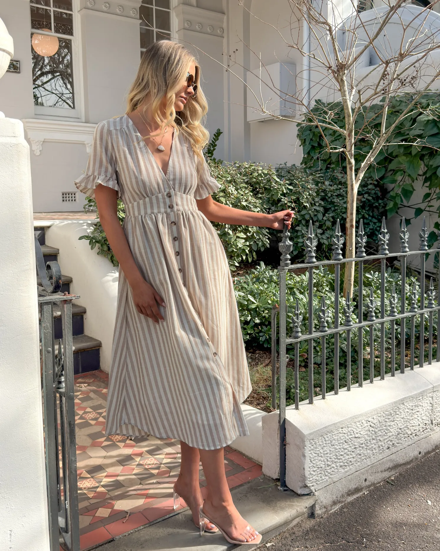 Our Korbel Dress comes in a beige base with white stripe prints. It’s a lovely medium weight linen material in a relaxed and effortless fit perfect for hot summer days & baby bumps. This breathable number features a v neckline with buttons on front making this not only feminine & flirty but ideal for maternity wear. The midi length is a conservative feature you’re sure to appreciate on windy days. The frill detail on the short sleeves is a cute addition. Pair with your fave strappy sandals and straw bag for a great picnic or beach outfit.
