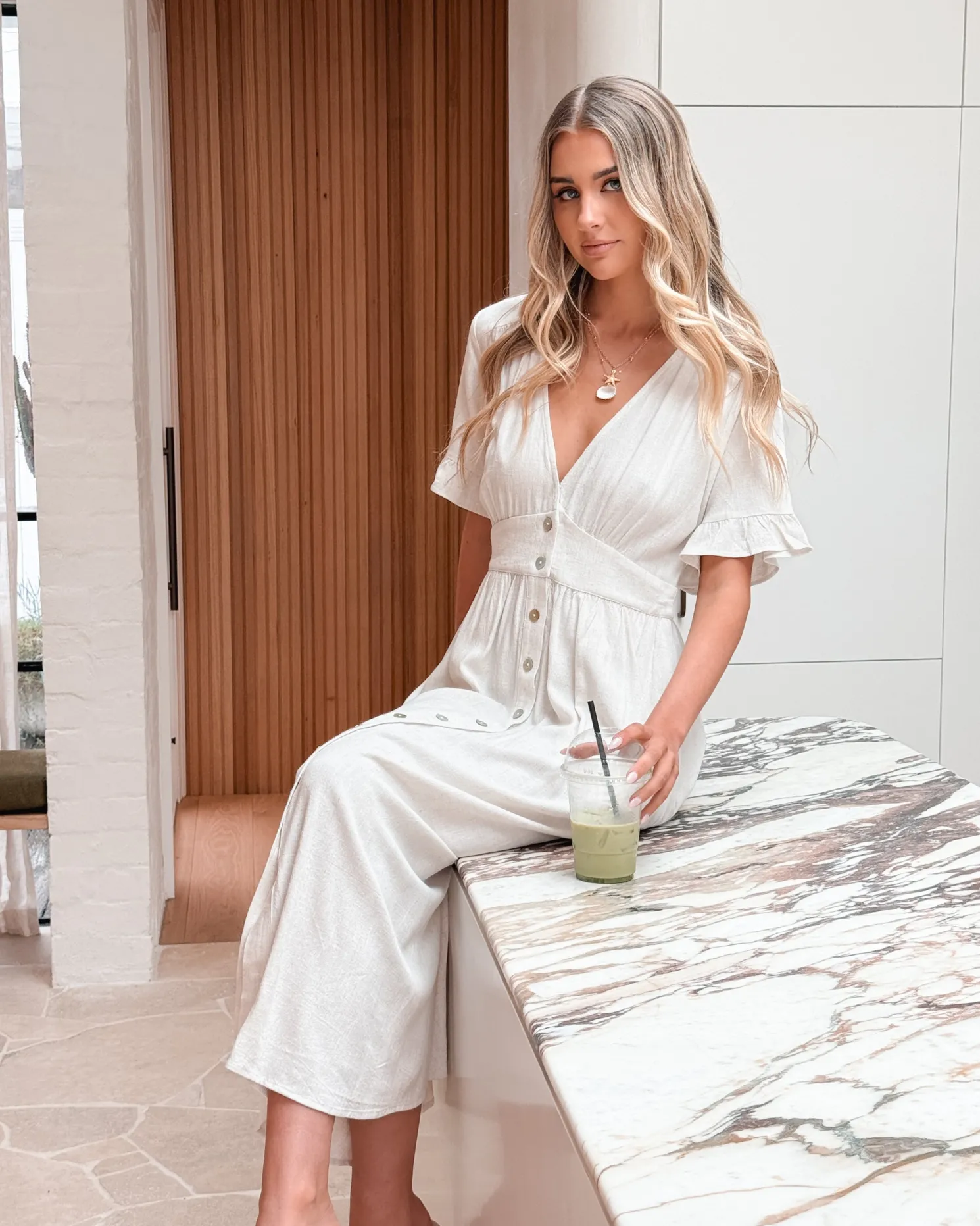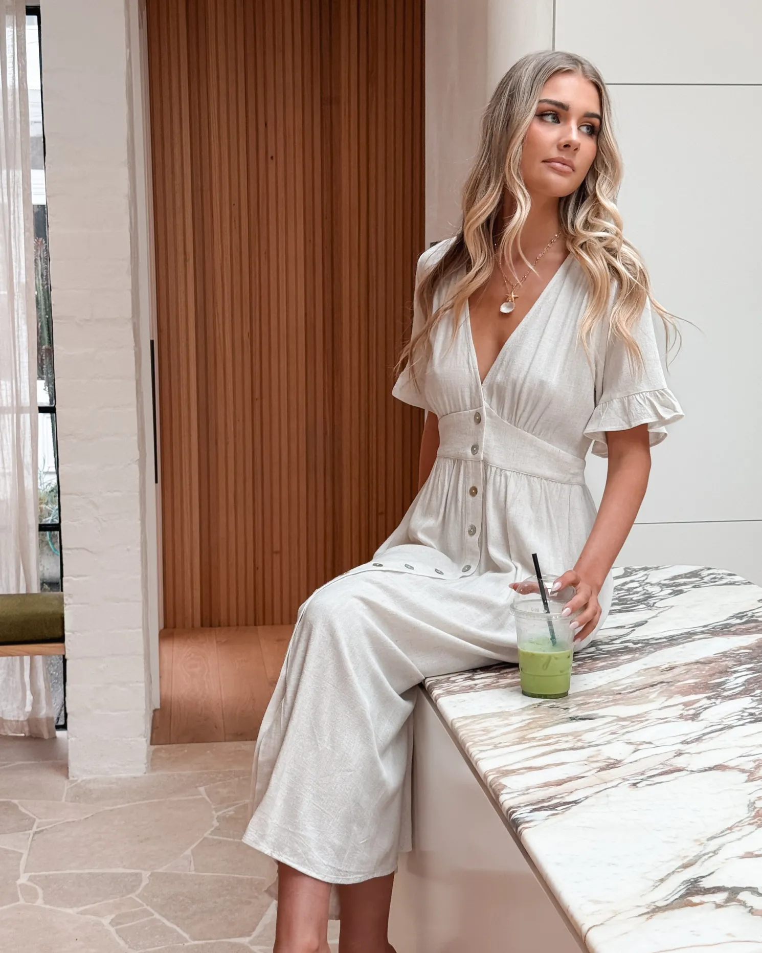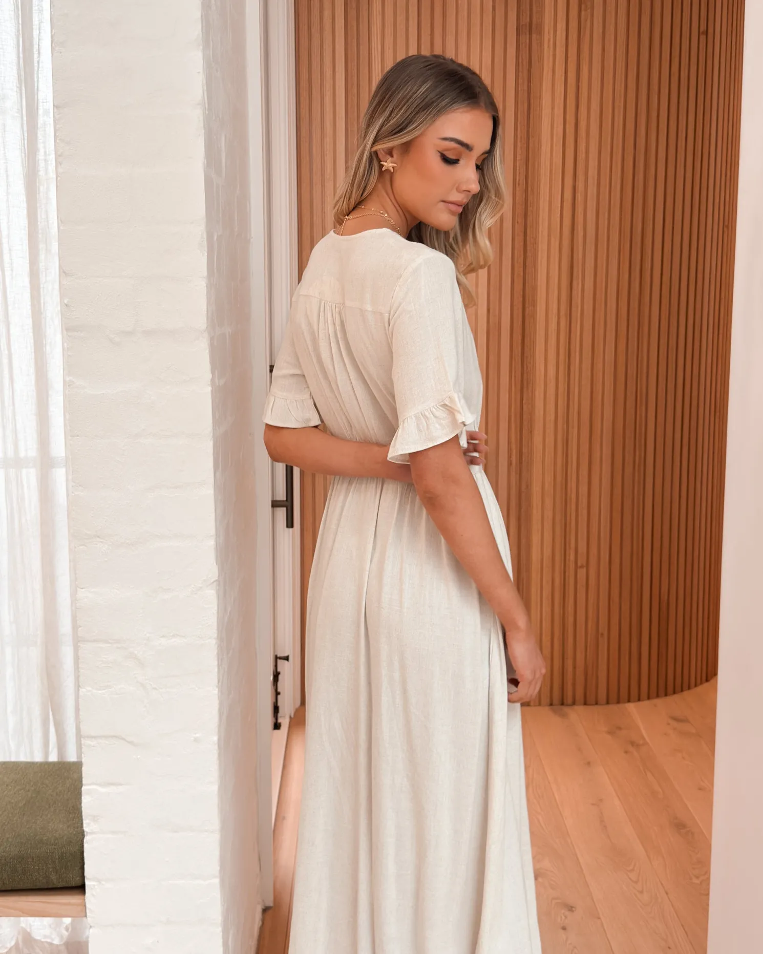 Our Korbela Dress is a neutral beige tone. It’s a lovely medium weight linen material in a relaxed and effortless fit perfect for hot summer days & baby bumps. This breathable number features a v neckline with buttons on front making this not only feminine & flirty but ideal for maternity wear. The midi length is a conservative feature you’re sure to appreciate on windy days. The frill detail on the short sleeves is a cute addition. Pair with your fave strappy sandals and straw bag for a great picnic or beach outfit.