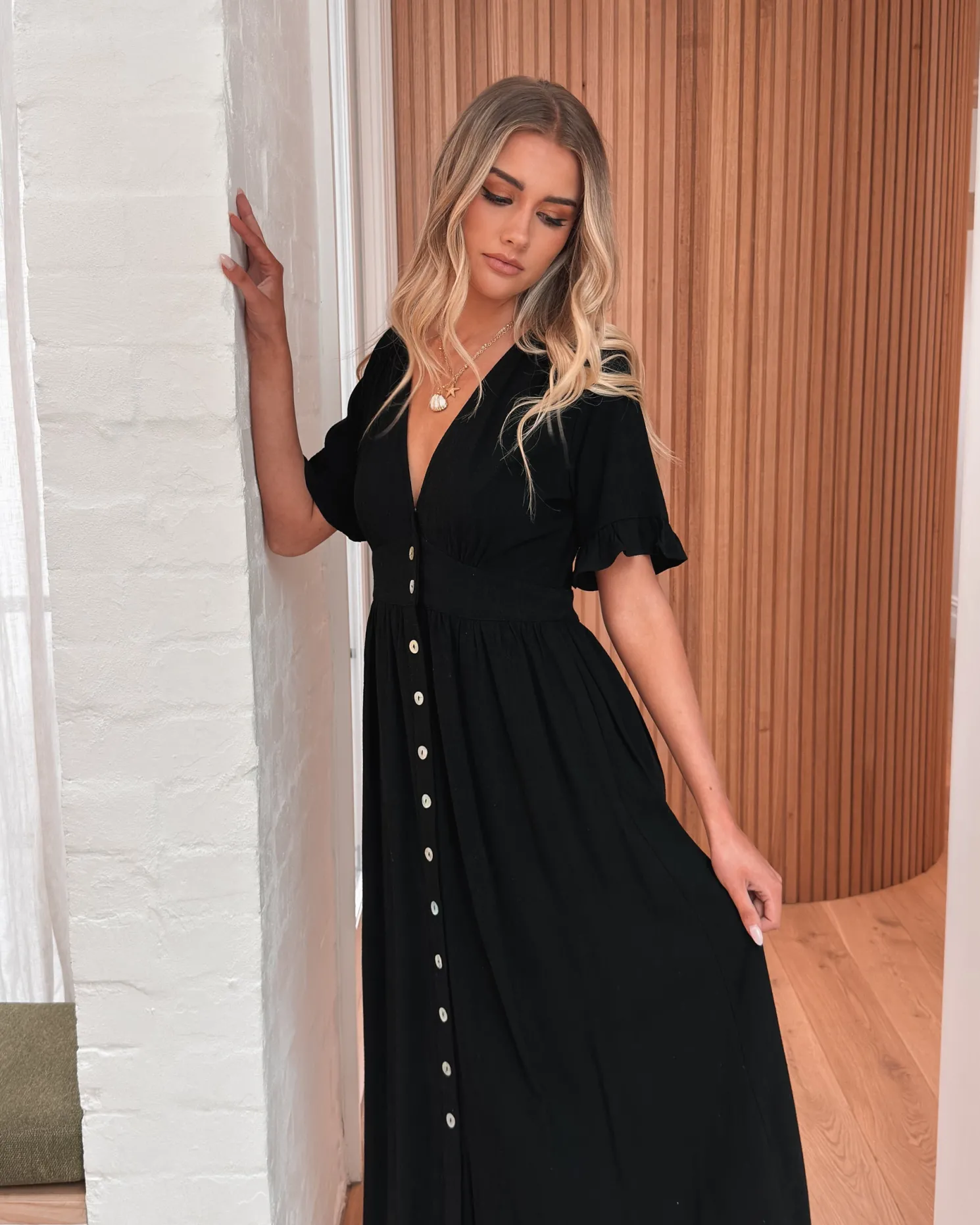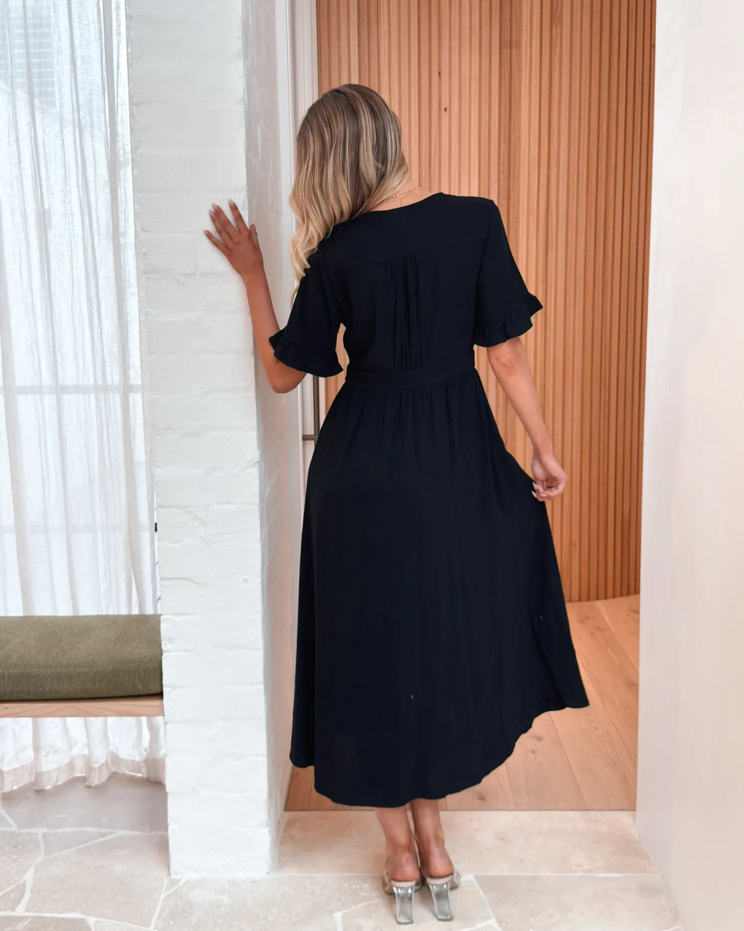 Our Korbela Dress is a classic black tone. It’s a lovely medium weight linen material in a relaxed and effortless fit perfect for hot summer days & baby bumps. This breathable number features a v neckline with buttons on front making this not only feminine & flirty but ideal for maternity wear. The midi length is a conservative feature you’re sure to appreciate on windy days. The frill detail on the short sleeves is a cute addition. Pair with your fave strappy sandals and straw bag for a great picnic or beach outfit.
