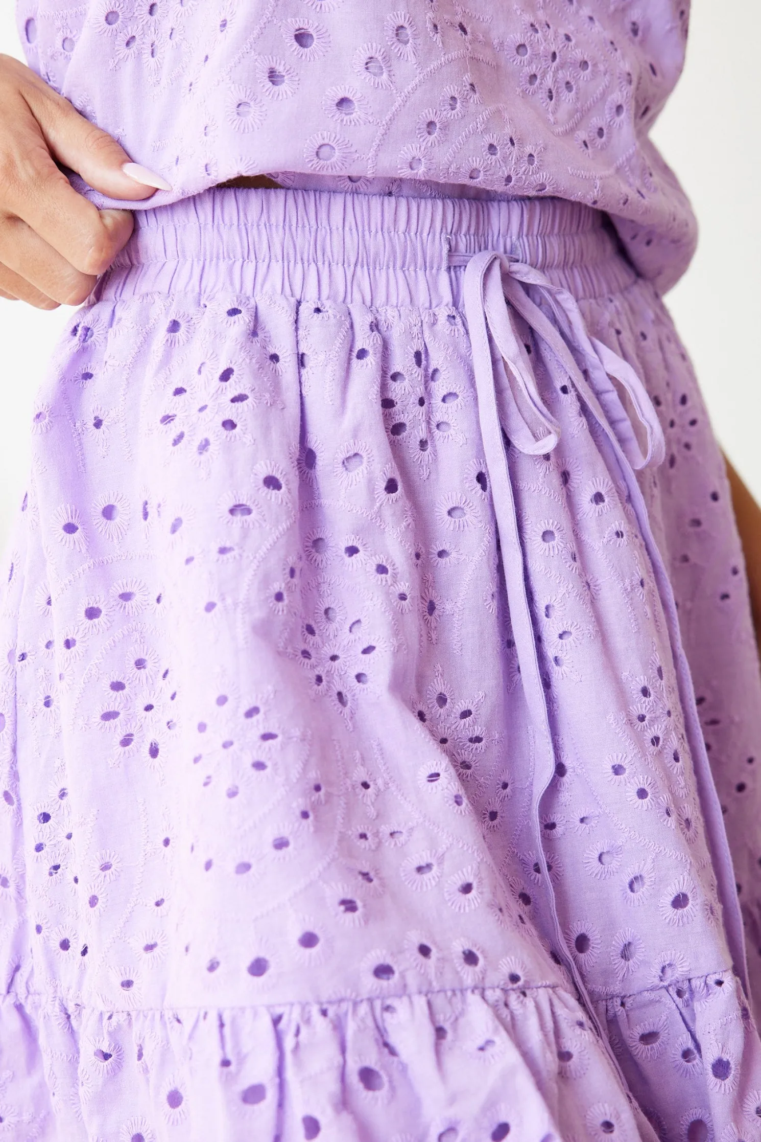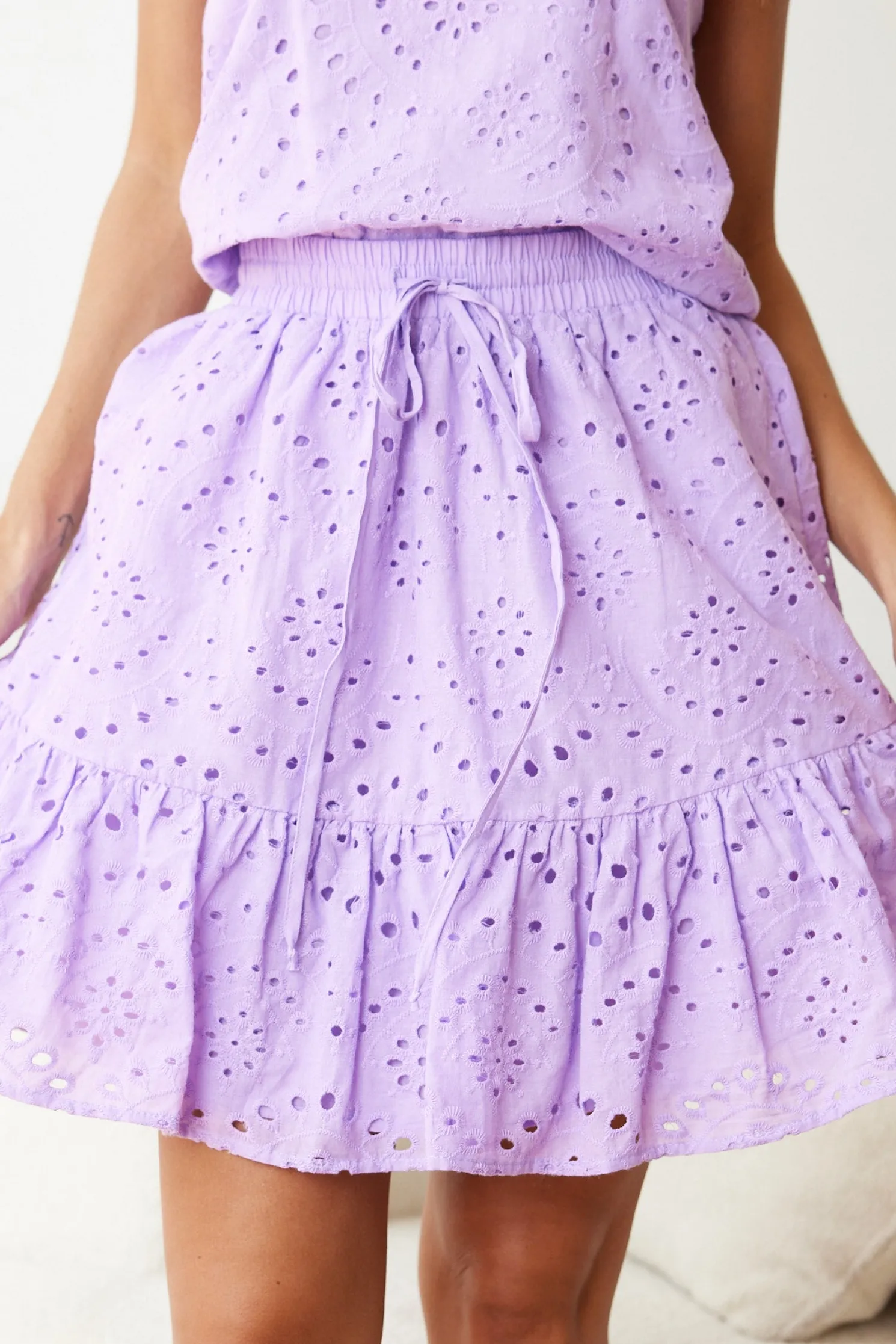 Our Krinna Skirt comes in a lilac colour. Stun in all shades of loveliness with this mini that features a waist string, a-line silhouette, tiered design and flowy style. Complete the look with our Kendria Top!