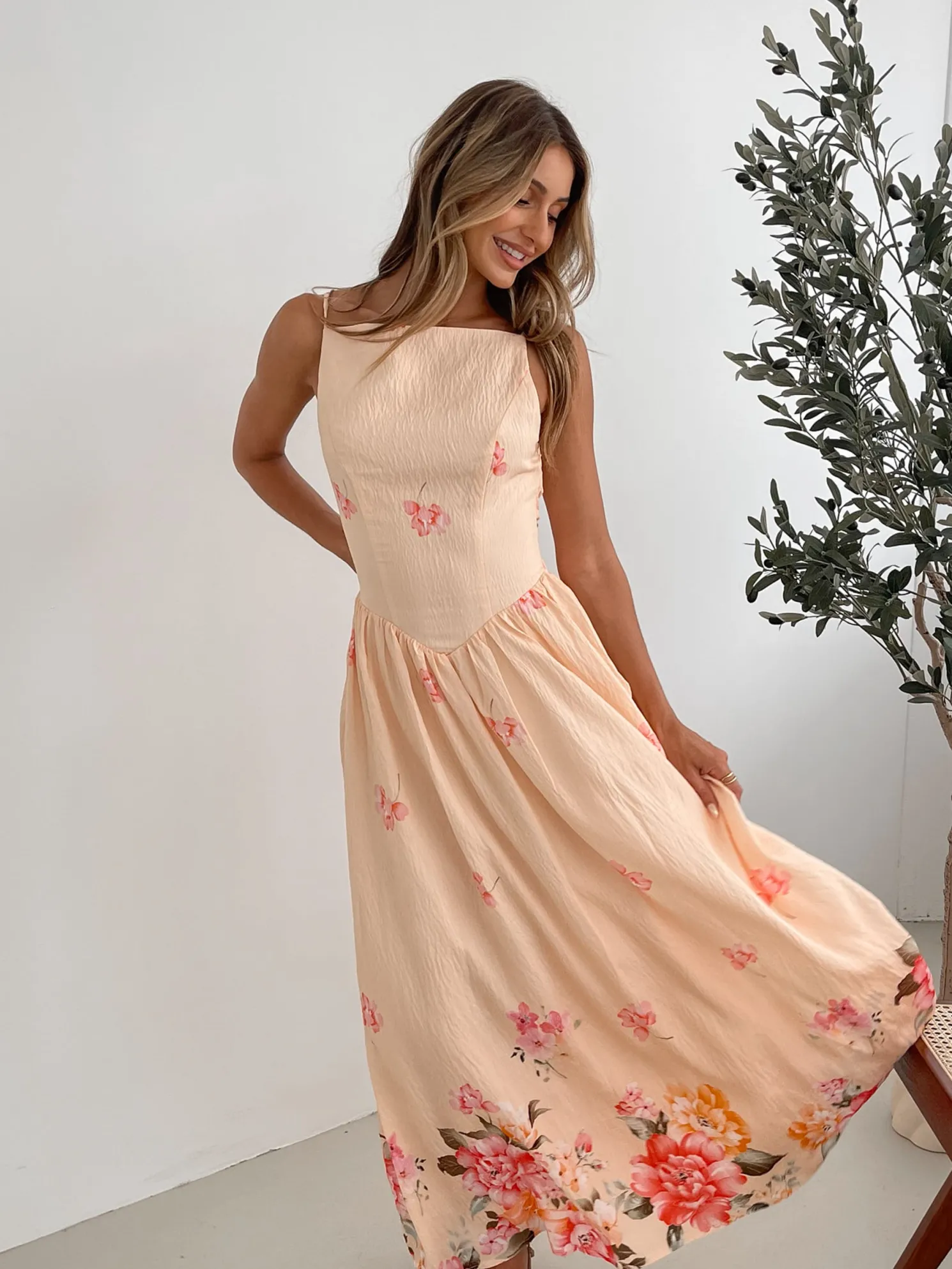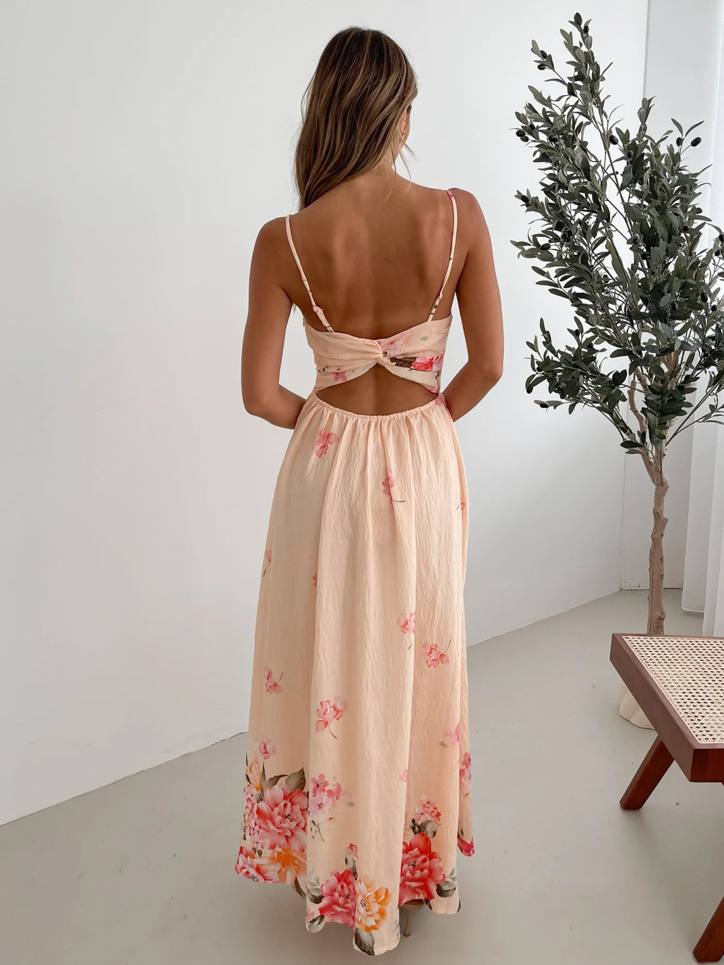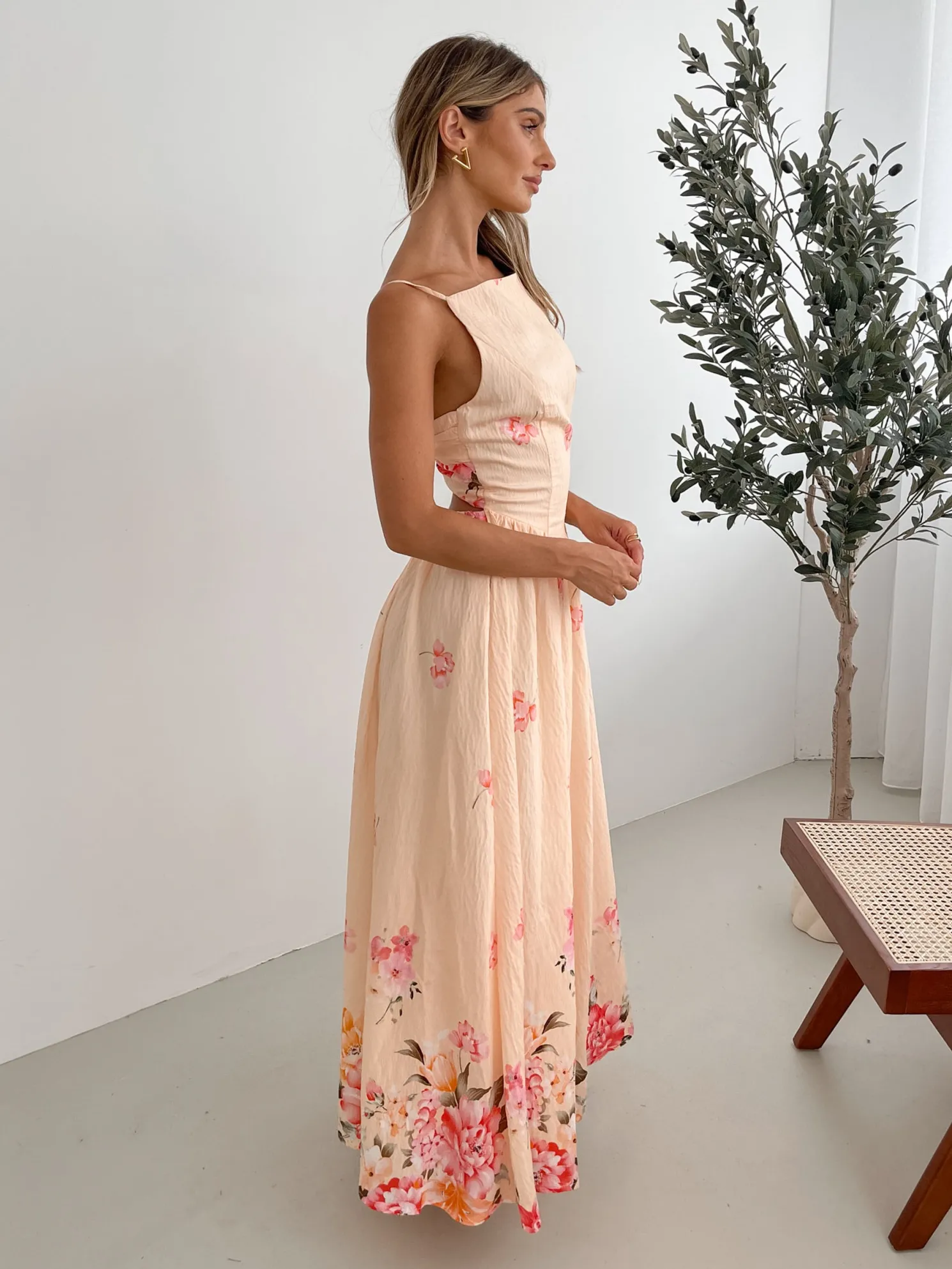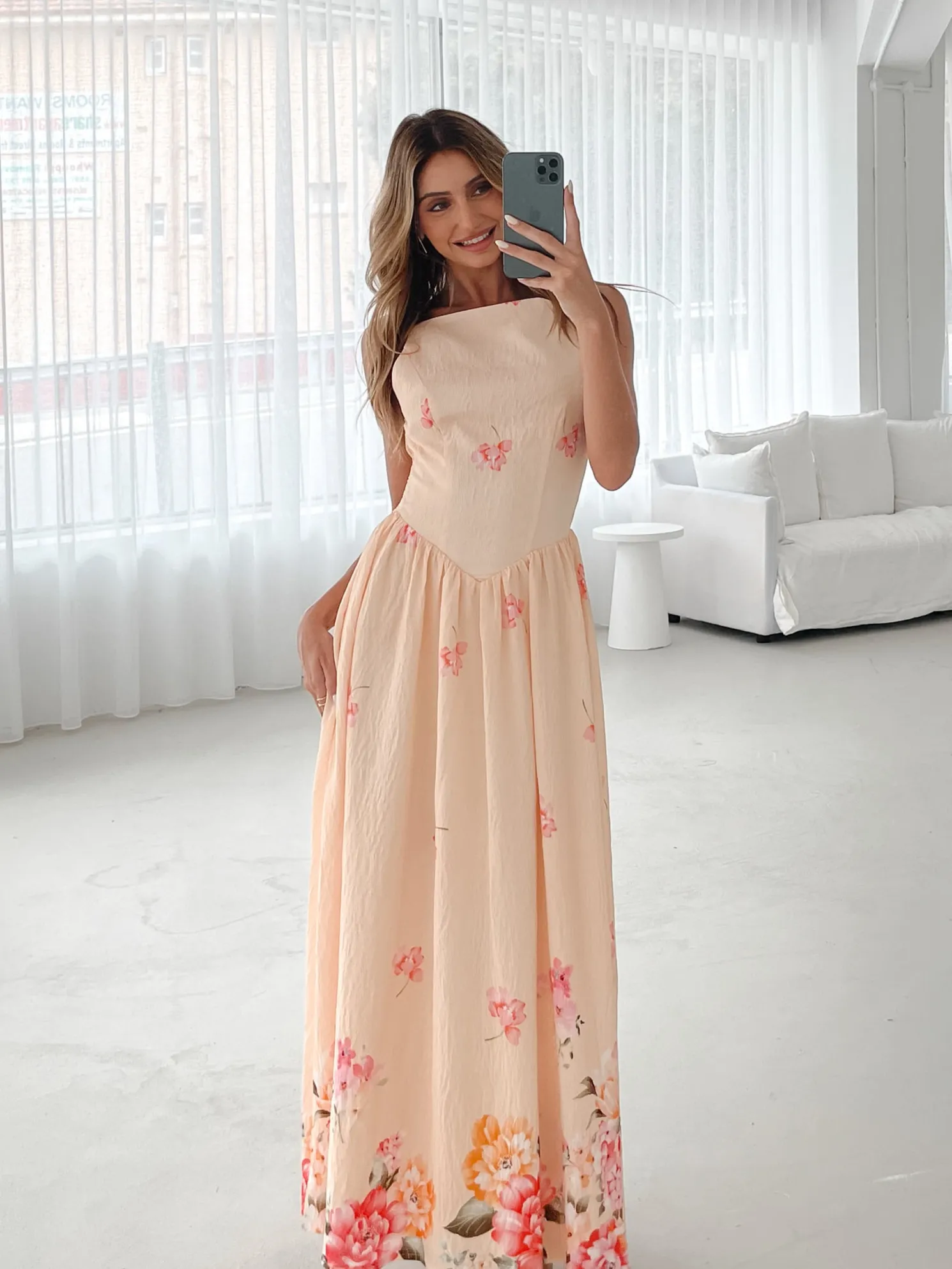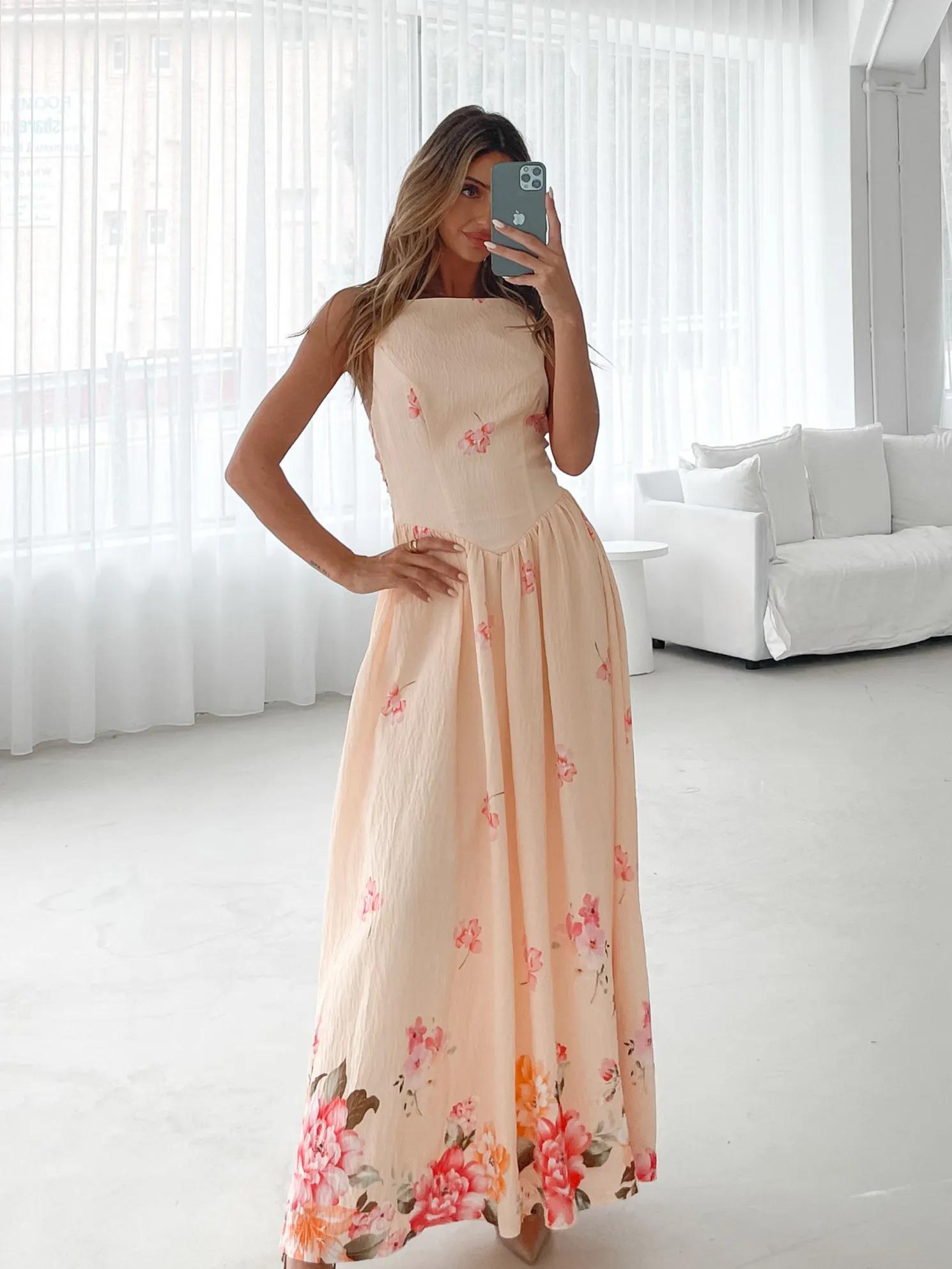 Our Latosha Dress comes in a creamy base with pink and green floral prints. Bask in blooming elegance with this piece that features slim straps, boat neckline, flowy skirt and maxi length hem. Evoke the beauty of a spring garden with flower-shaped earrings!