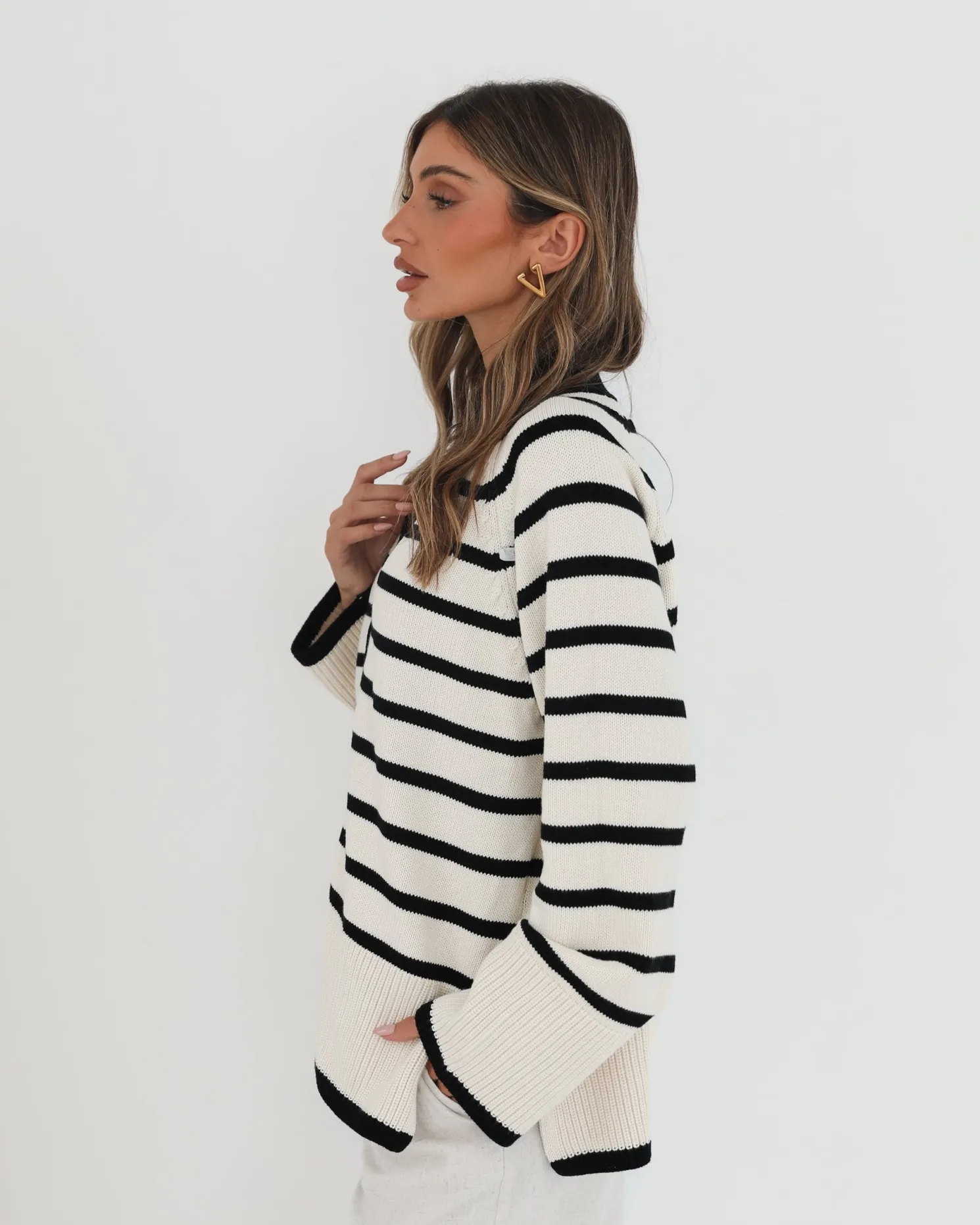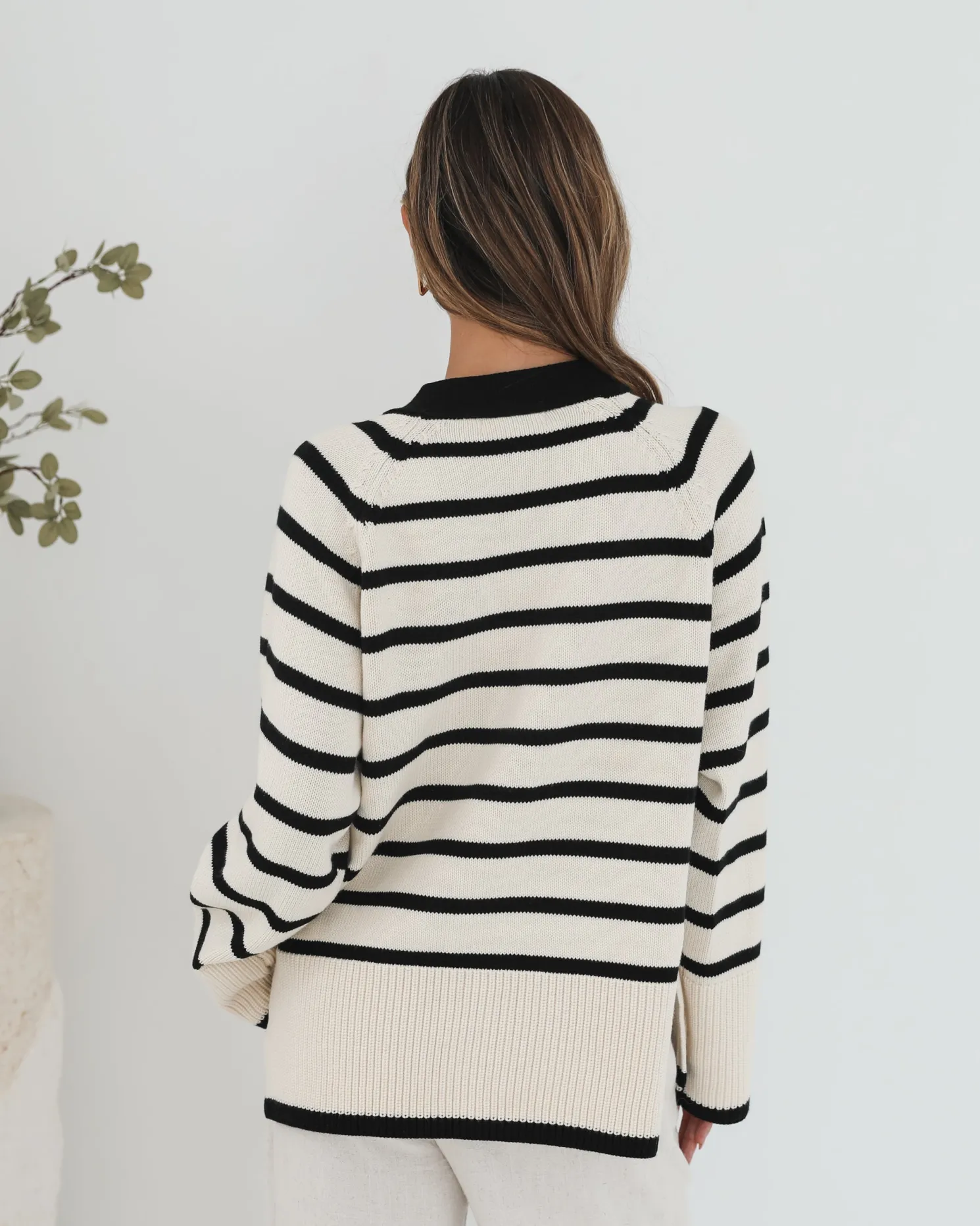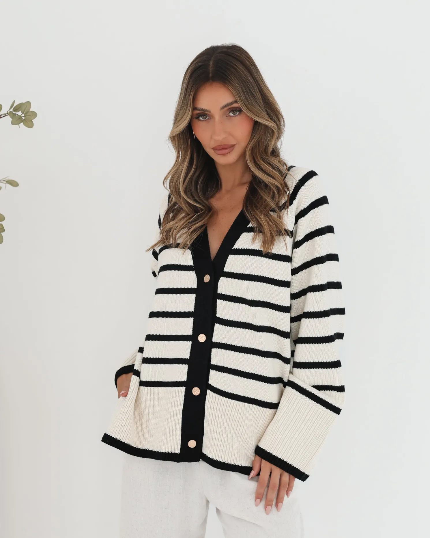 Our Levara Cardigan comes in a cream base with black stripe prints. Bringing in warmth without bulk, this piece will be your next favourite transitional piece with its centre-front buttons, low v-neckline, long sleeves and relaxed fit. Style it with a fitted bodysuit and high-waisted jeans for a sleek off-duty look!