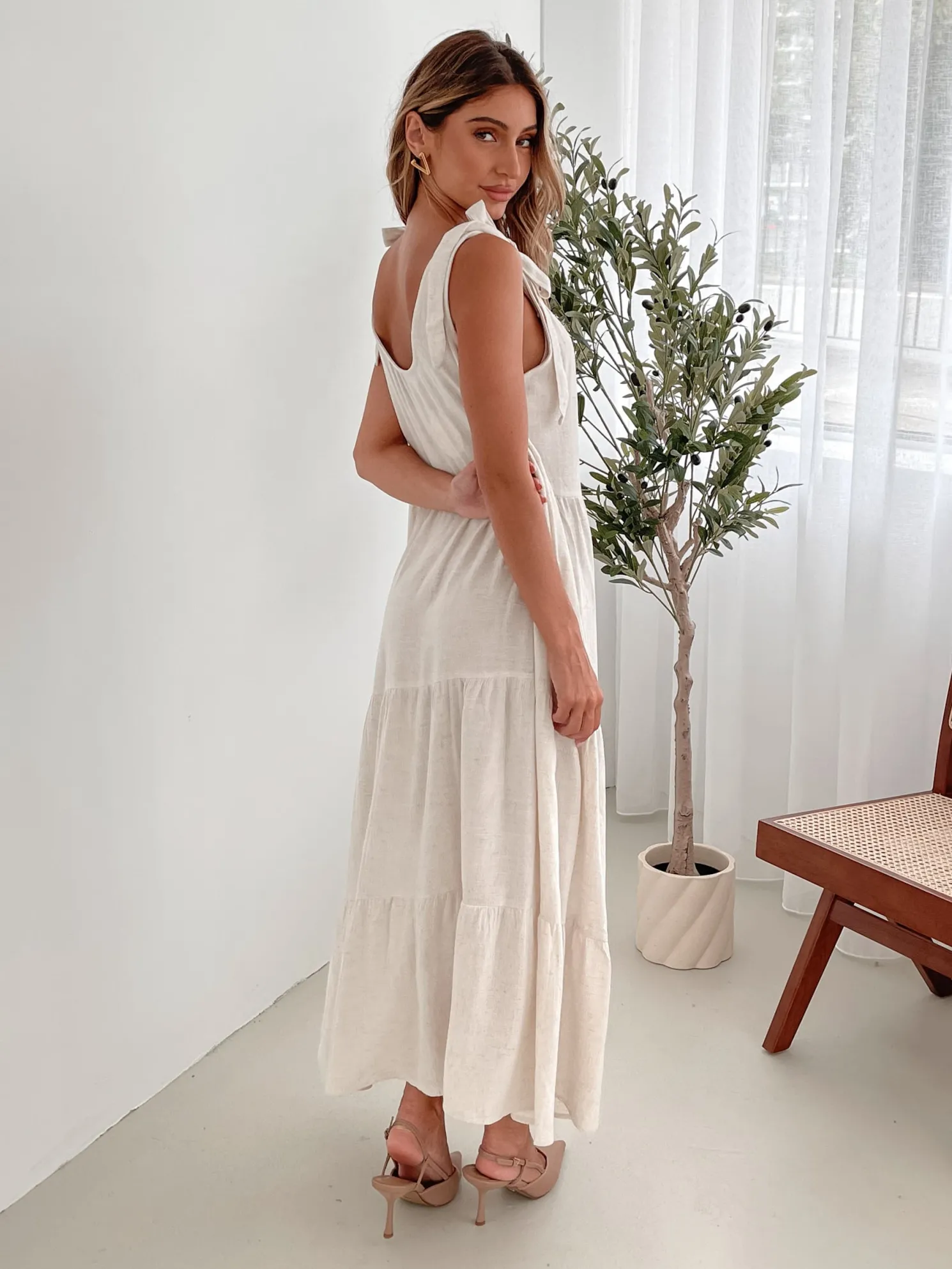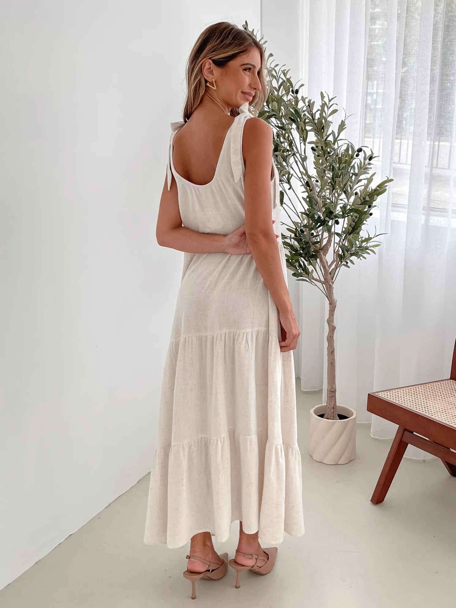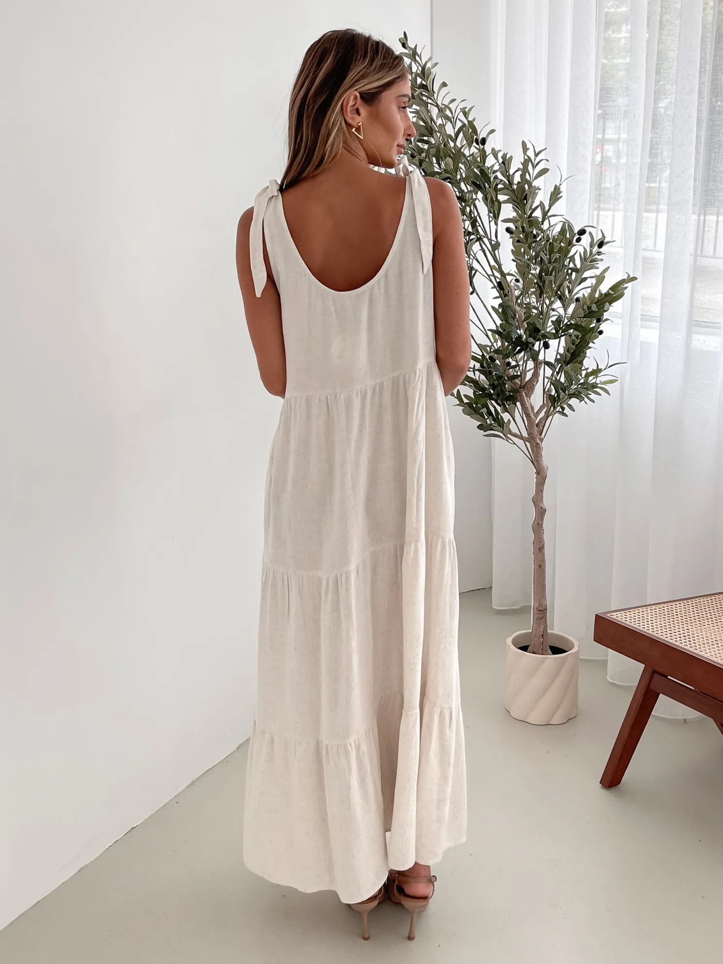 Our Lydia Dress comes in a beige tone. This relaxed midi features a scoop neckline, tie detailing on the shoulder straps, and a tiered skirt with gathered detailing. Paired with a sunhat and tan sandals, this piece is perfect for a balmy day look!