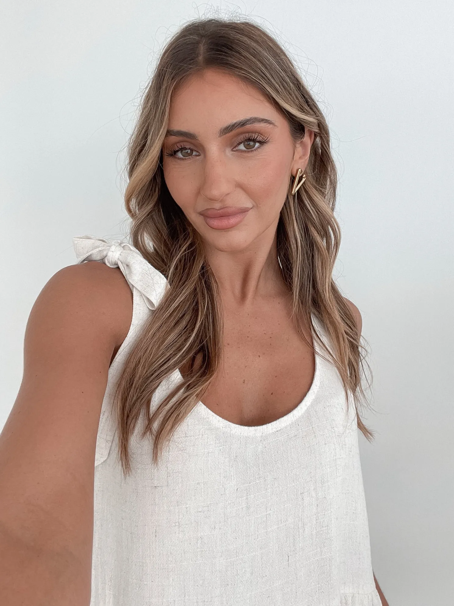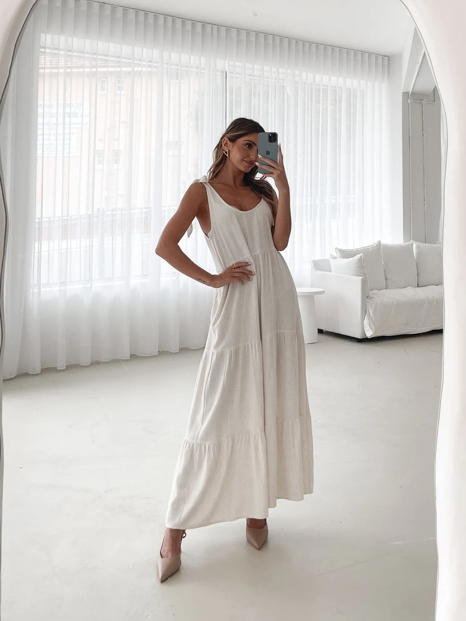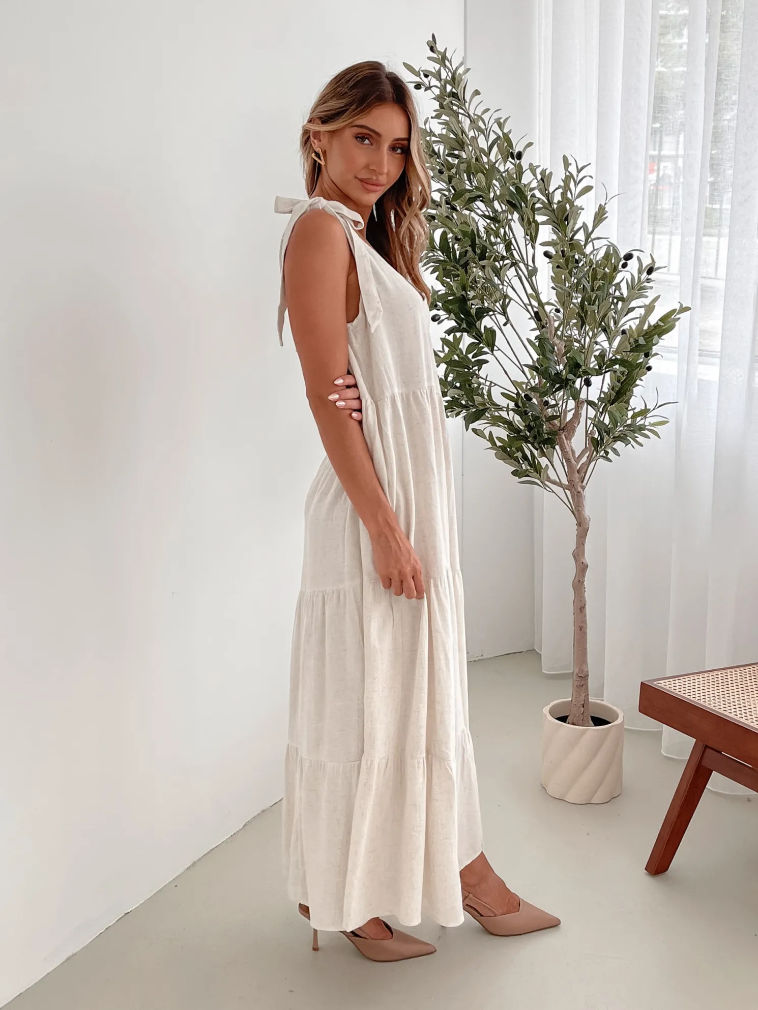 Our Lydia Dress comes in a beige tone. This relaxed midi features a scoop neckline, tie detailing on the shoulder straps, and a tiered skirt with gathered detailing. Paired with a sunhat and tan sandals, this piece is perfect for a balmy day look!