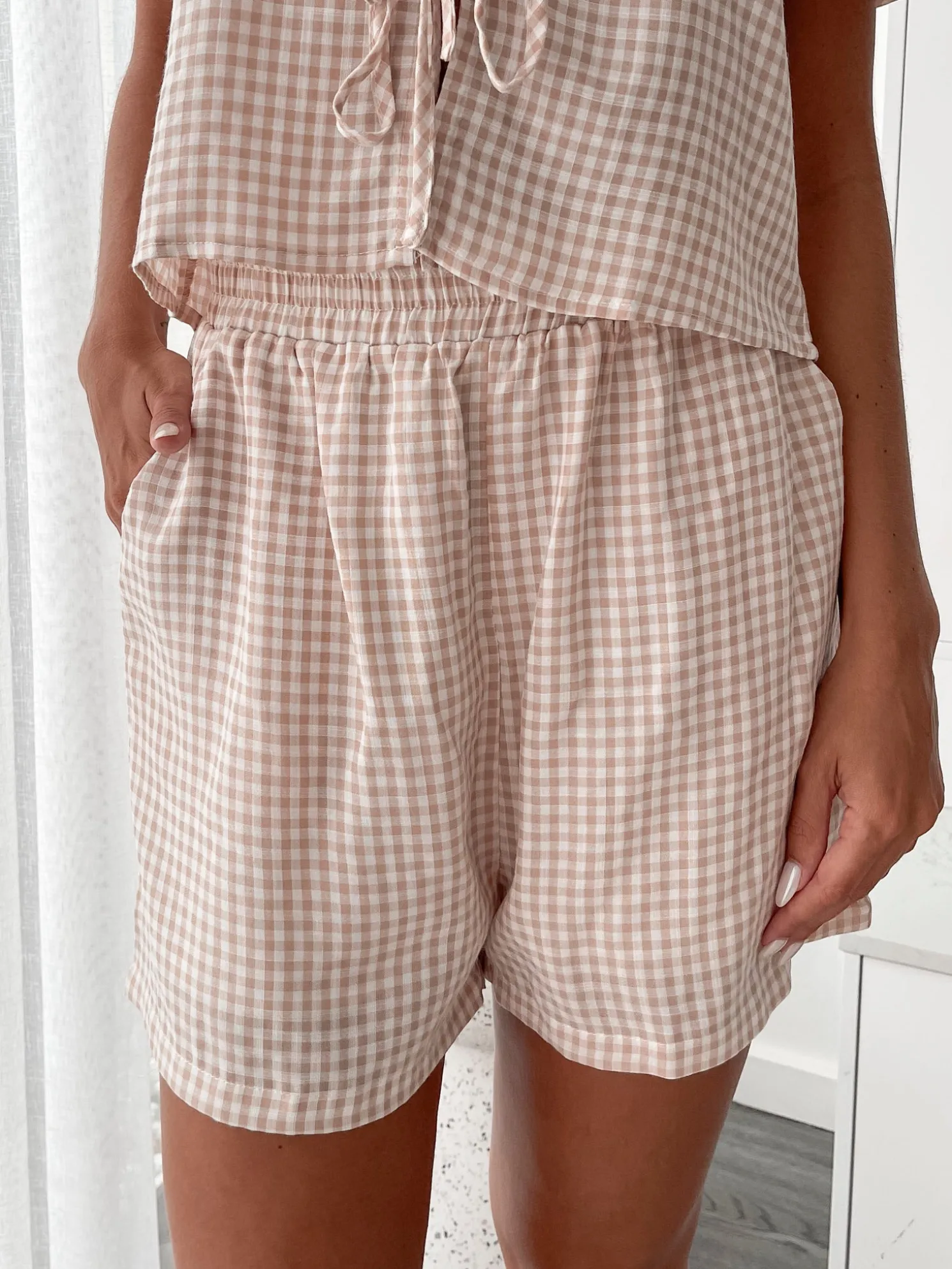 Our Lyricia Shorts come in beige and white tones. For your urban chic adventures, this piece is high waisted and features and semi relaxed fit and thigh length hem. Complete the look with our Lyricia Top!