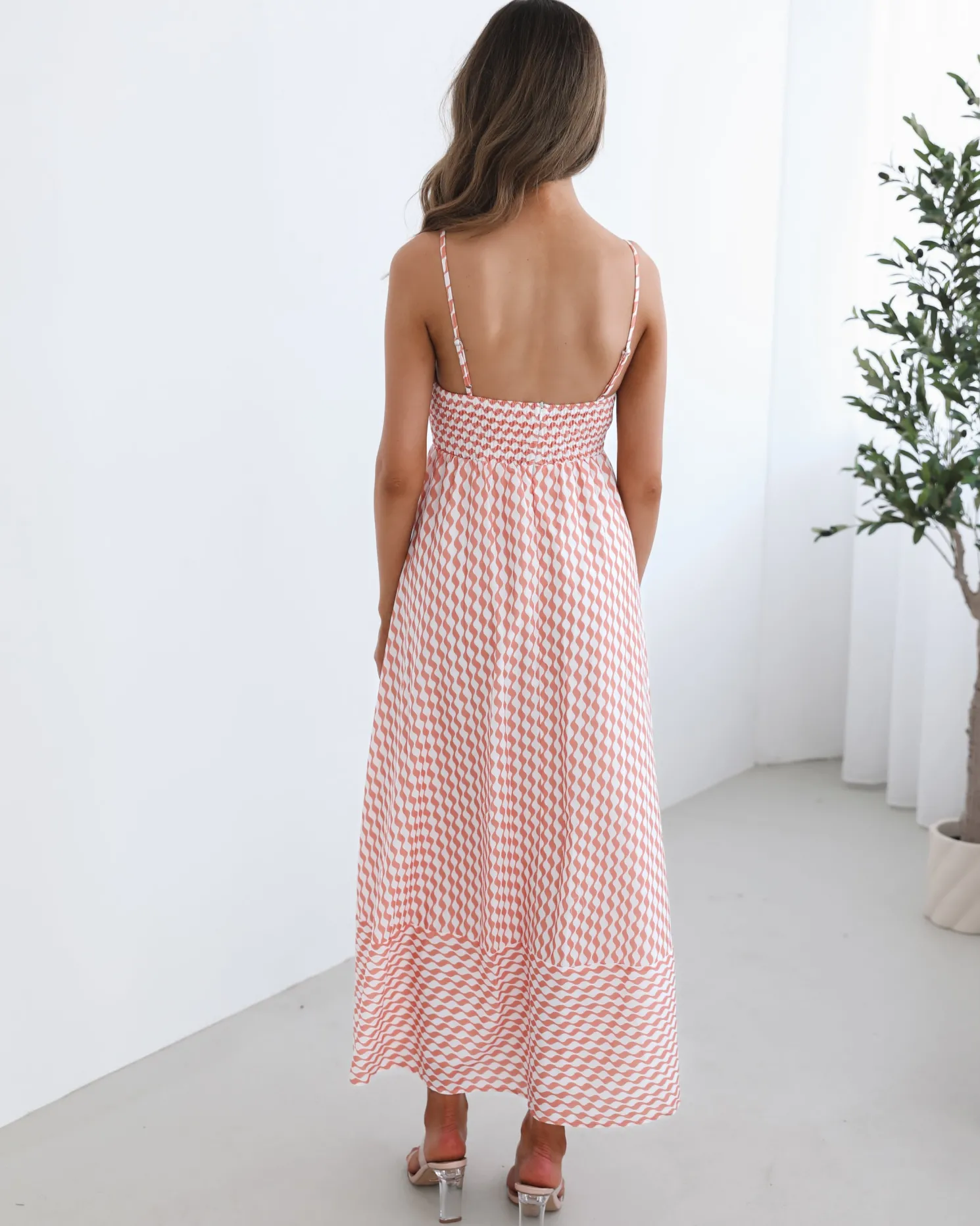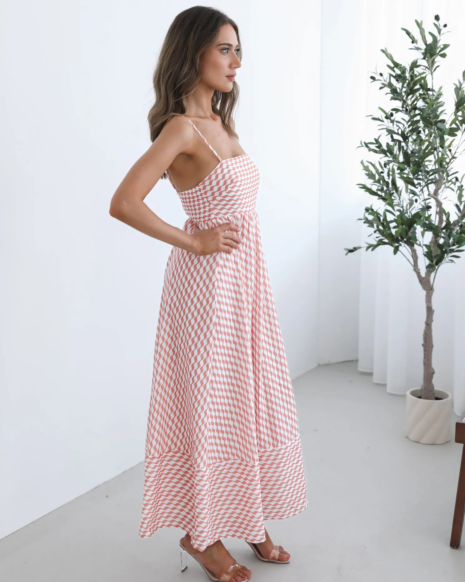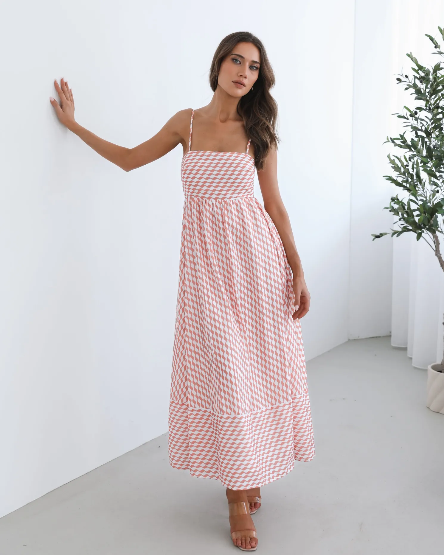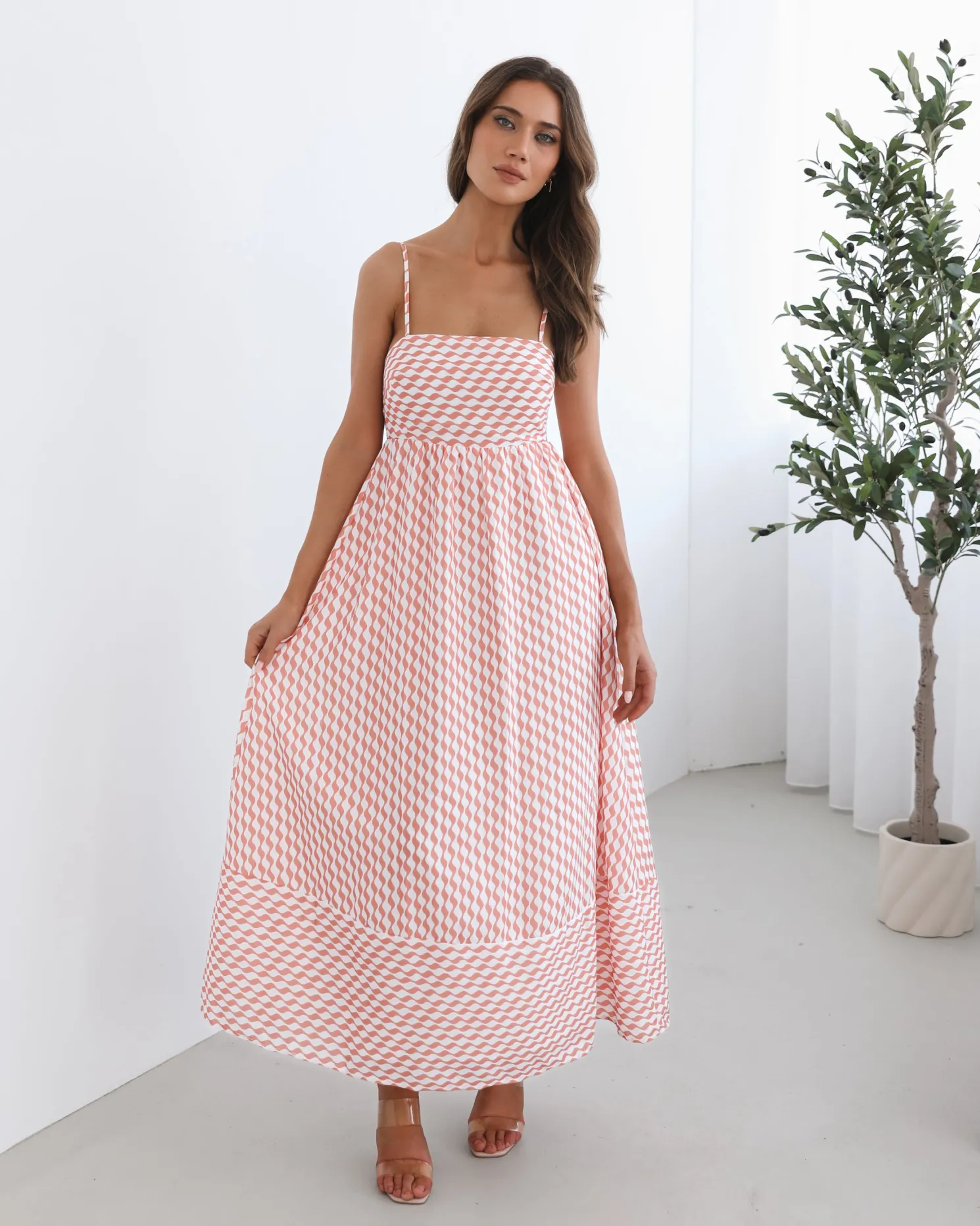 Our Nelani Dress comes in orange and white tones. Whether you’re dancing at a summer festival or sipping cocktails at sunset, this piece is your ultimate outfit for bringing the heat with its gorgeous pattern, spaghetti straps, square neckline, flowy skirt and maxi length hem. Carry a straw tote bag to add that perfect summery touch!