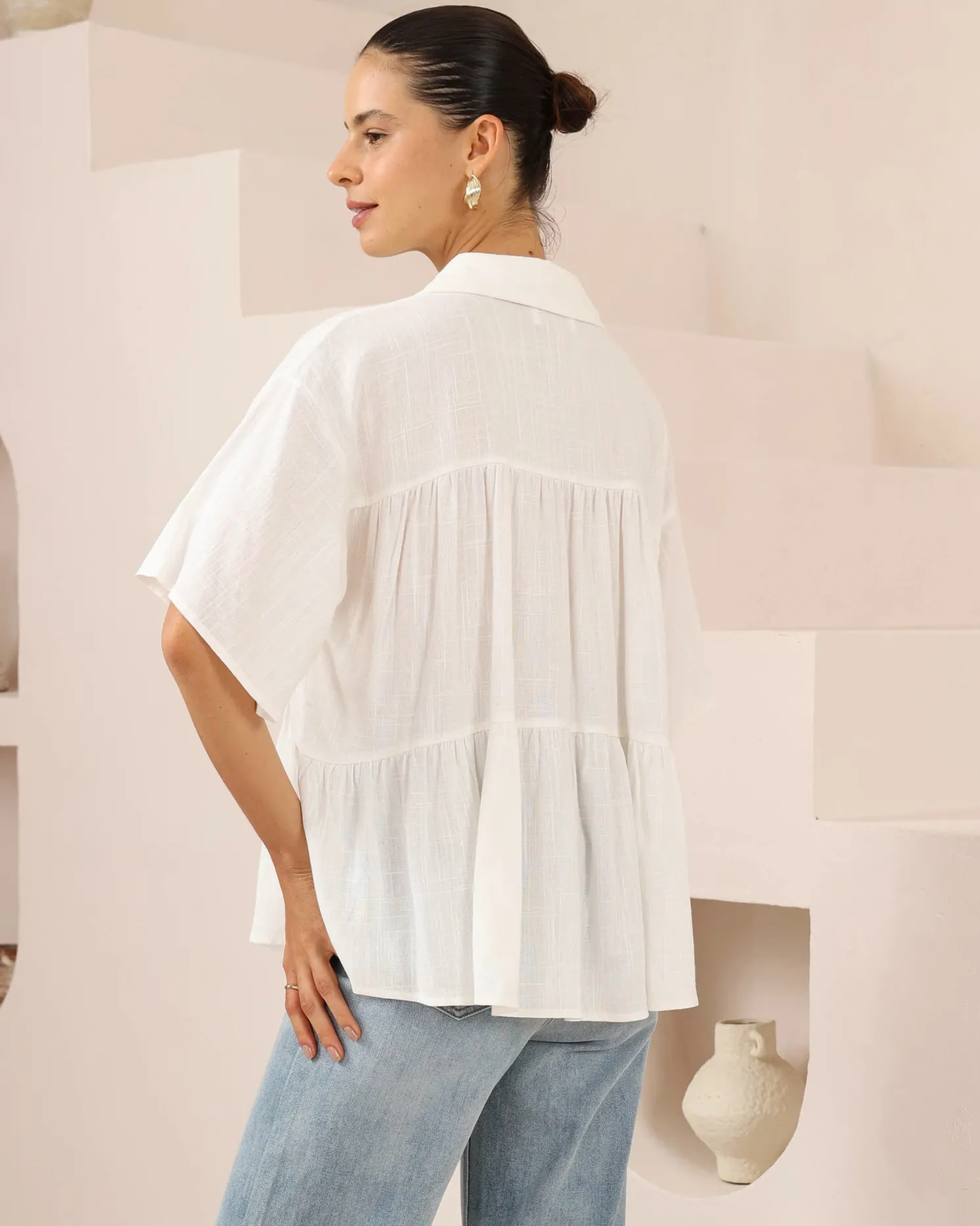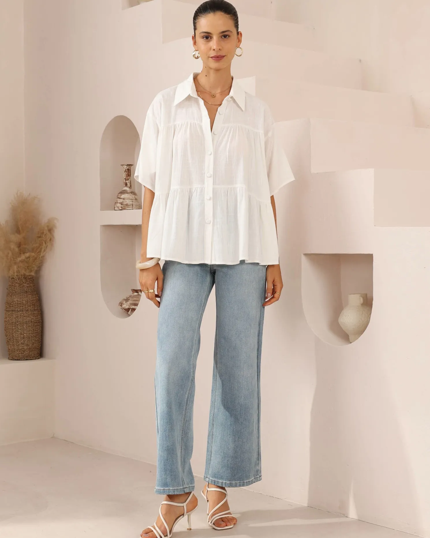 Our Nymeraine Blouse comes in a white colour. The top that doesn’t try too hard but always lands just right, this piece features a collar, elbow length sleeves, centre-front buttons and relaxed silhouette. Match it with high-waisted straight jeans and a messy low bun!