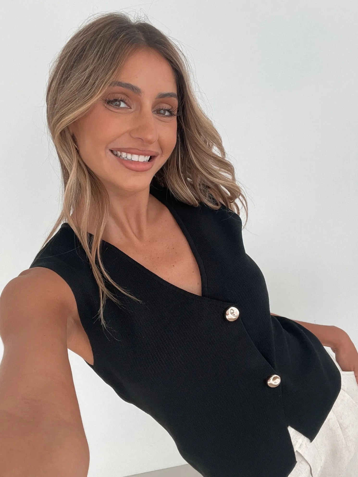 Our Odessa Knit Top comes in a black colour. Elevating classic to a new level of sophistication, this vest top features a v-neckline, centre-front buttons and semi-relaxed fit. For a smart-casual twist, tuck it into tailored trousers and pair with leather loafers!