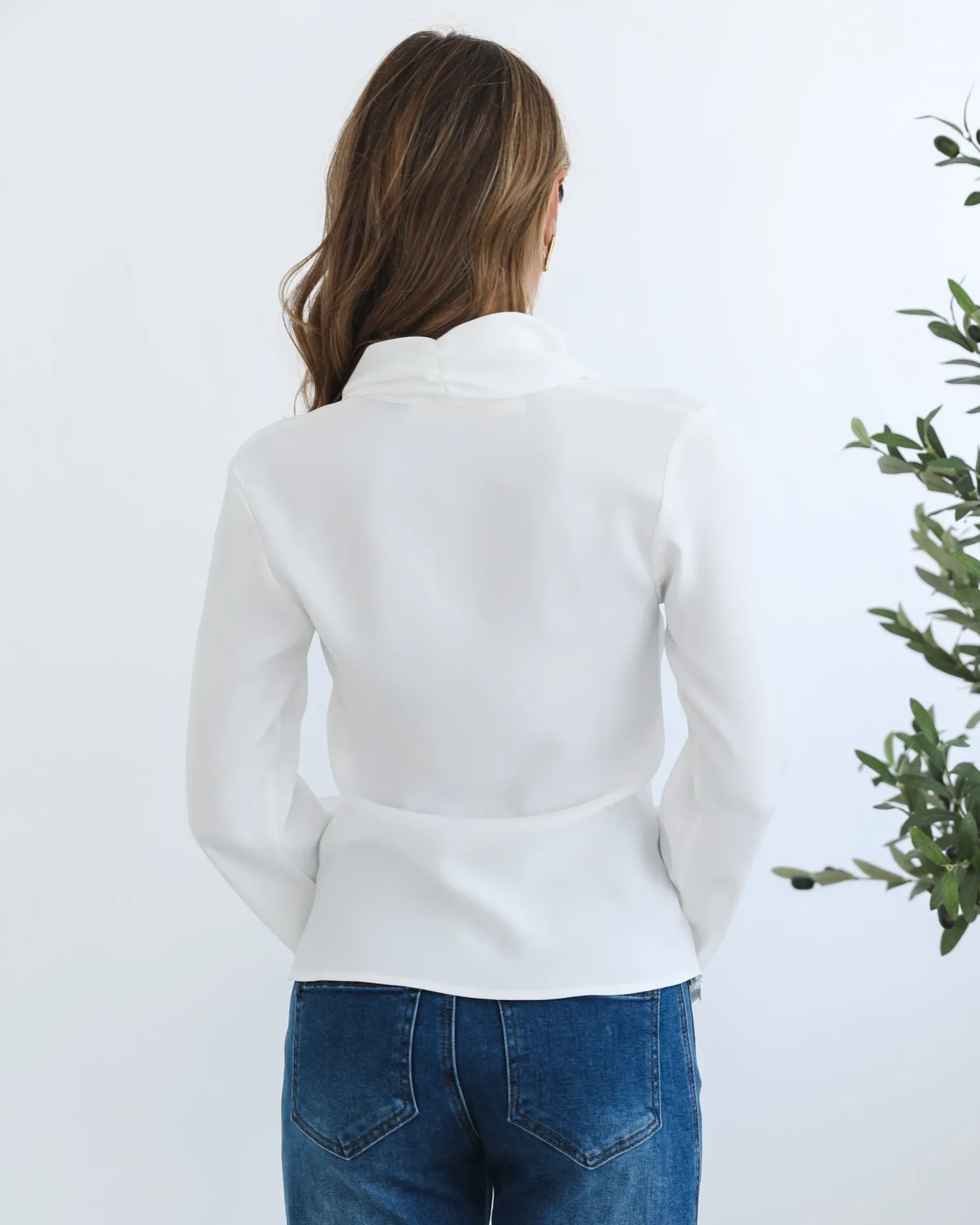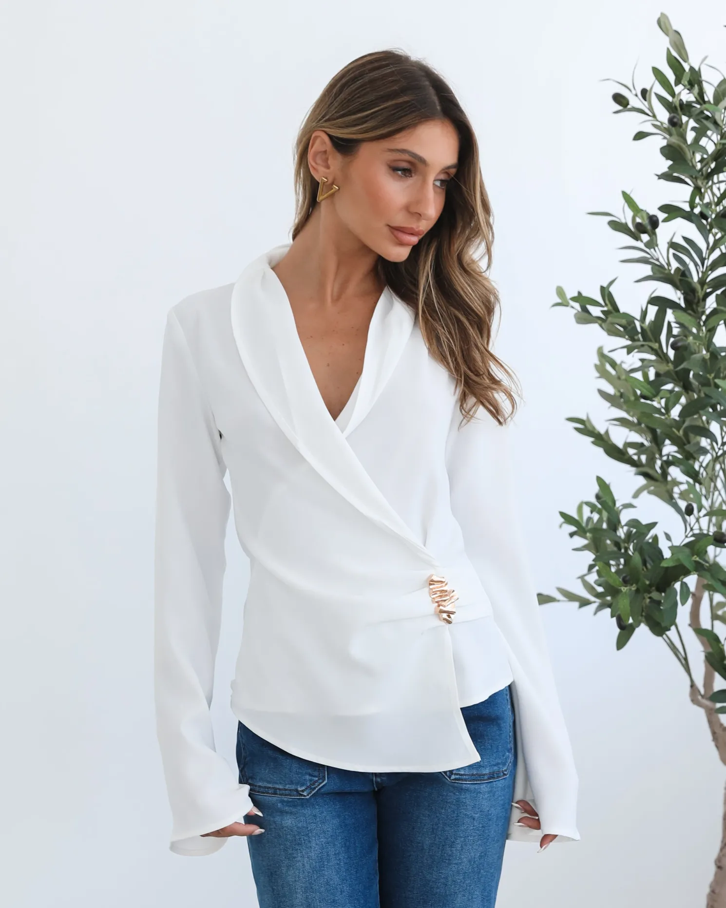 Our Odissa Top comes in white and gold tones. The epitome of effortless refinement, this number is designed with a v-neckline, long sleeves and gold detailing. Pair it with ailored trousers and pointed-toe heels for a sleek, power-dressing moment!