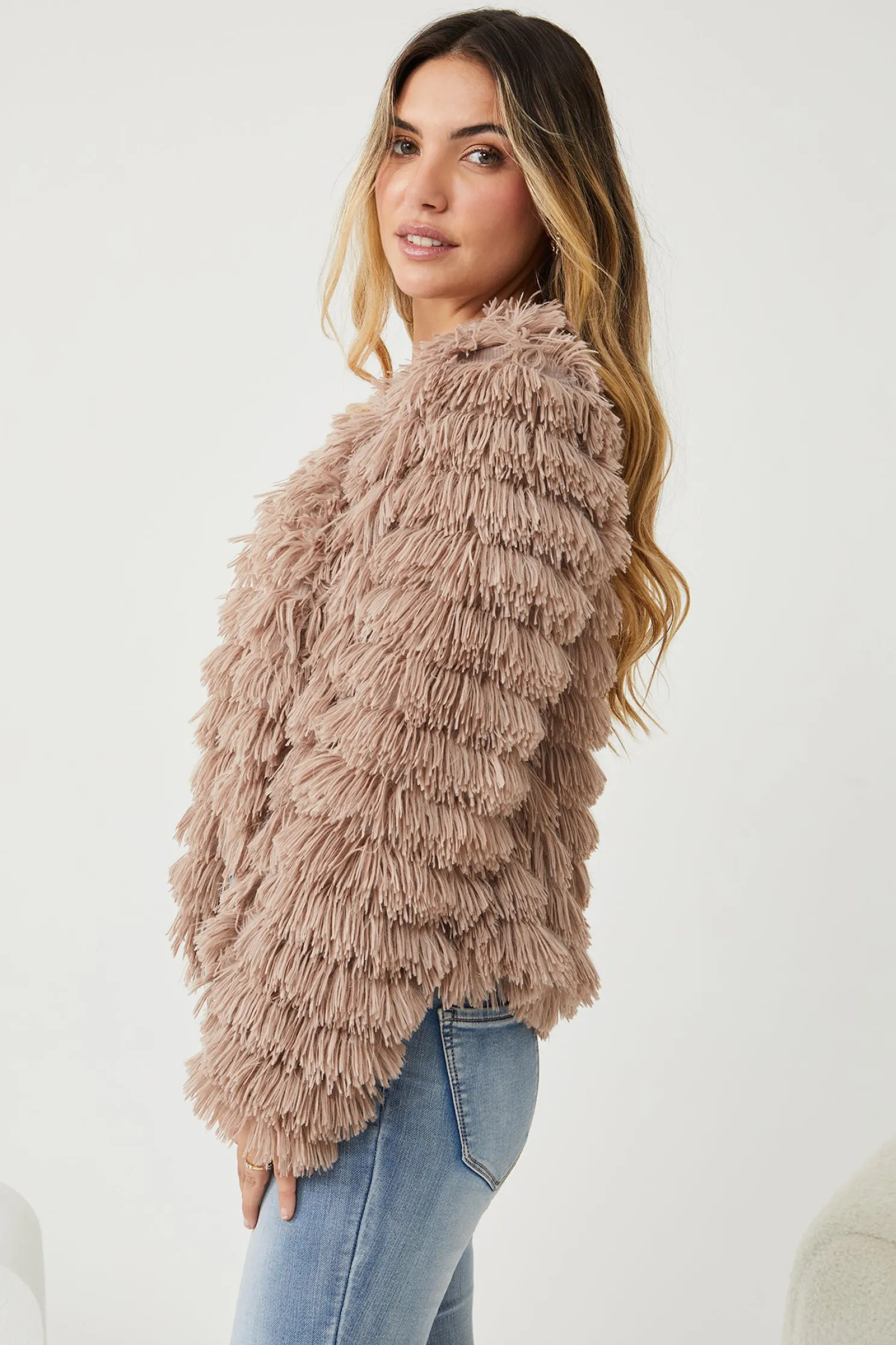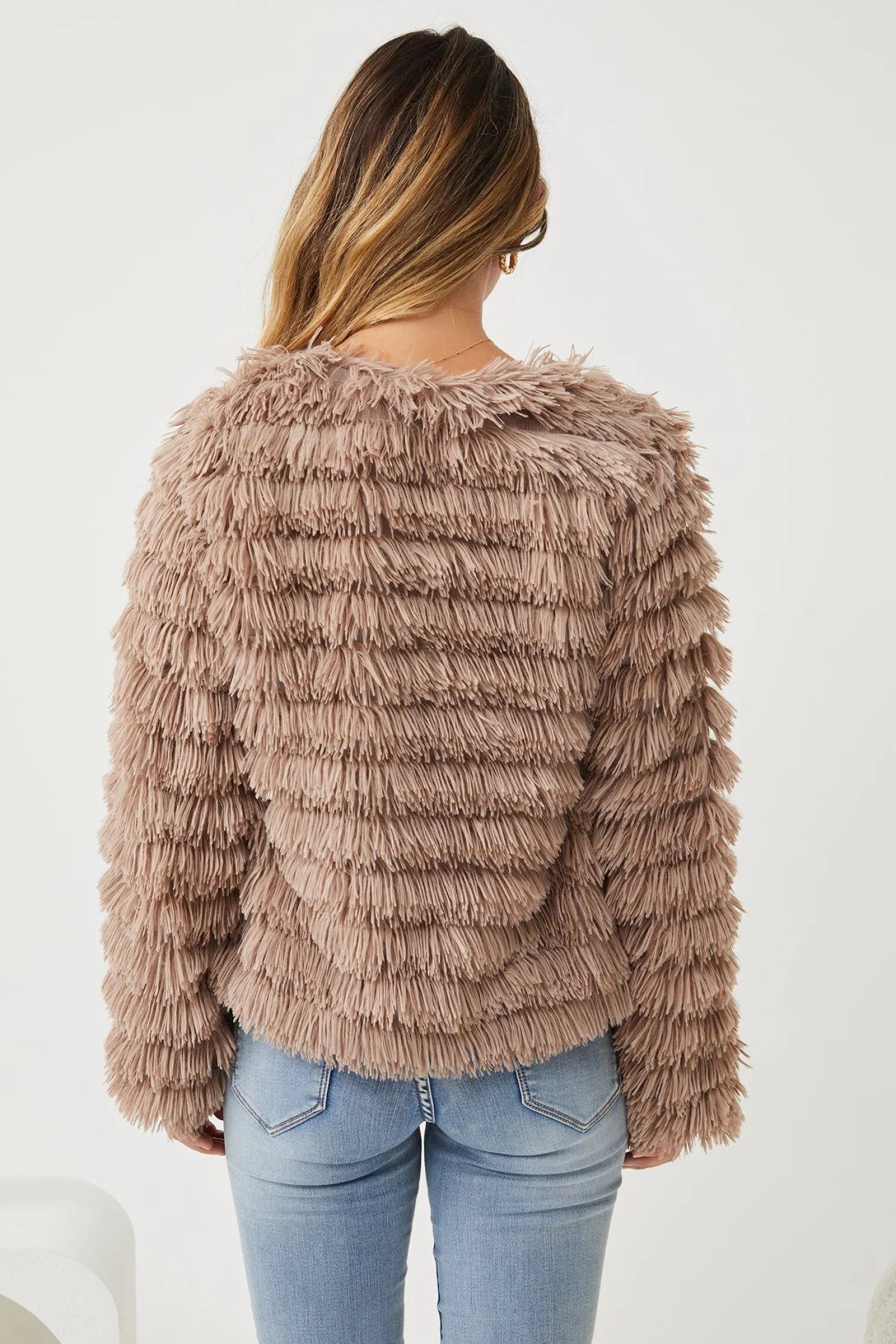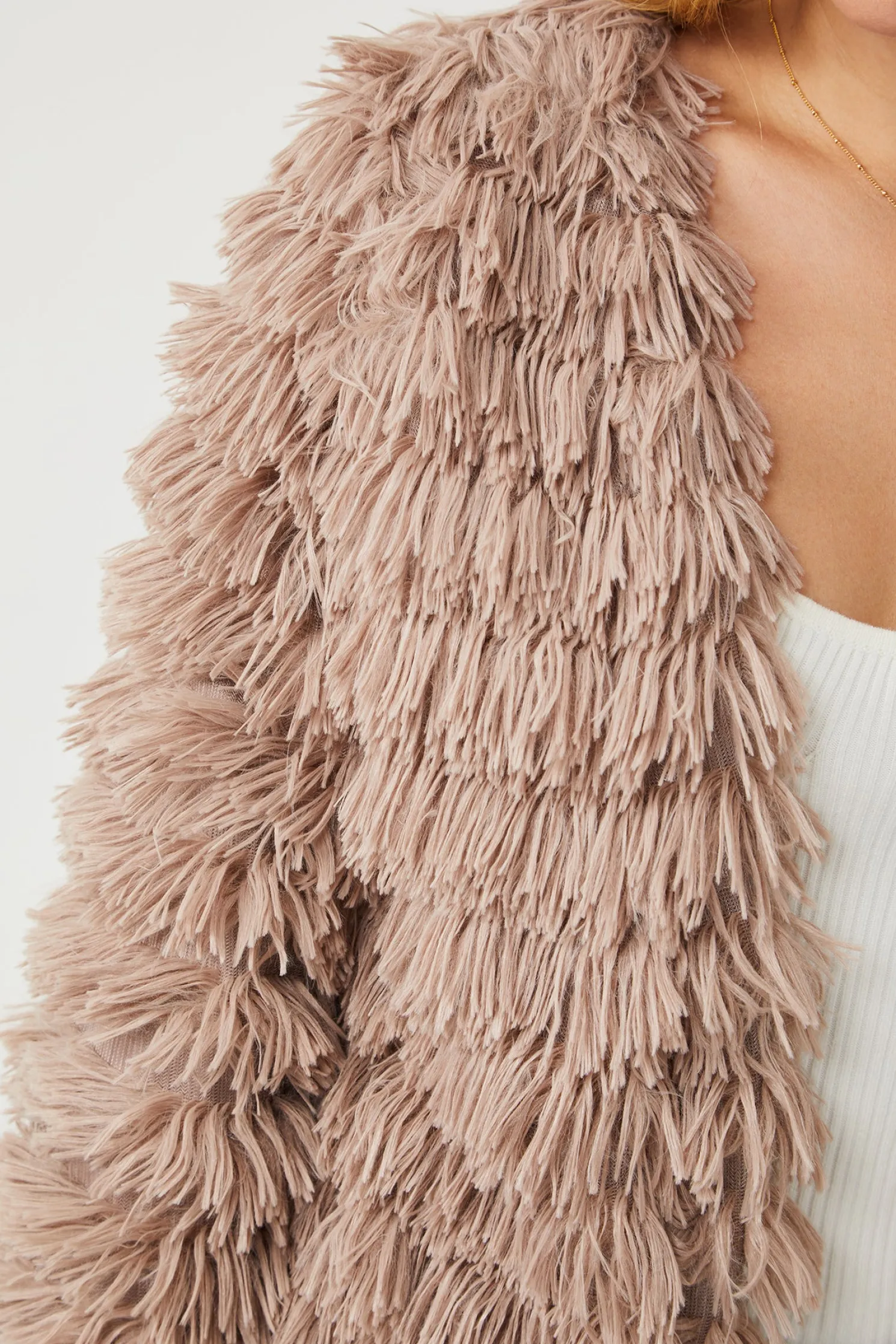 Our Ophelle Jacket comes in a mellow mocha colour. Discovering a fabulous and stylish state of mind in this long sleeve fluffy jacket that does its work in both style and function departments. It features an open front to show off your statement inner top!