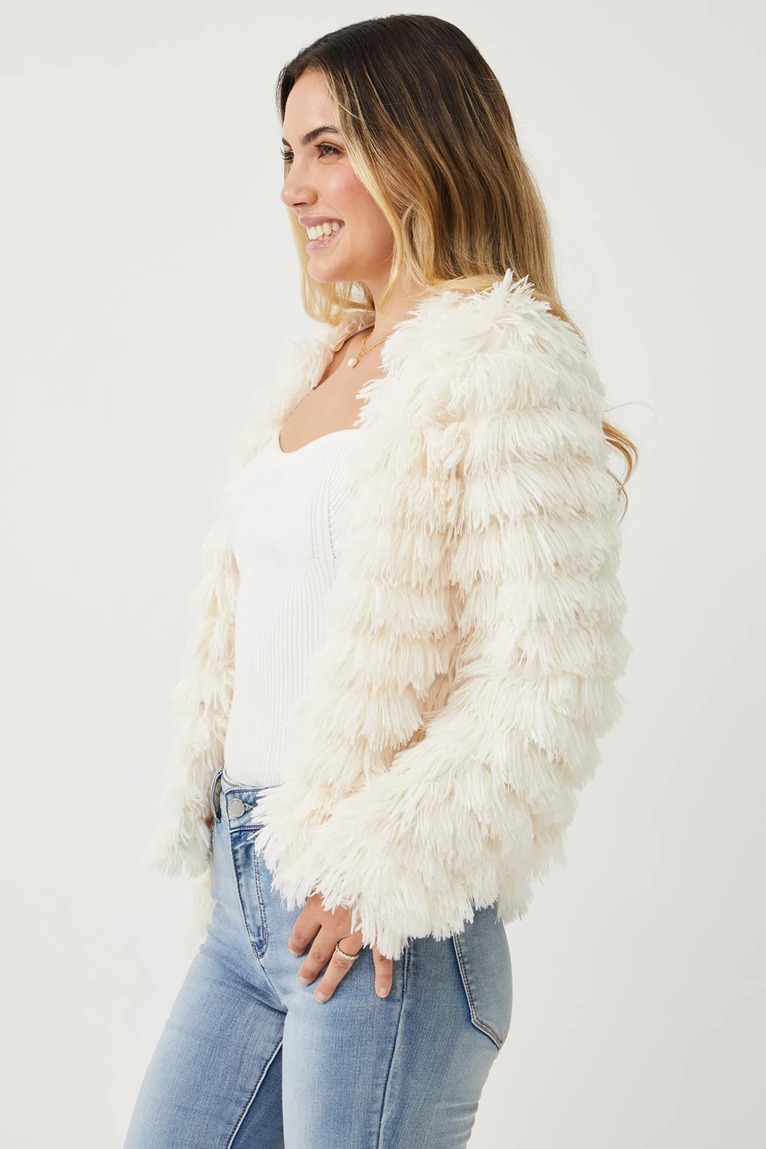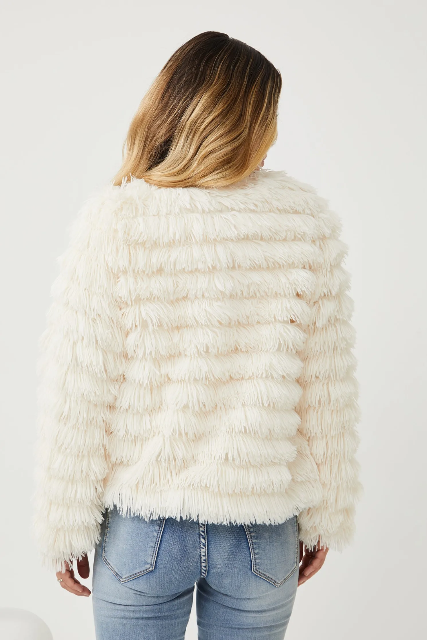 Our Ophelle Jacket comes in a fresh white colour. Discovering a fabulous and stylish state of mind in this long sleeve fluffy jacket that does its work in both style and function departments. It features an open front to show off your statement inner top!