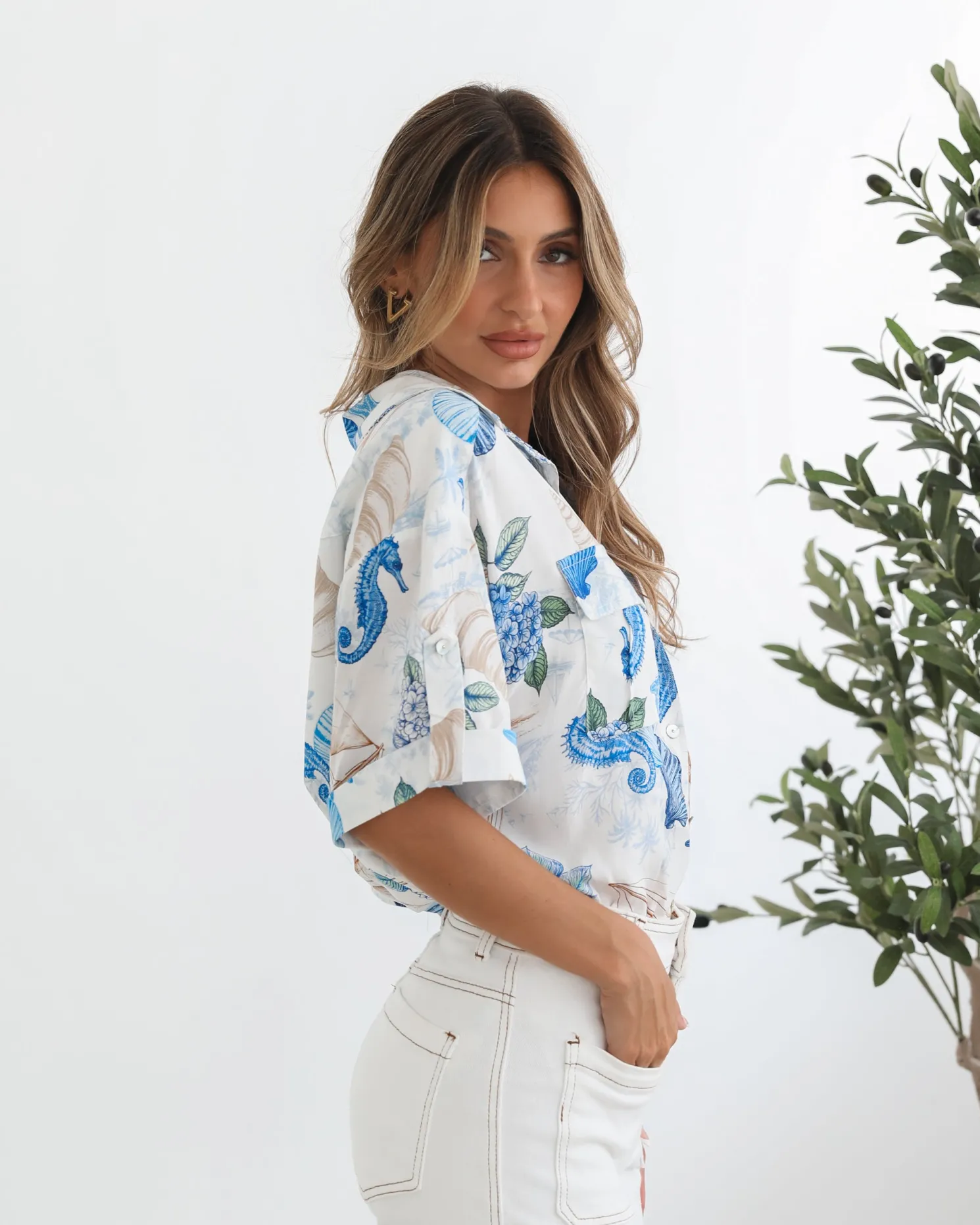 Our Pasheena Shirt comes in a white base with multicoloured prints. Blending classic tailoring with a modern edge, this top features a collar, centre-front buttons, bust pockets and elbow length sleeves. Style it with a pleated midi skirt, ballet flats, and pearl accessories for a soft, elegant ensemble!
